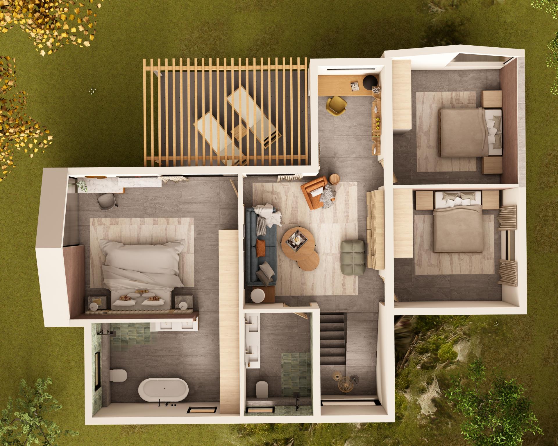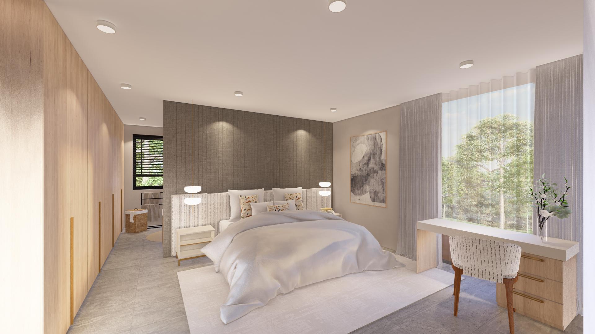 The showcased house plan features an elegant double-story design, offering four spacious bedrooms. The upstairs layout includes three bedrooms, with the master suite feauturing custom windows that allow abundant natural light to fill the space, generous cupboard space, which stretches along one wall, and seamlessly flows into the luxurious main en-suite bathroom. Additionally, the upper level offers a comfortable pajama lounge and a convenient study nook, perfect for relaxation or work.