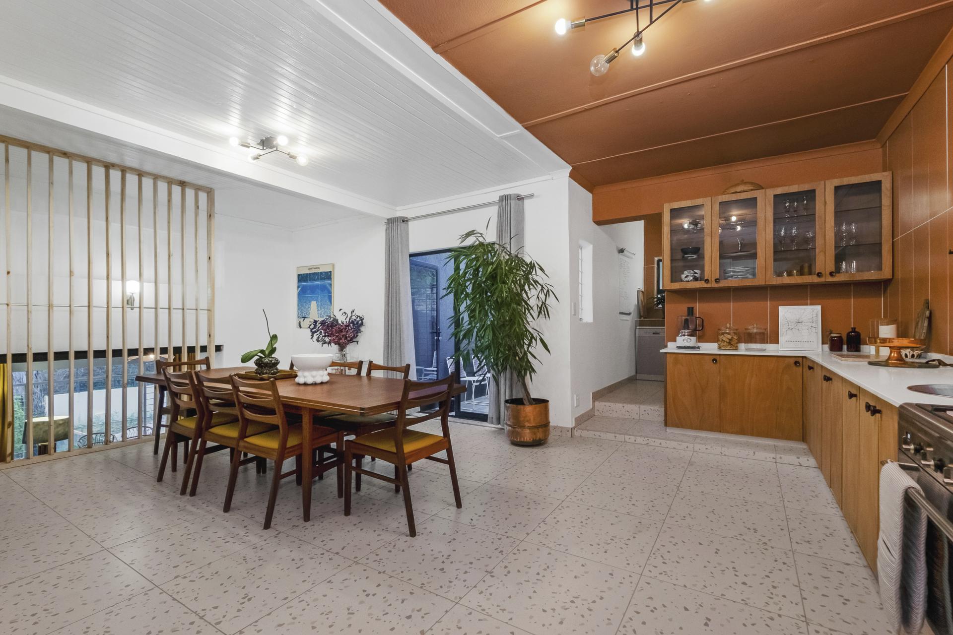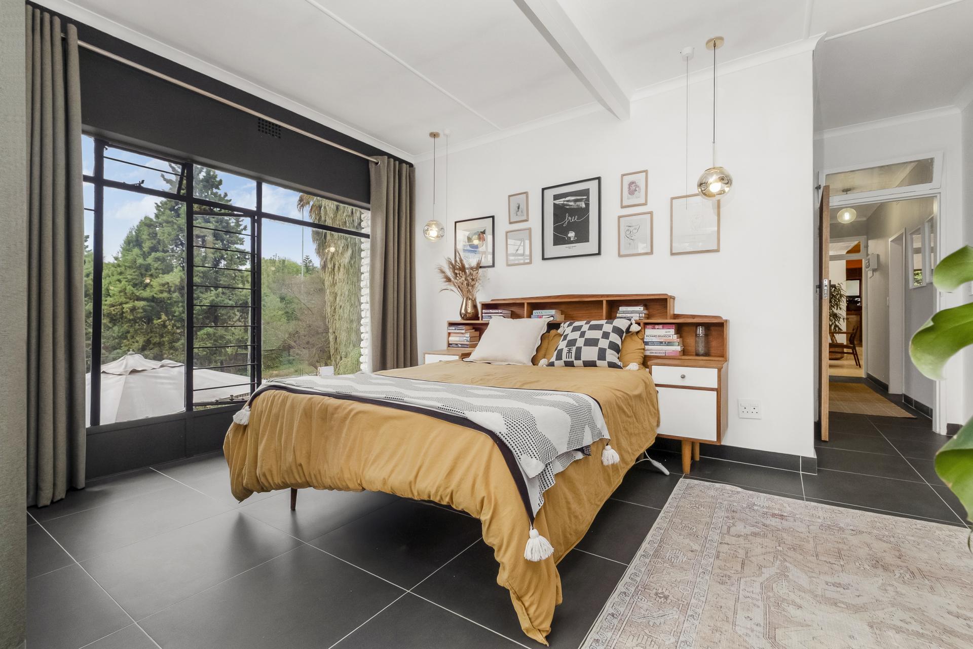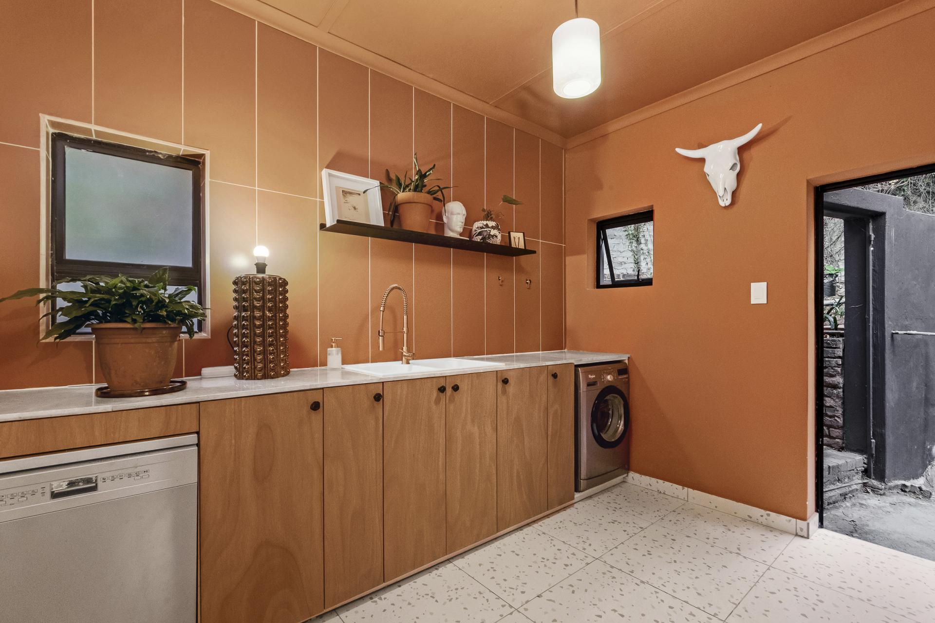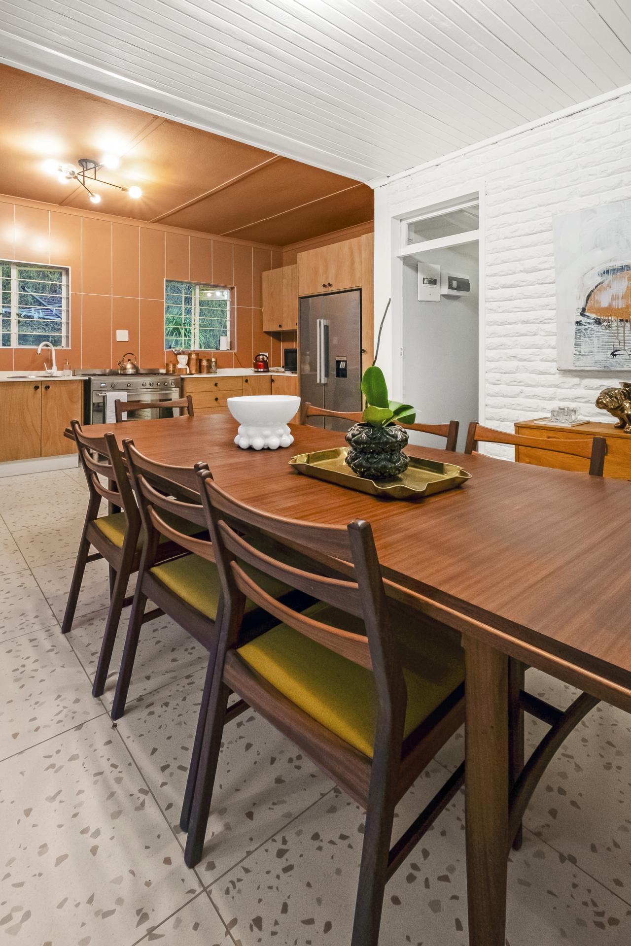 The style is a modernist 1920 exterior that’s complemented by the mid-Century modern interior. The premium tiles used liberally throughout the home blend nostalgia, practicality, and functionality. The handmade tiles at the interior is specifically crafted at the Sellers’ Robertson farm, and is a prime example of the attention to detail poured into every square inch of the home. Some of the original features have been retained and pay homage to the original structure built in the 60's, like the white painted face brick tiles. The kitchen and bathroom cabinets are made from Saligna wood with a bespoke stain developed by the Sellers to give the wood in this home a bespoke feel, with Caesarstone tops throughout the house. The pool area is an entertainment beacon and is the ideal vantage point from where to savour the generous stand and ‘forest feel’ of the garden.