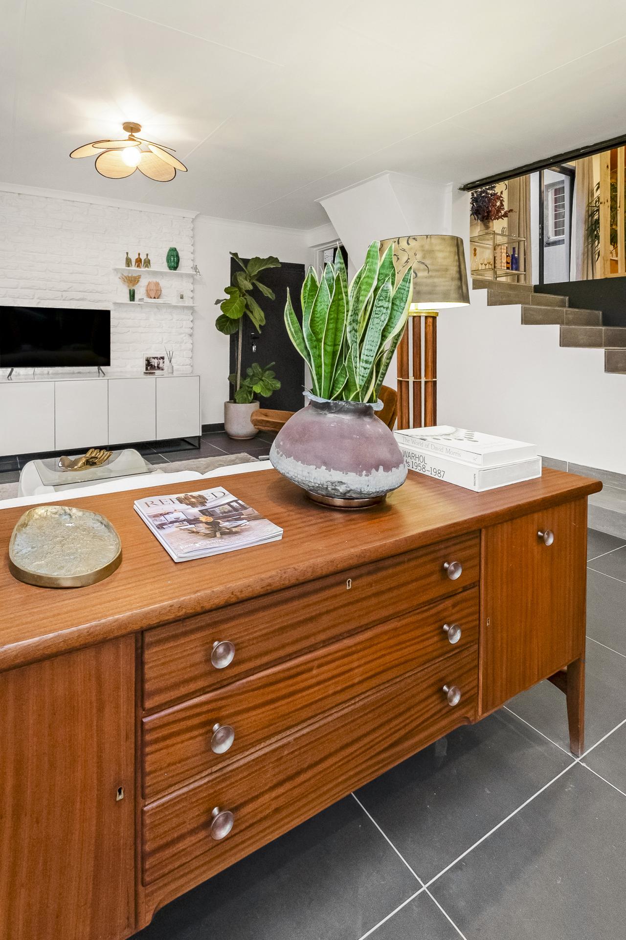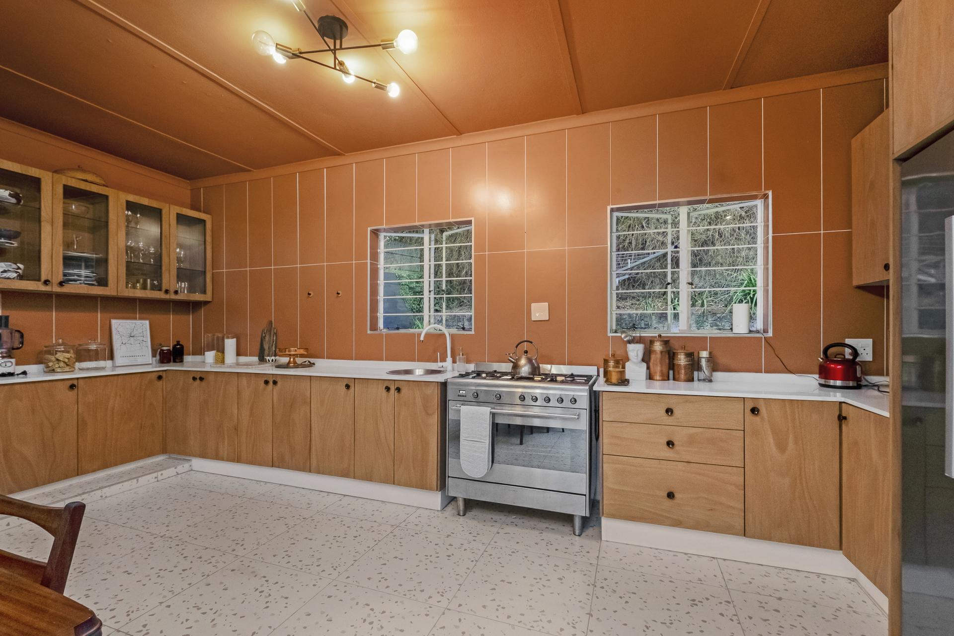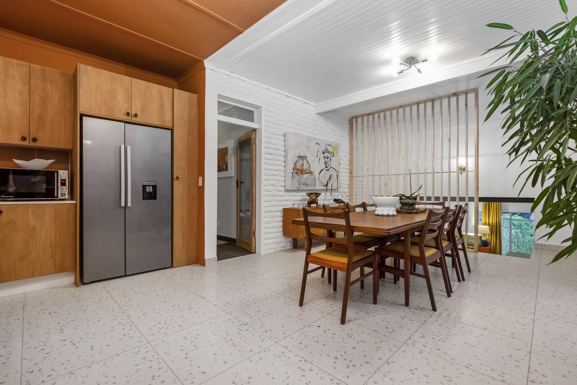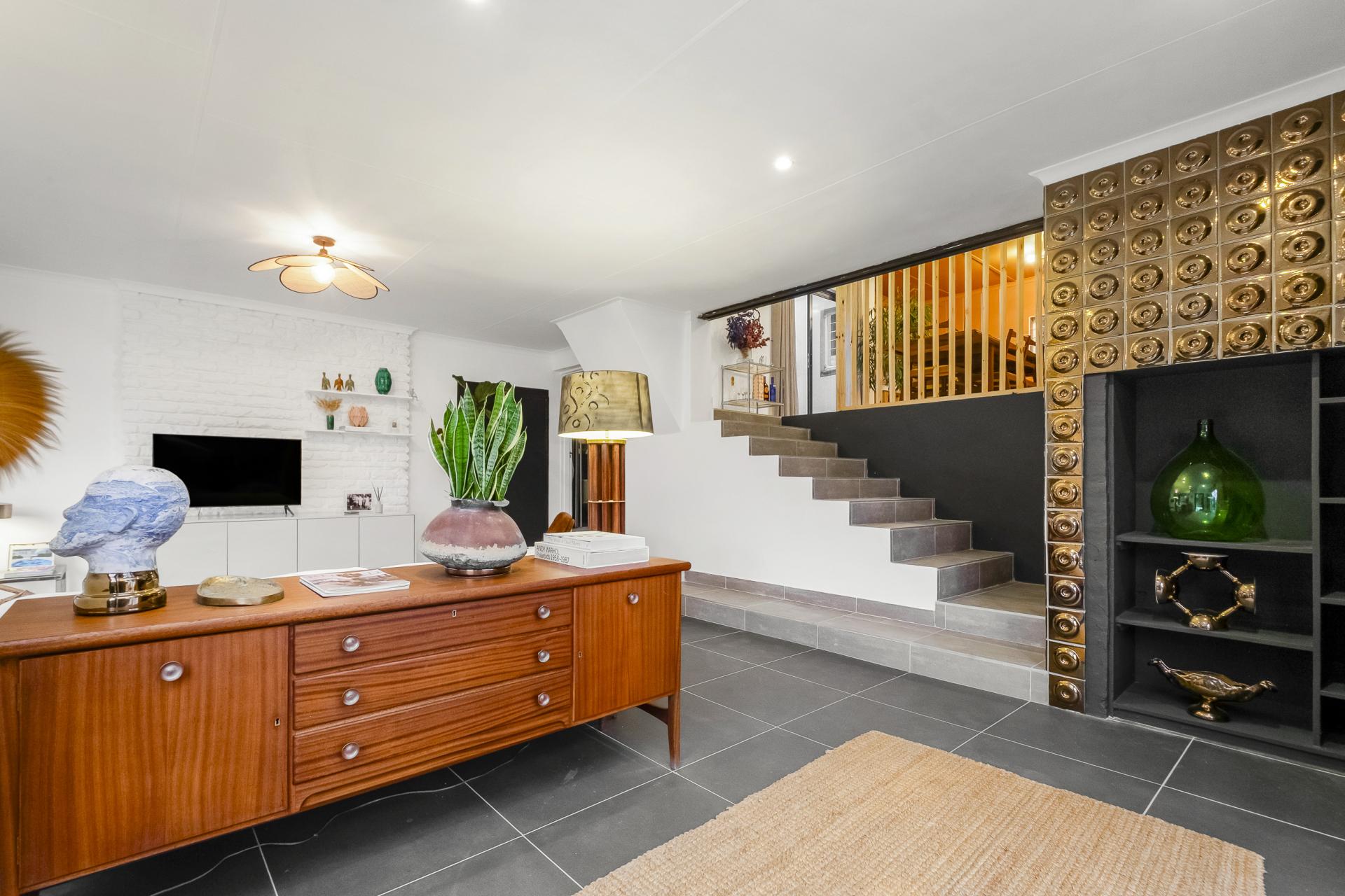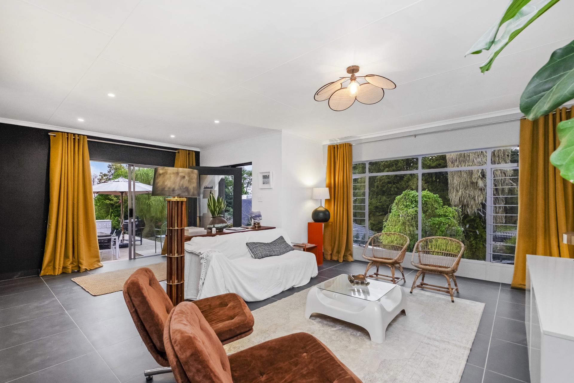 The style is a modernist 1920 exterior that’s complemented by the mid-Century modern interior. The premium tiles used liberally throughout the home blend nostalgia, practicality, and functionality. The handmade tiles at the interior is specifically crafted at the Sellers’ Robertson farm, and is a prime example of the attention to detail poured into every square inch of the home. Some of the original features have been retained and pay homage to the original structure built in the 60's, like the white painted face brick tiles. The kitchen and bathroom cabinets are made from Saligna wood with a bespoke stain developed by the Sellers to give the wood in this home a bespoke feel, with Caesarstone tops throughout the house. The pool area is an entertainment beacon and is the ideal vantage point from where to savour the generous stand and ‘forest feel’ of the garden.