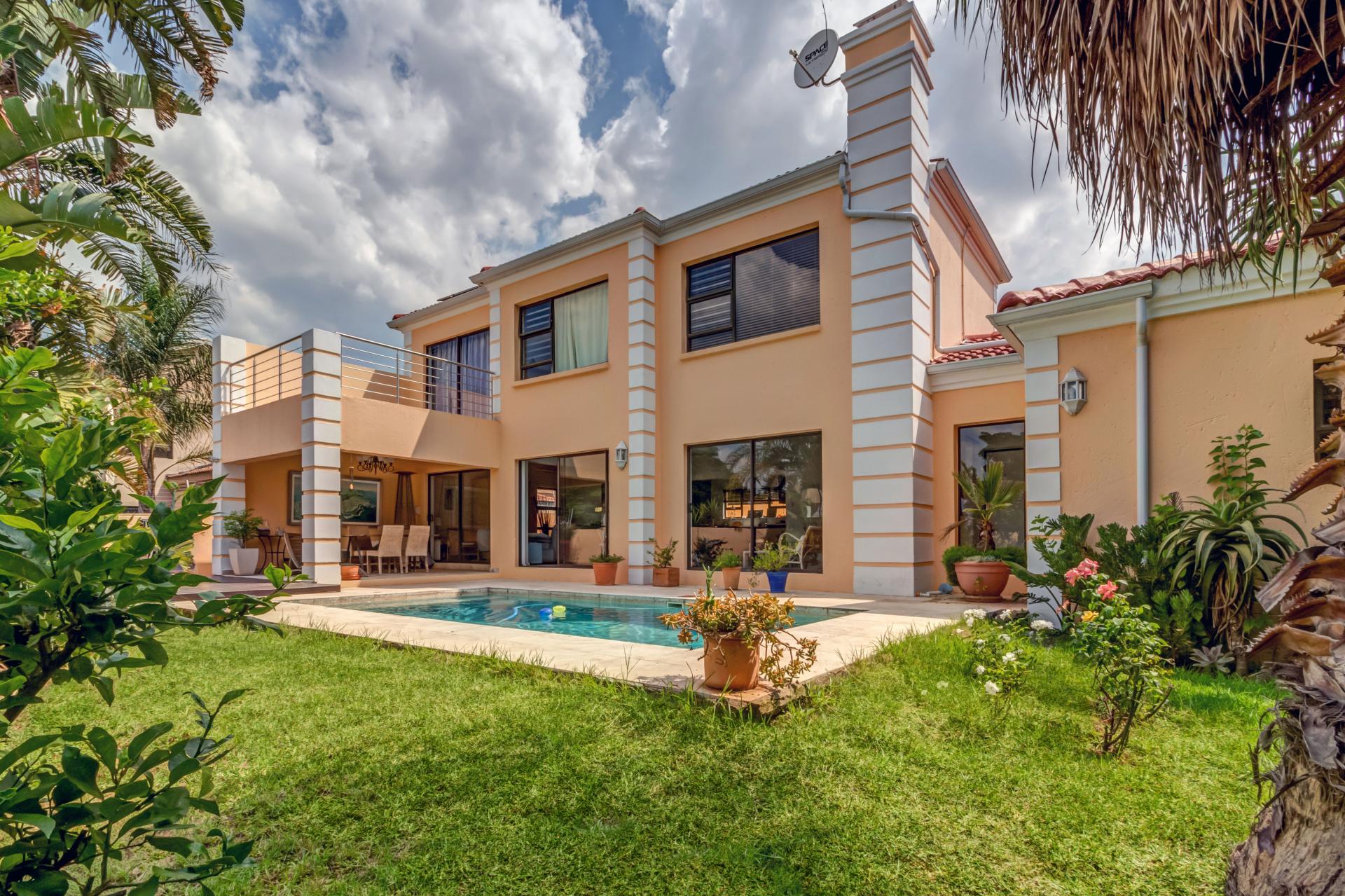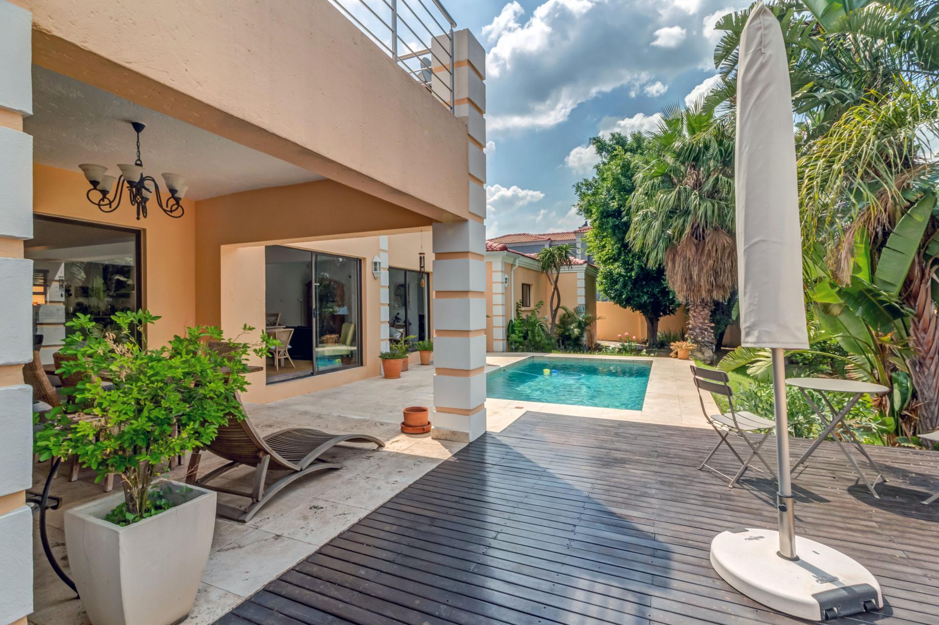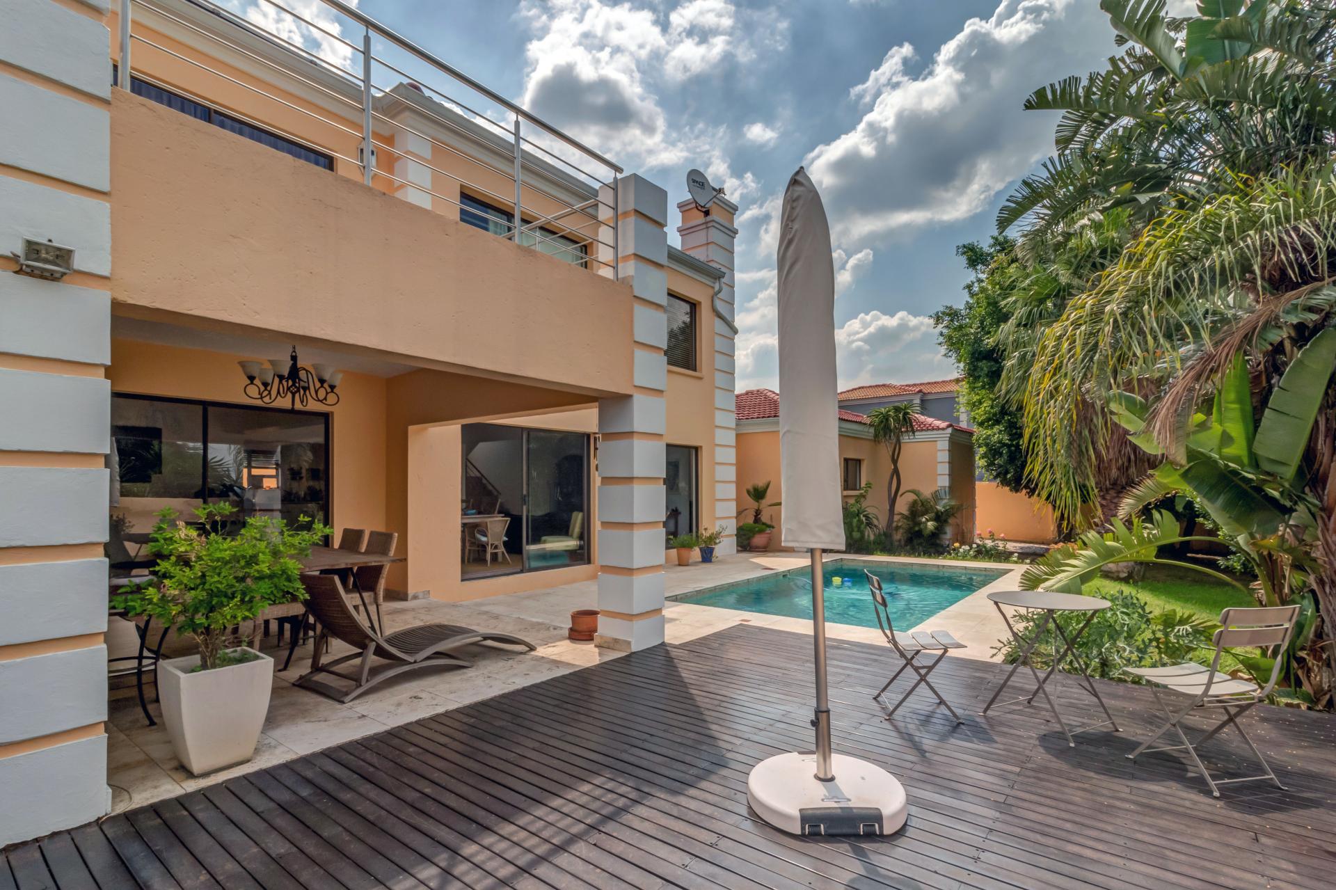 A lovely modern, spacious, and light property with an expansive garden is available, sparking pool and entertainment area is available in a superb estate. The property is situated in popular San Henrique Estate in Broadacres and offers 3 bedrooms, 3 bathrooms and a self-contained flatlet with its own entrance. As one enters from the front door you are greeted with a modern, tiled, open plan lounge and dining room area with a second / formal lounge complete with a wood burning fireplace and aluminium sliding doors all round and an easy flow into the modern granite top kitchen. The kitchen has a gas stove, ample cupboard space, and an additional space ideal for a laundry with undercounter space for 3 appliances. Outside you are welcomed by a sparkling swimming pool, undercover patio and deck area making entertaining and living indoors and outdoors a breeze. Upstairs are 3 spacious bedrooms, all with built in cupboards and the main bedroom boasts a full en-suite with double vanity and a private balcony with a guest bathroom for the other 2 bedrooms to share. This home has many extras including a double automated garage, additional driveway parking, a self-contained flatlet with a private courtyard and a solar / inverter system to cater for the entire home.