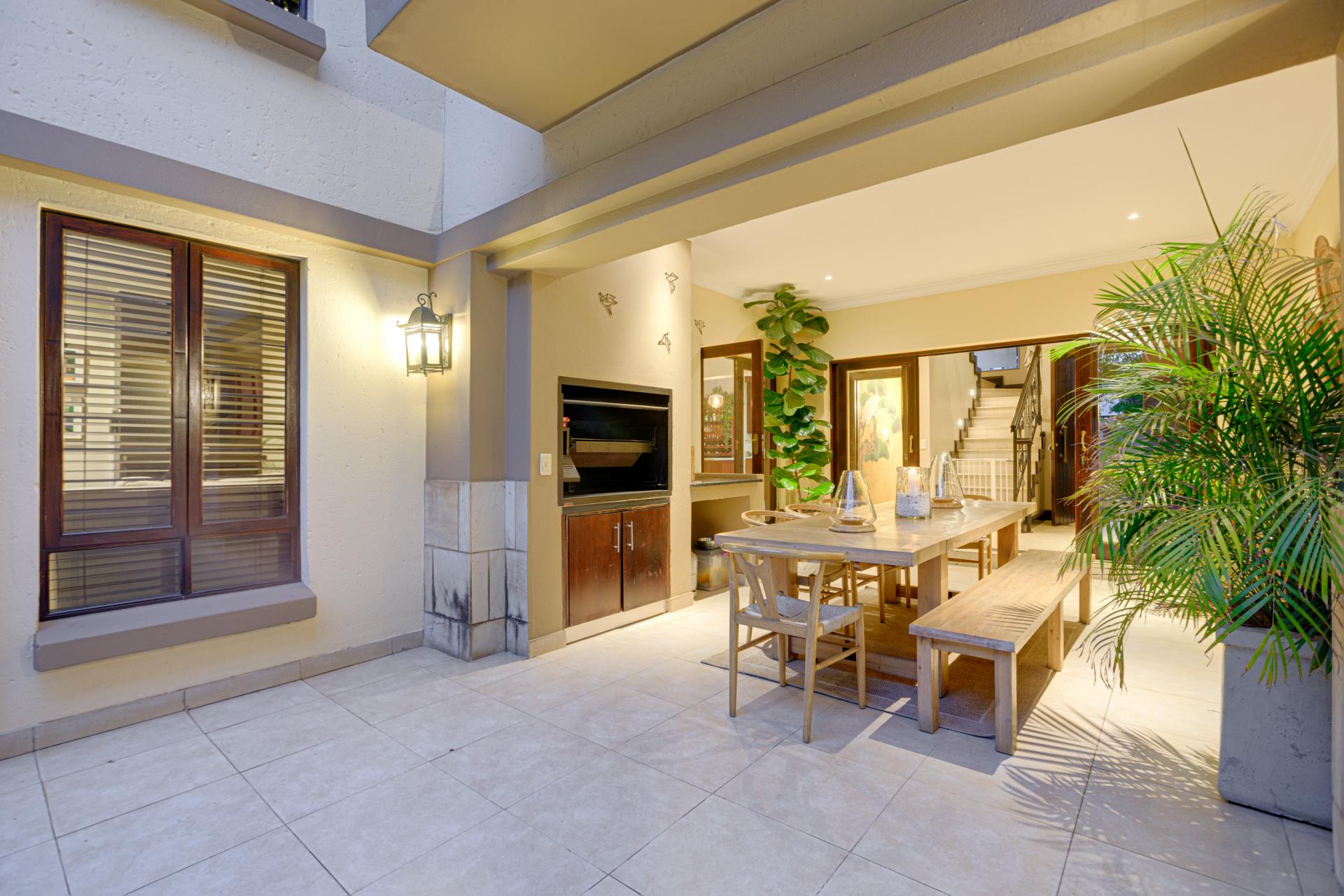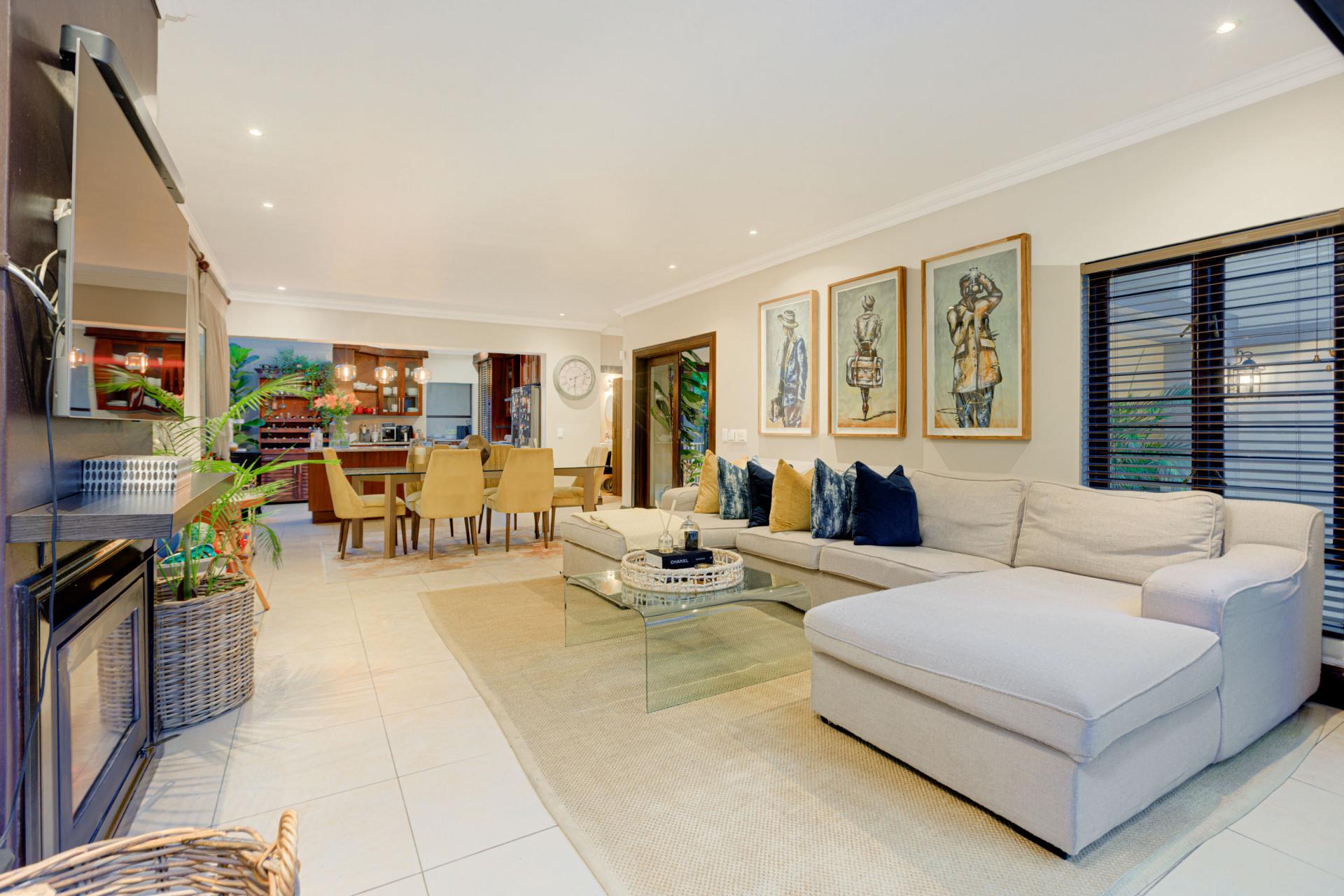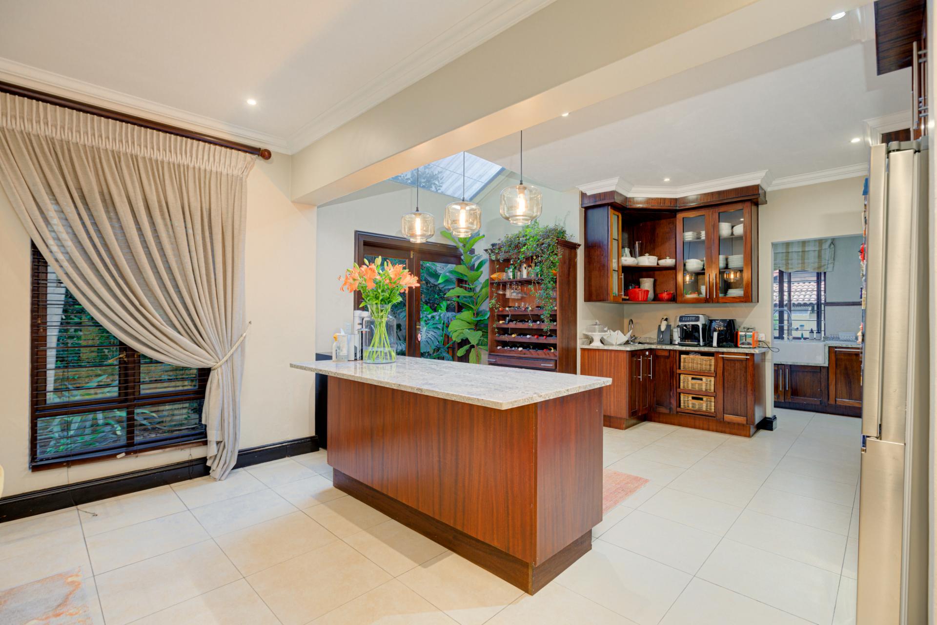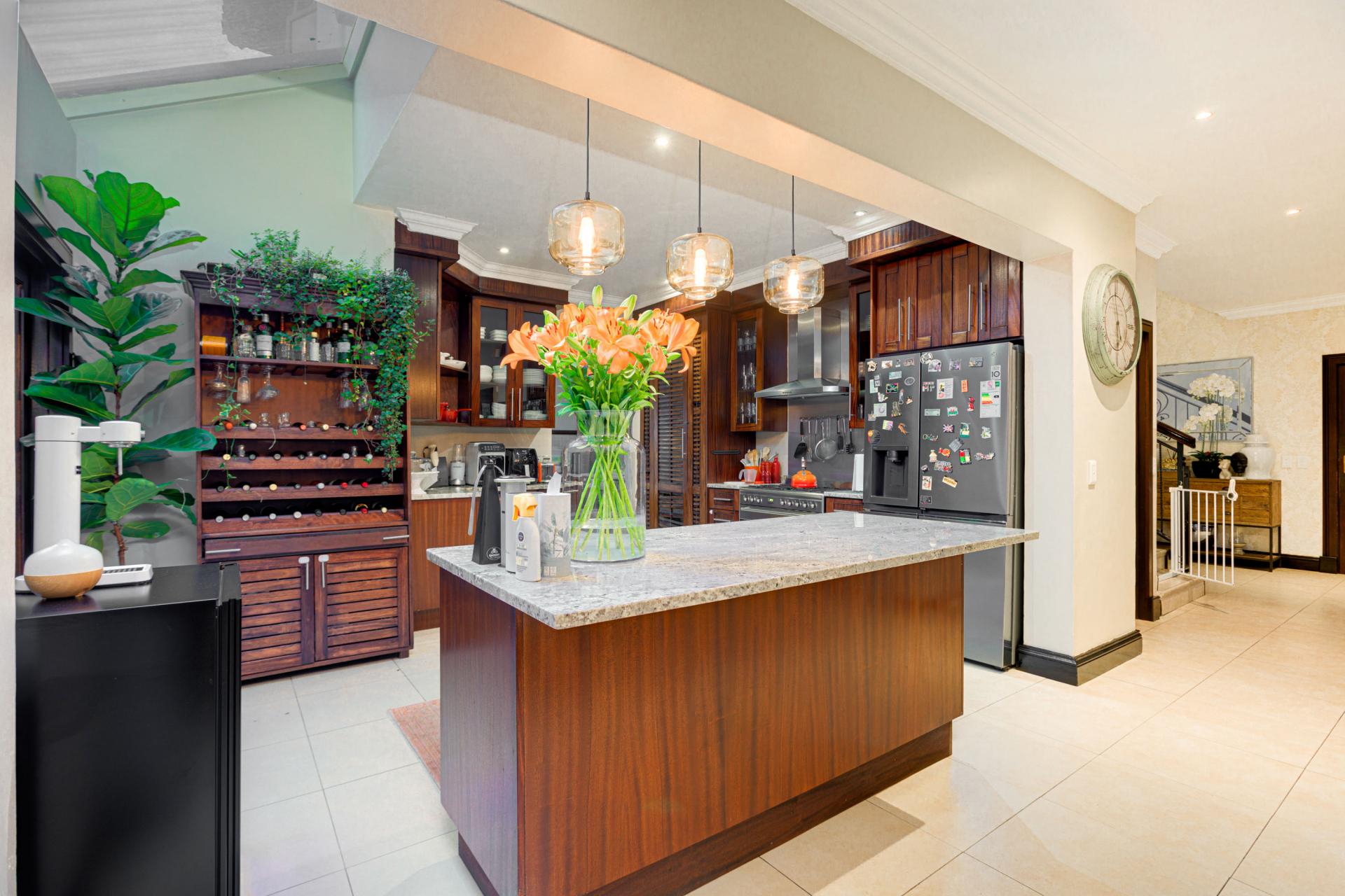 Offering double door/double volume entrance hall, flowing to the large living areas, including lounge/dining areas and open plan kitchen. The lounge is spacious with a wood burning fireplace and opens to the patio, inviting pool and private garden. The kitchen is modern, with ample cupboard space and has a separate scullery with place for all 3 appliances, and opens to the courtyard.