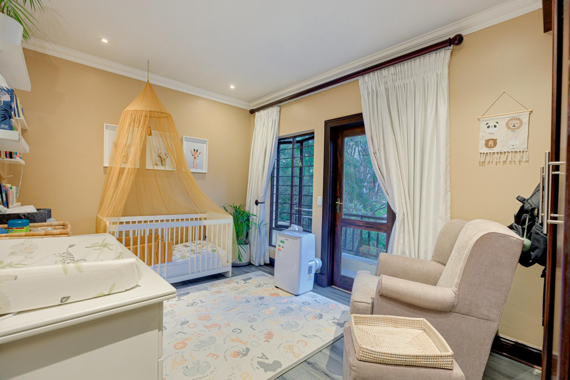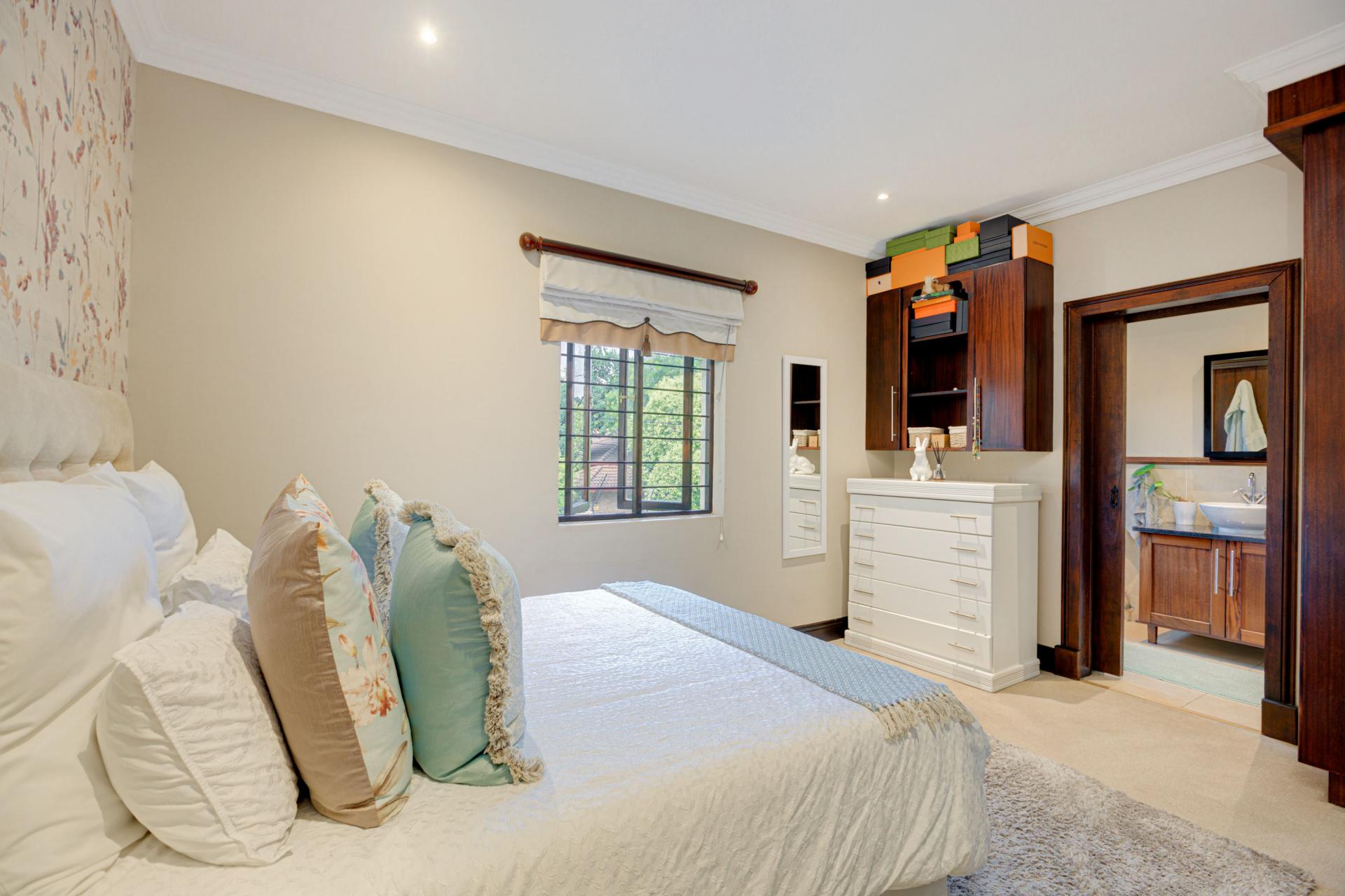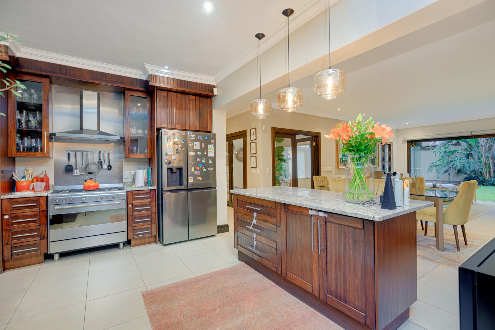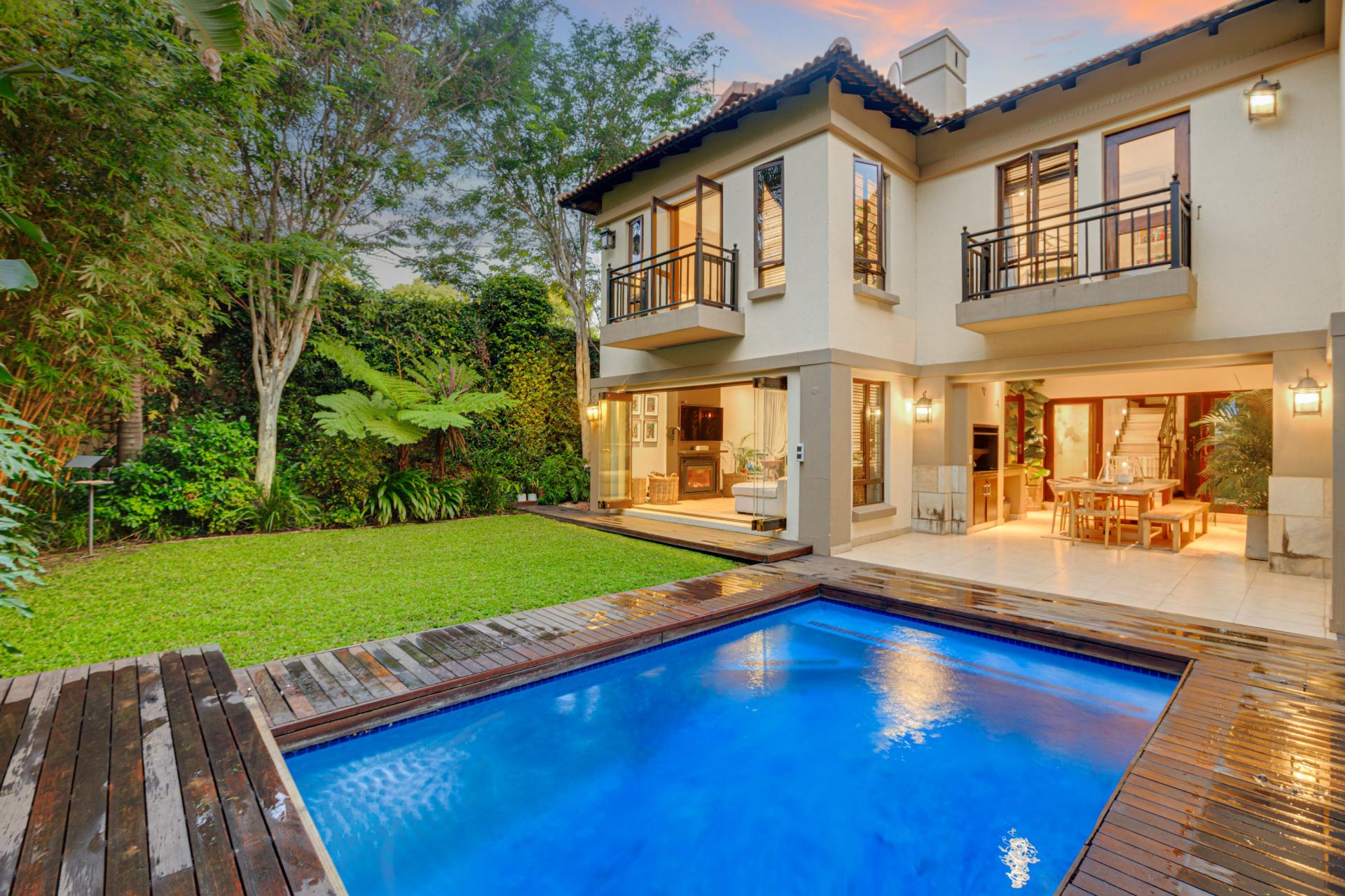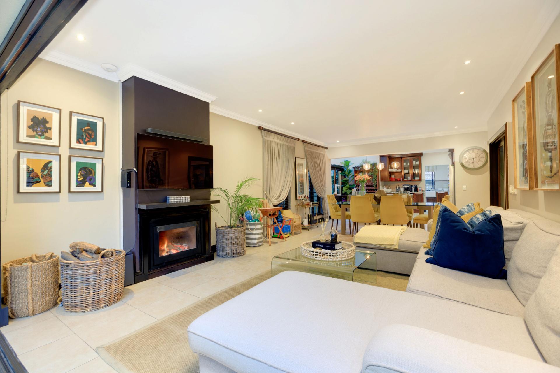 Offering double door/double volume entrance hall, flowing to the large living areas, including lounge/dining areas and open plan kitchen. The lounge is spacious with a wood burning fireplace and opens to the patio, inviting pool and private garden. The kitchen is modern, with ample cupboard space and has a separate scullery with place for all 3 appliances, and opens to the courtyard.