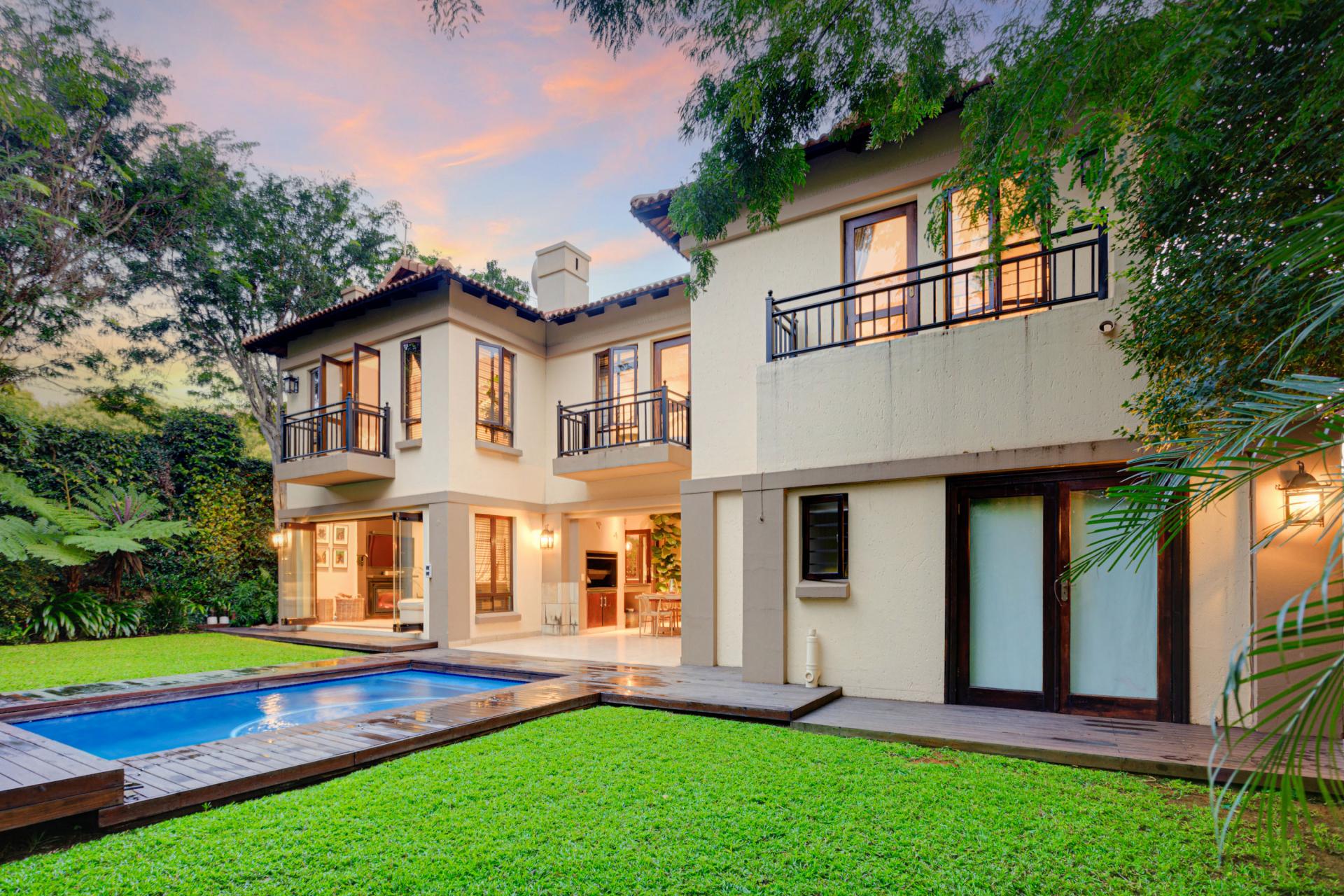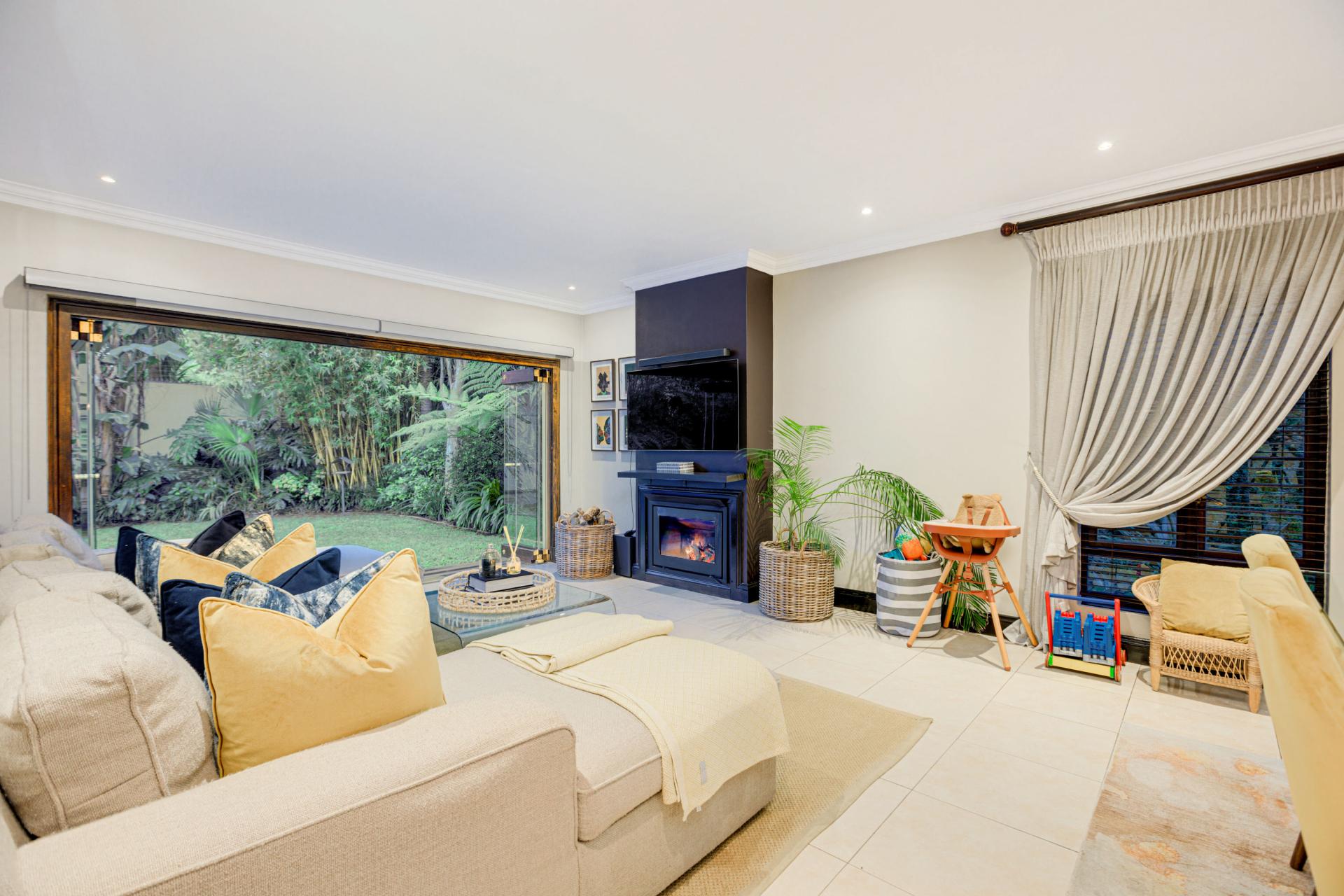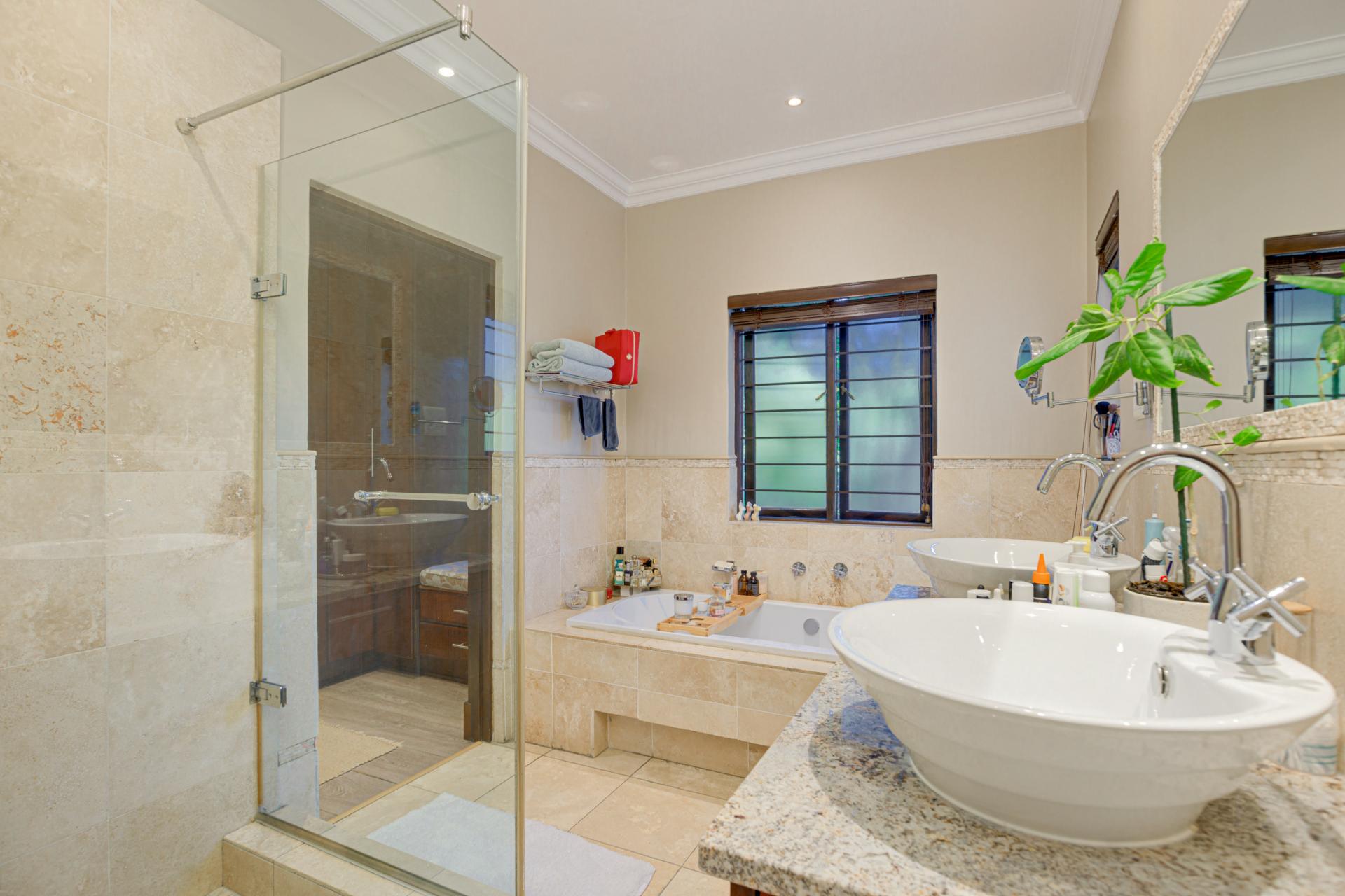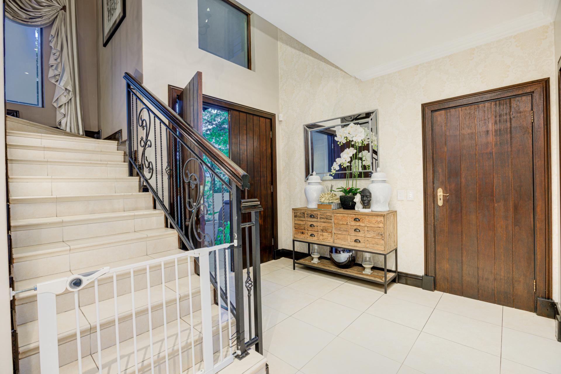 Offering double door/double volume entrance hall, flowing to the large living areas, including lounge/dining areas and open plan kitchen. The lounge is spacious with a wood burning fireplace and opens to the patio, inviting pool and private garden. The kitchen is modern, with ample cupboard space and has a separate scullery with place for all 3 appliances, and opens to the courtyard.