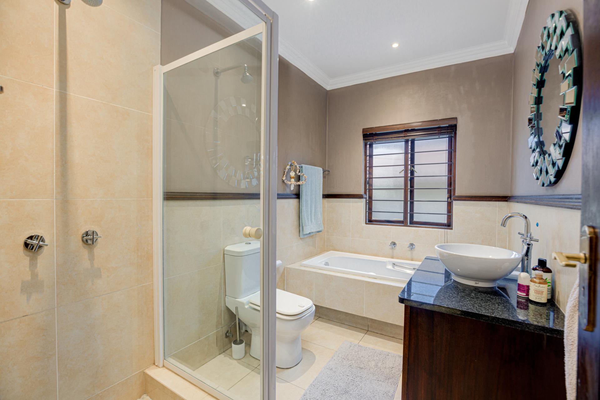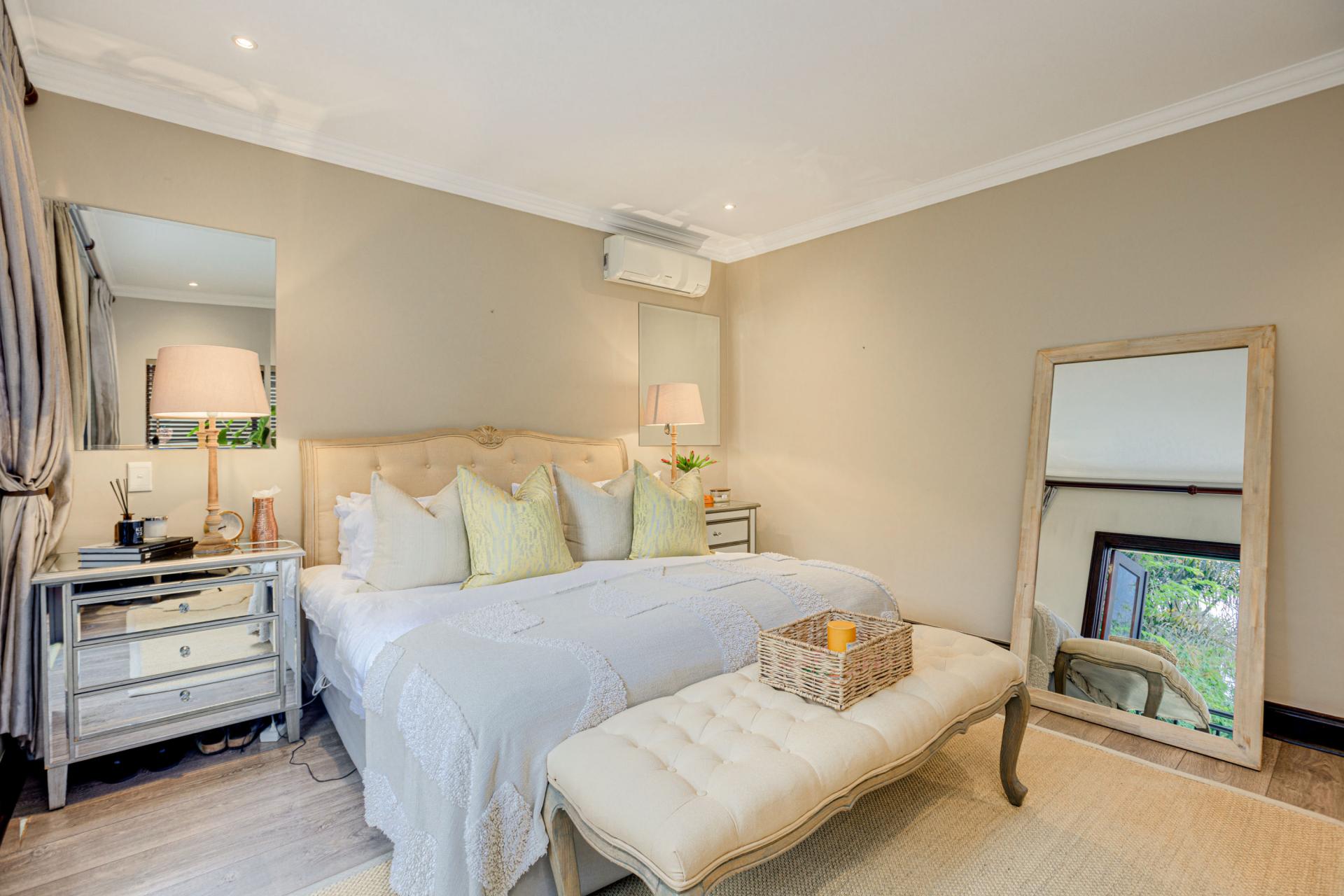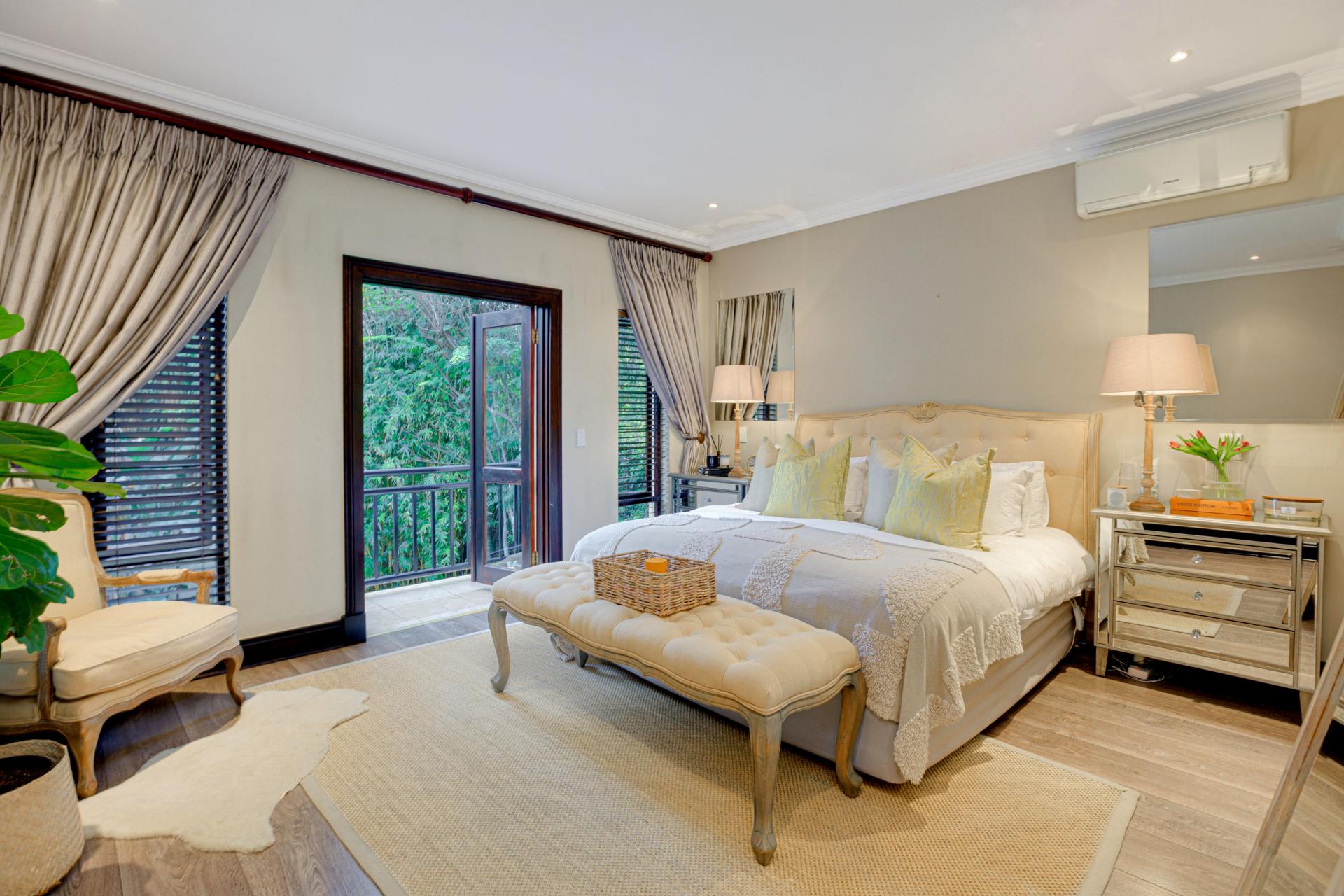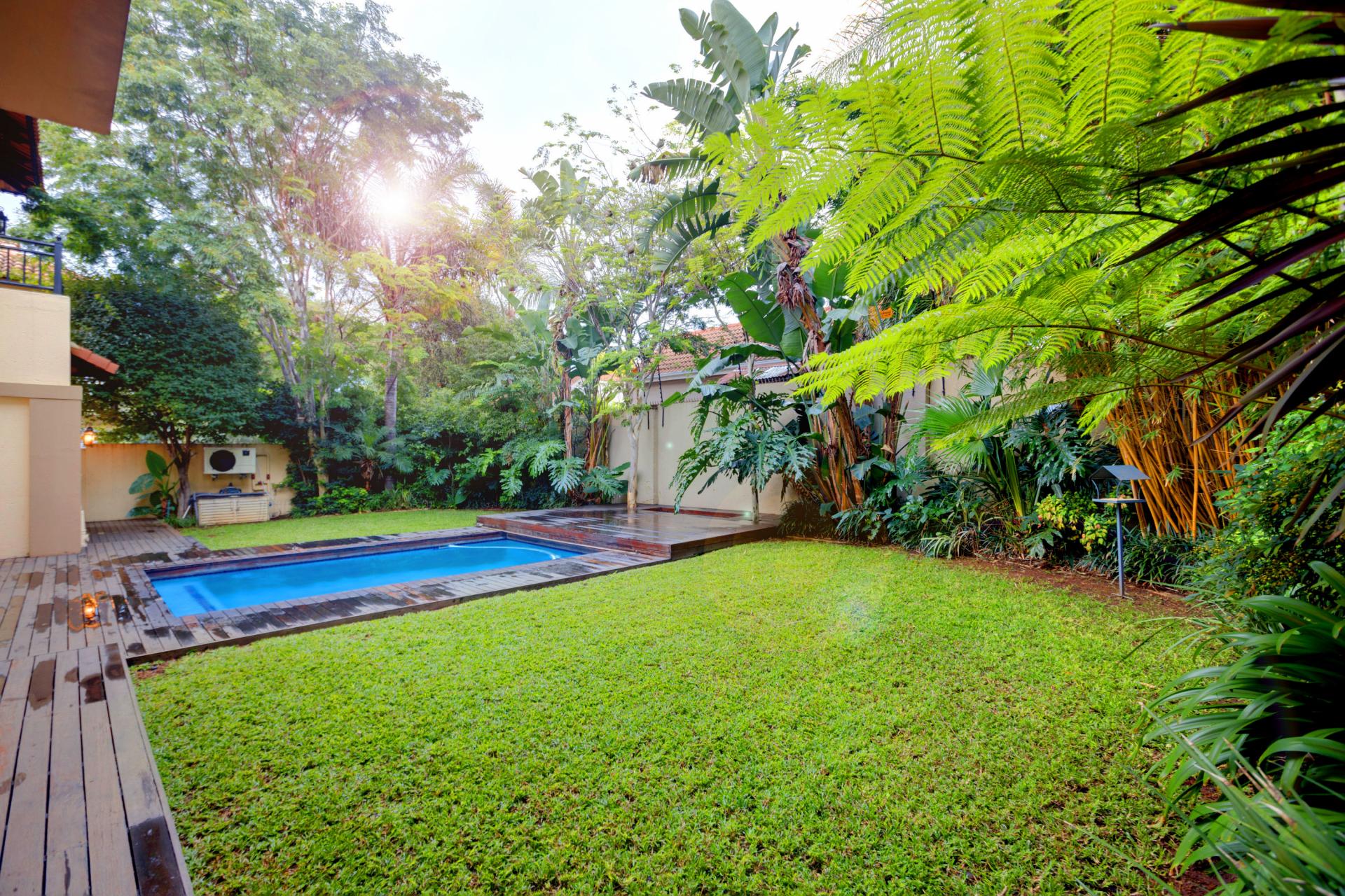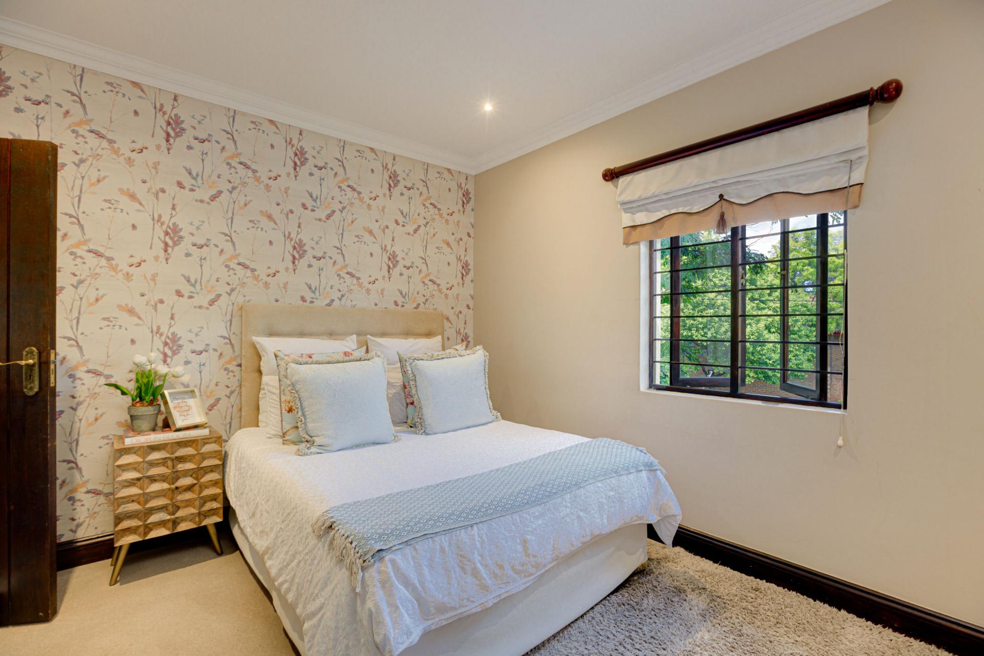 Offering double door/double volume entrance hall, flowing to the large living areas, including lounge/dining areas and open plan kitchen. The lounge is spacious with a wood burning fireplace and opens to the patio, inviting pool and private garden. The kitchen is modern, with ample cupboard space and has a separate scullery with place for all 3 appliances, and opens to the courtyard.