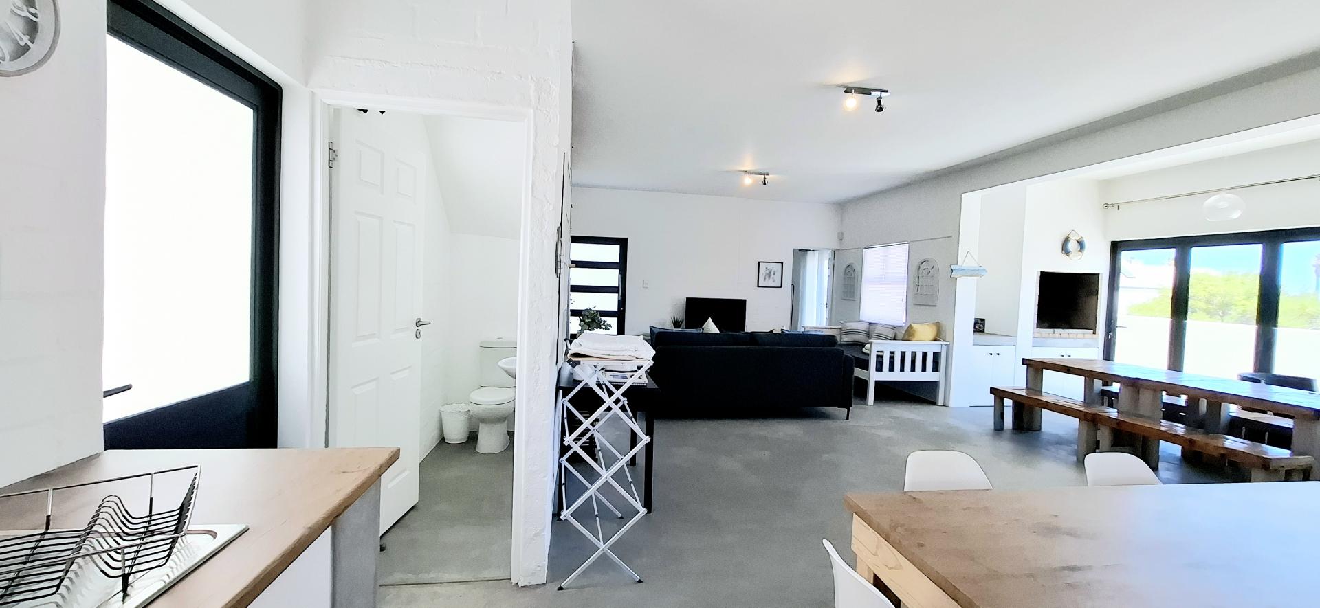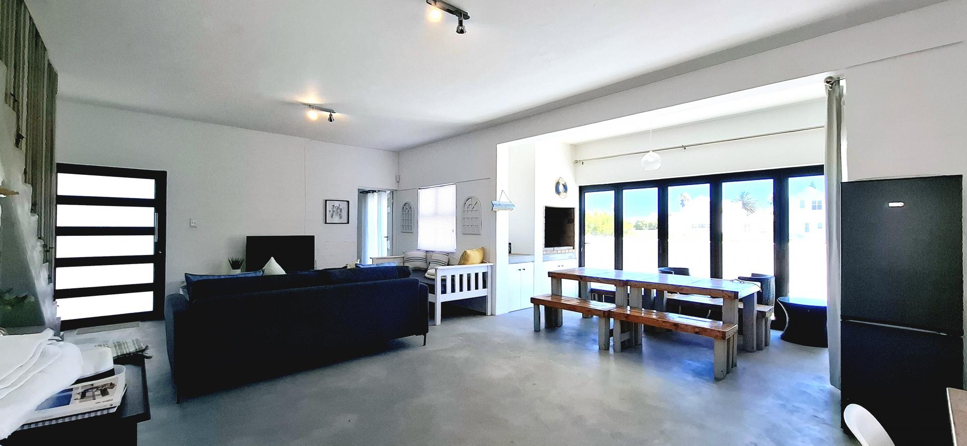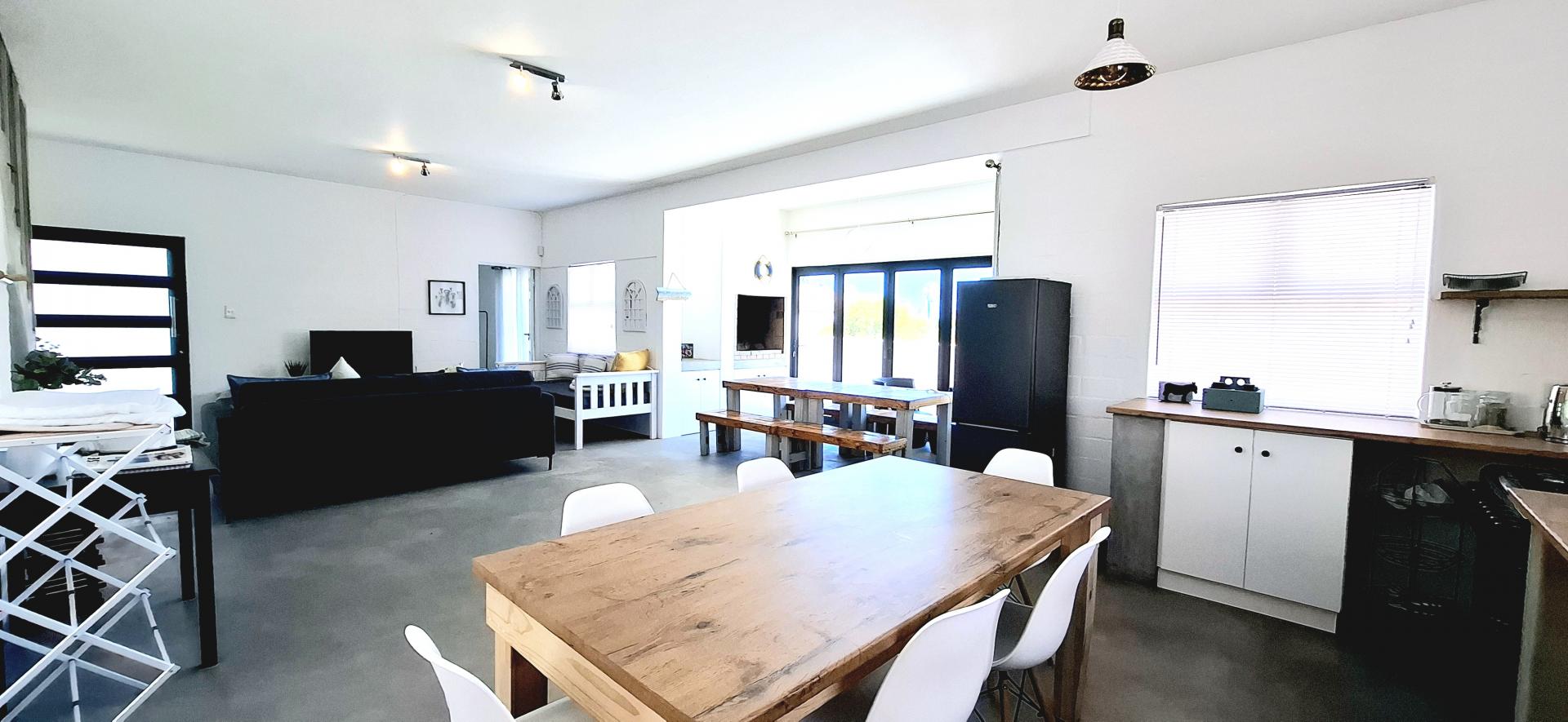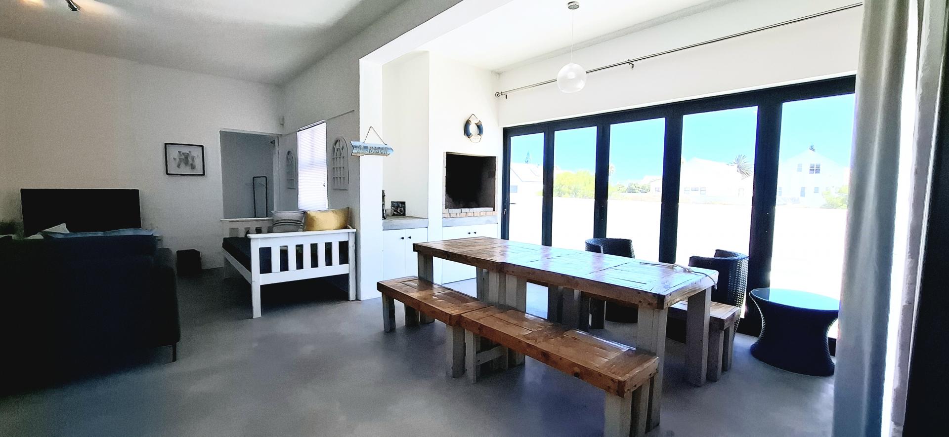 Enter through the elegant glass front door into an expansive living area featuring exposed wooden beams, creating a warm and inviting atmosphere. Adjacent to the living space is a cozy indoor braai area with a large glass window, perfect for entertaining all year round.