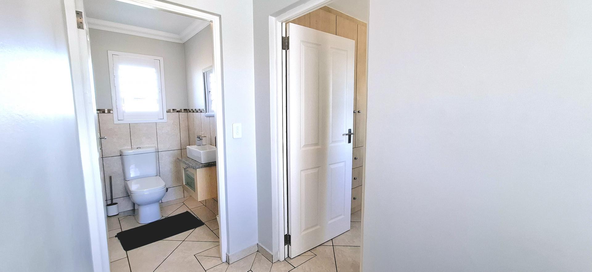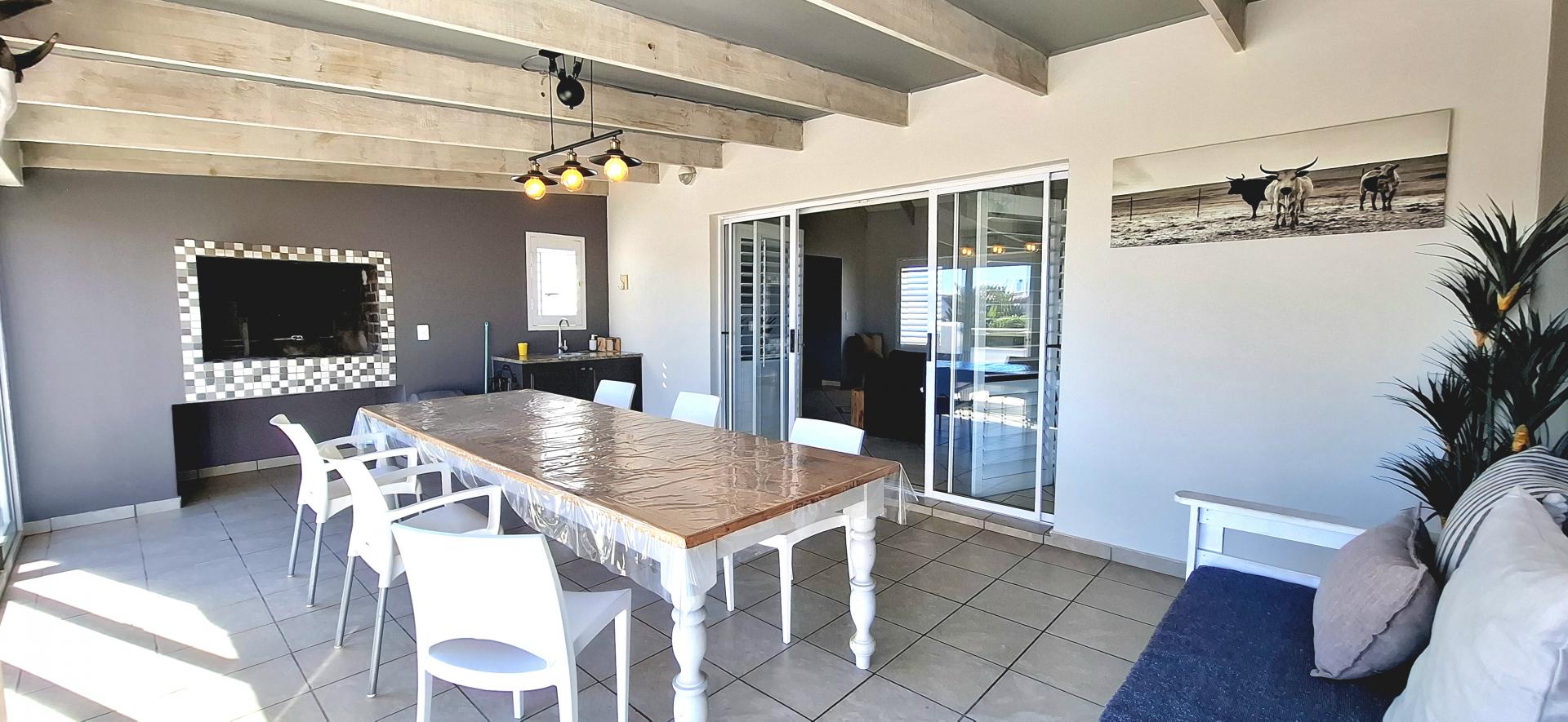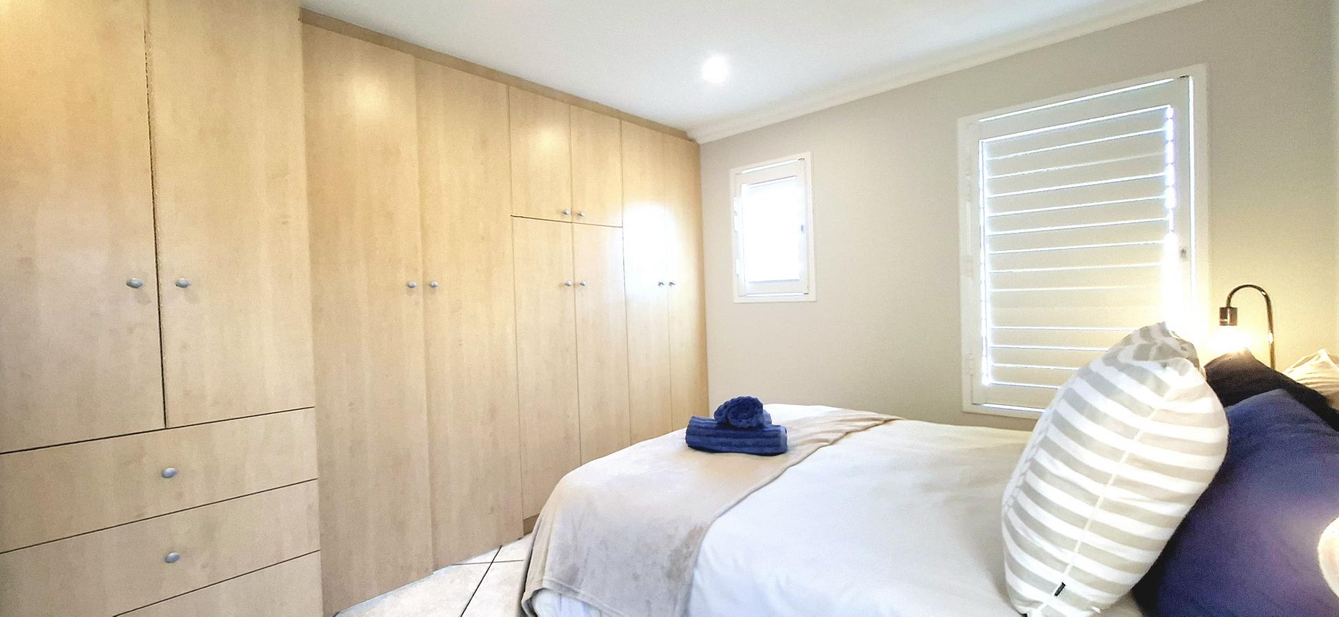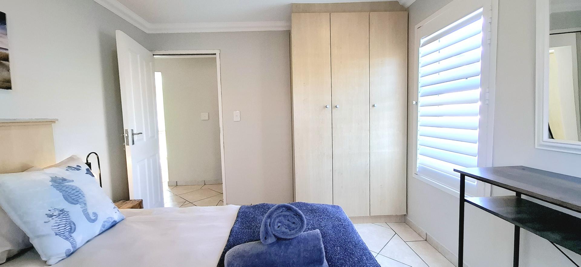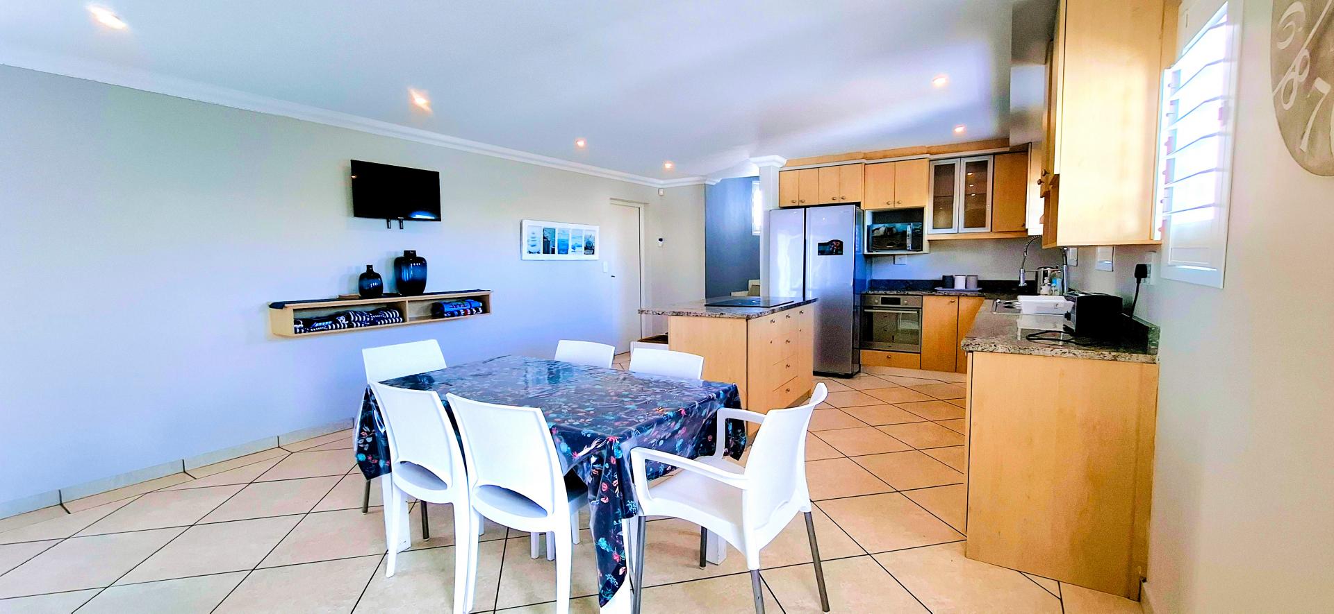 Upstairs, a staircase leads to a bright and airy living area complete with a convenient kitchenette. Large sliding doors open to an enclosed braai room and balcony, where you can enjoy stunning views over Golden Mile and partial sea views. The main bedroom includes built-in cupboards and en-suite, and there is also a guest toilet on this level for added convenience.
