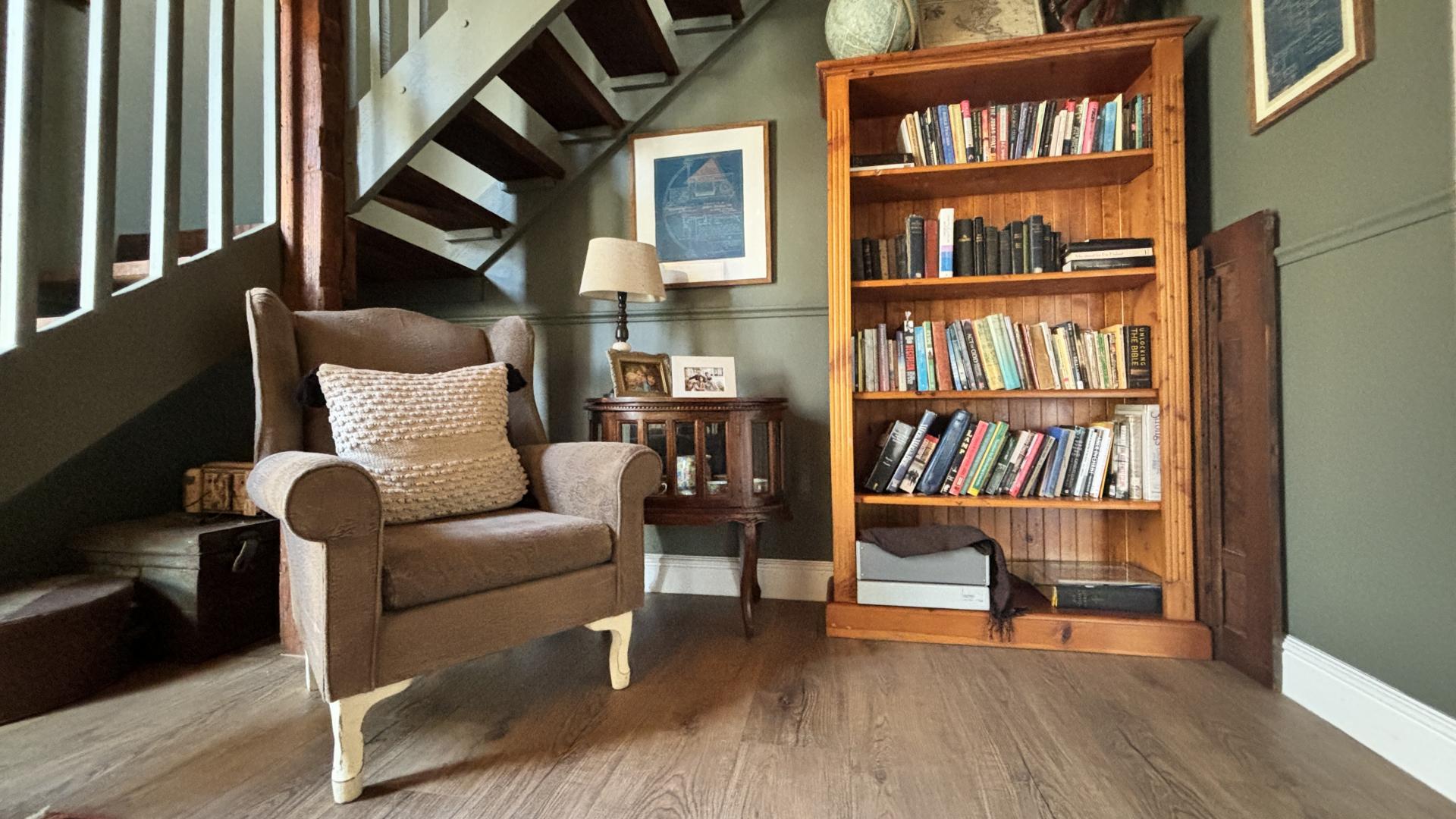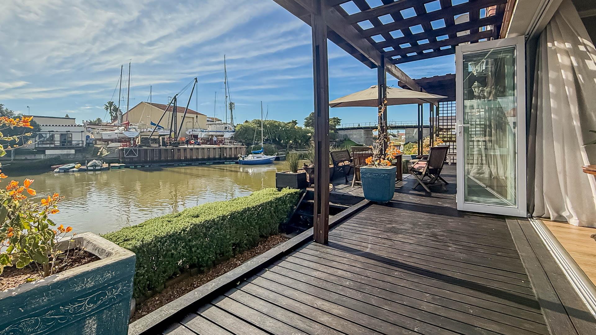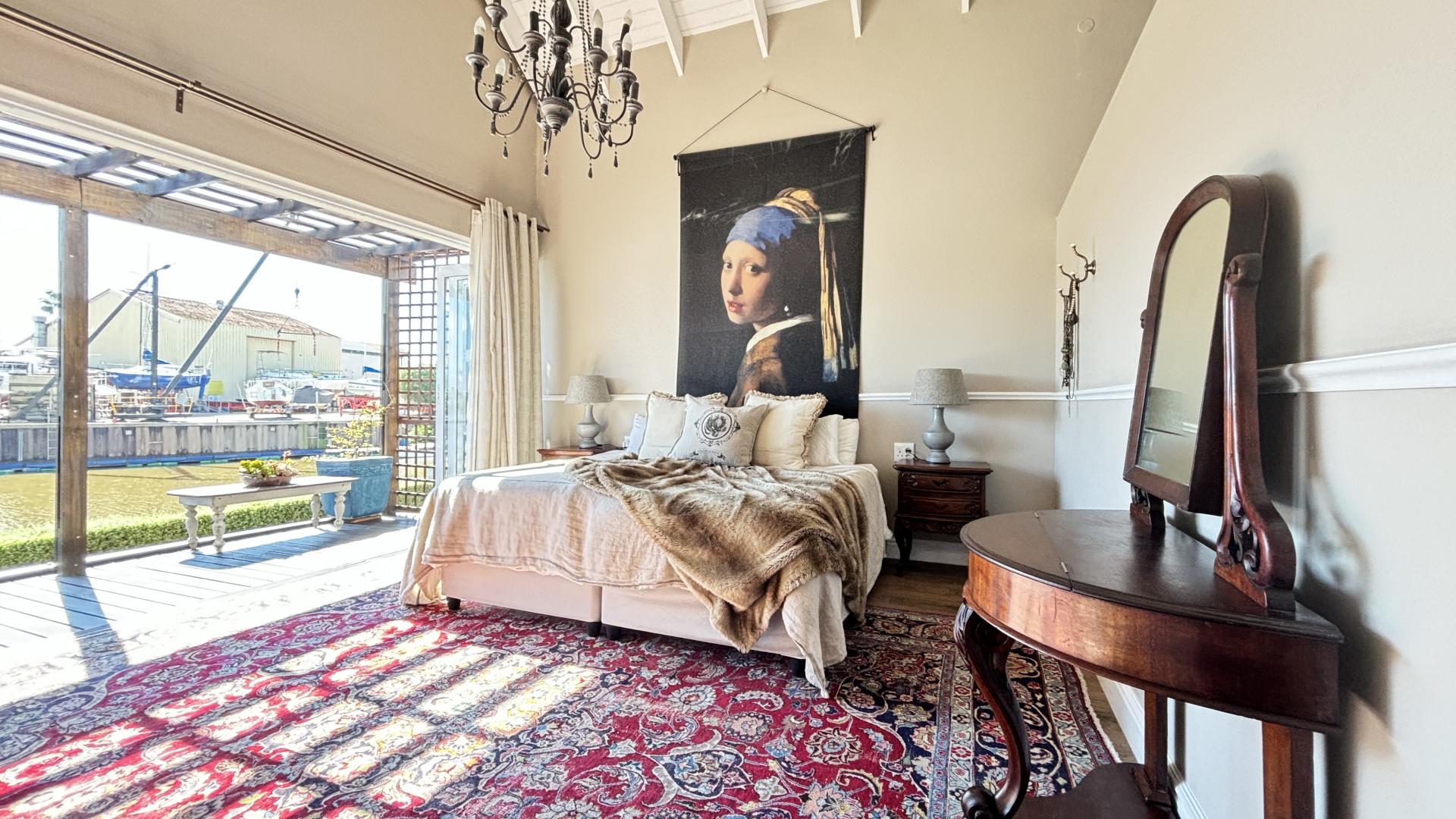 The main en-suite bedroom opens directly onto the tranquil channel, offering water views and peaceful mornings. A reading nook or study adds a touch of luxury, complete with a charming staircase leading to a spacious loft room featuring a skylight and private deck – a dreamy hideaway or creative space.
