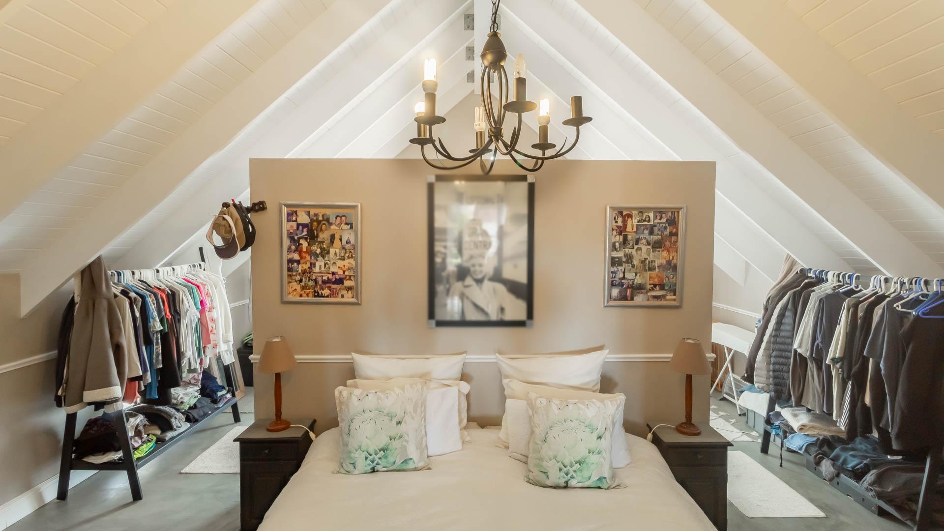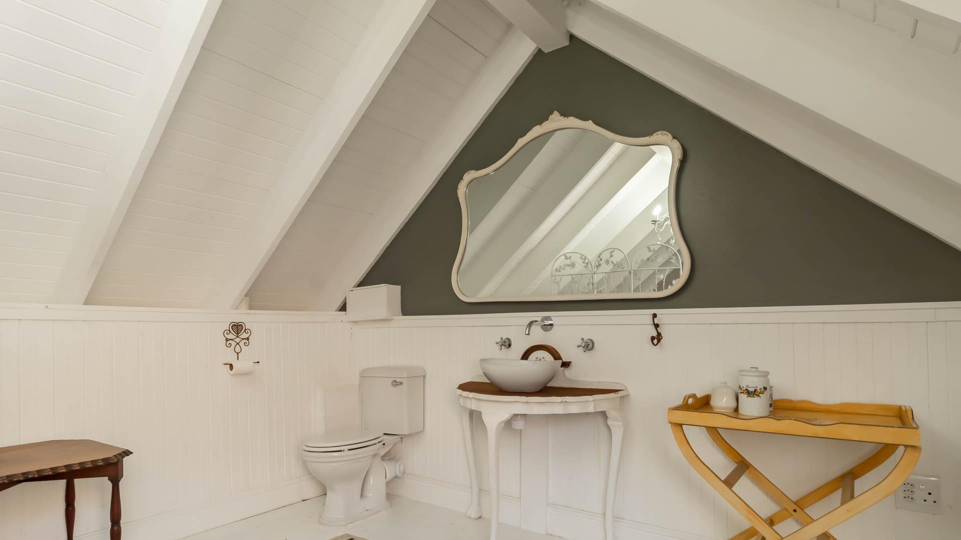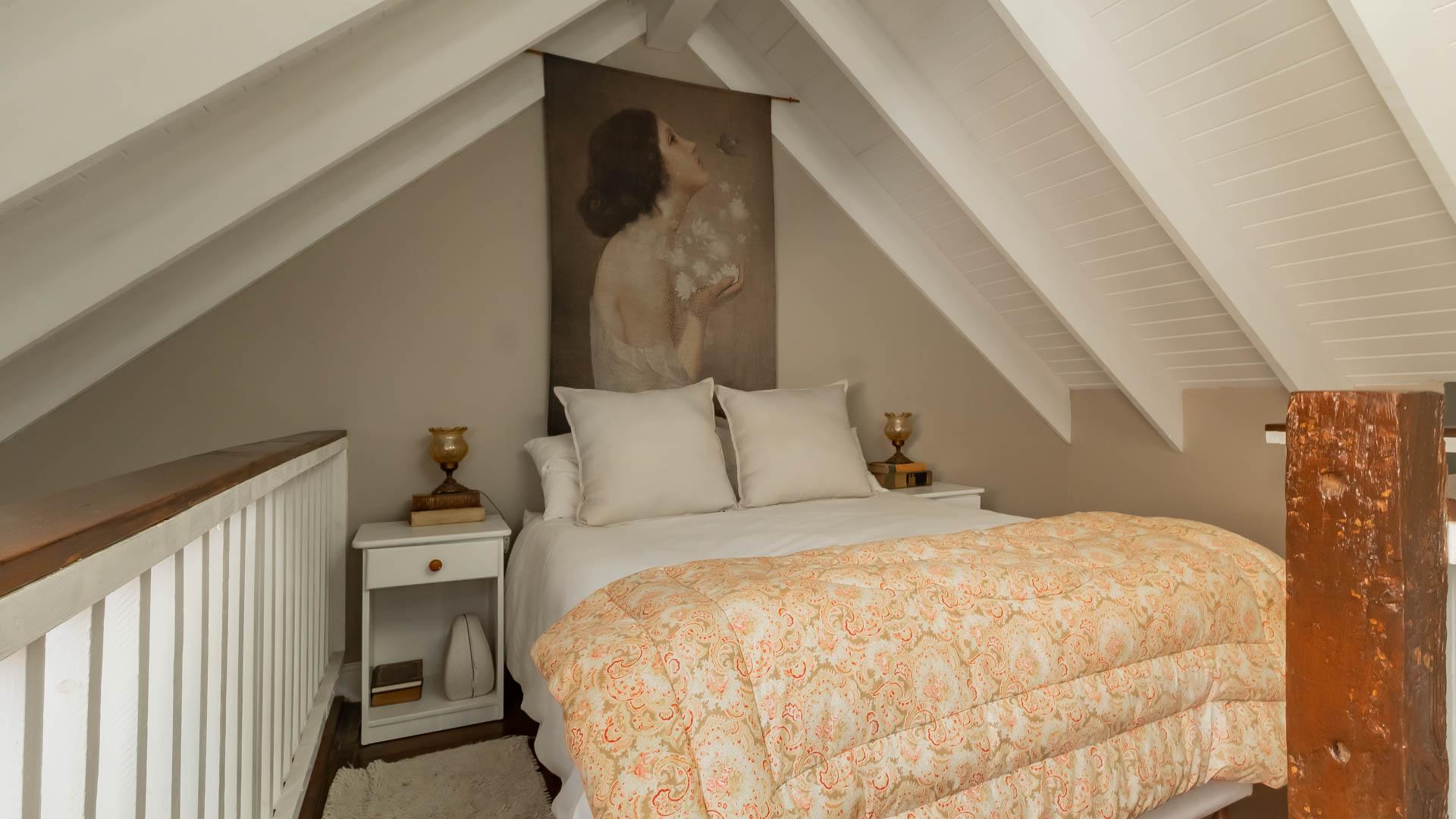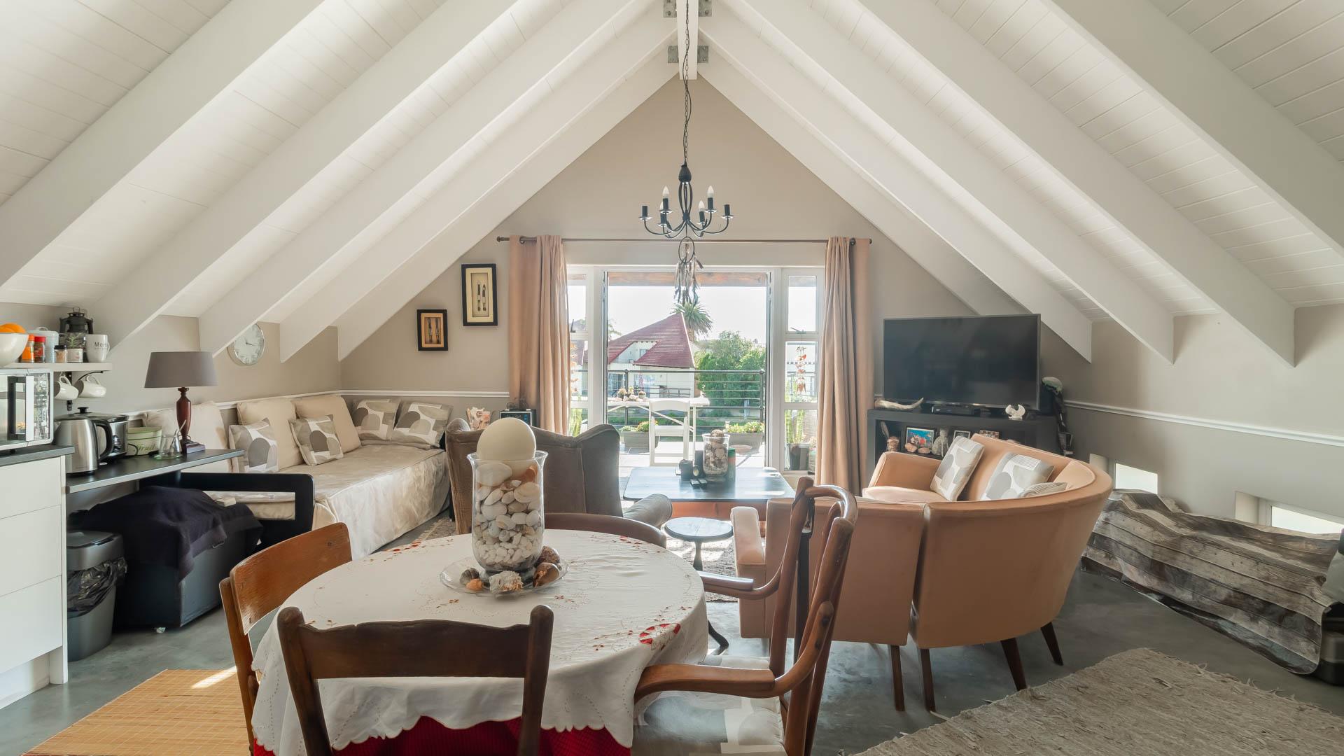 The main en-suite bedroom opens directly onto the tranquil channel, offering water views and peaceful mornings. A reading nook or study adds a touch of luxury, complete with a charming staircase leading to a spacious loft room featuring a skylight and private deck – a dreamy hideaway or creative space.