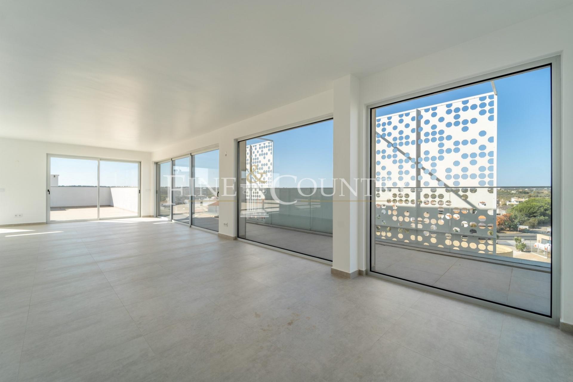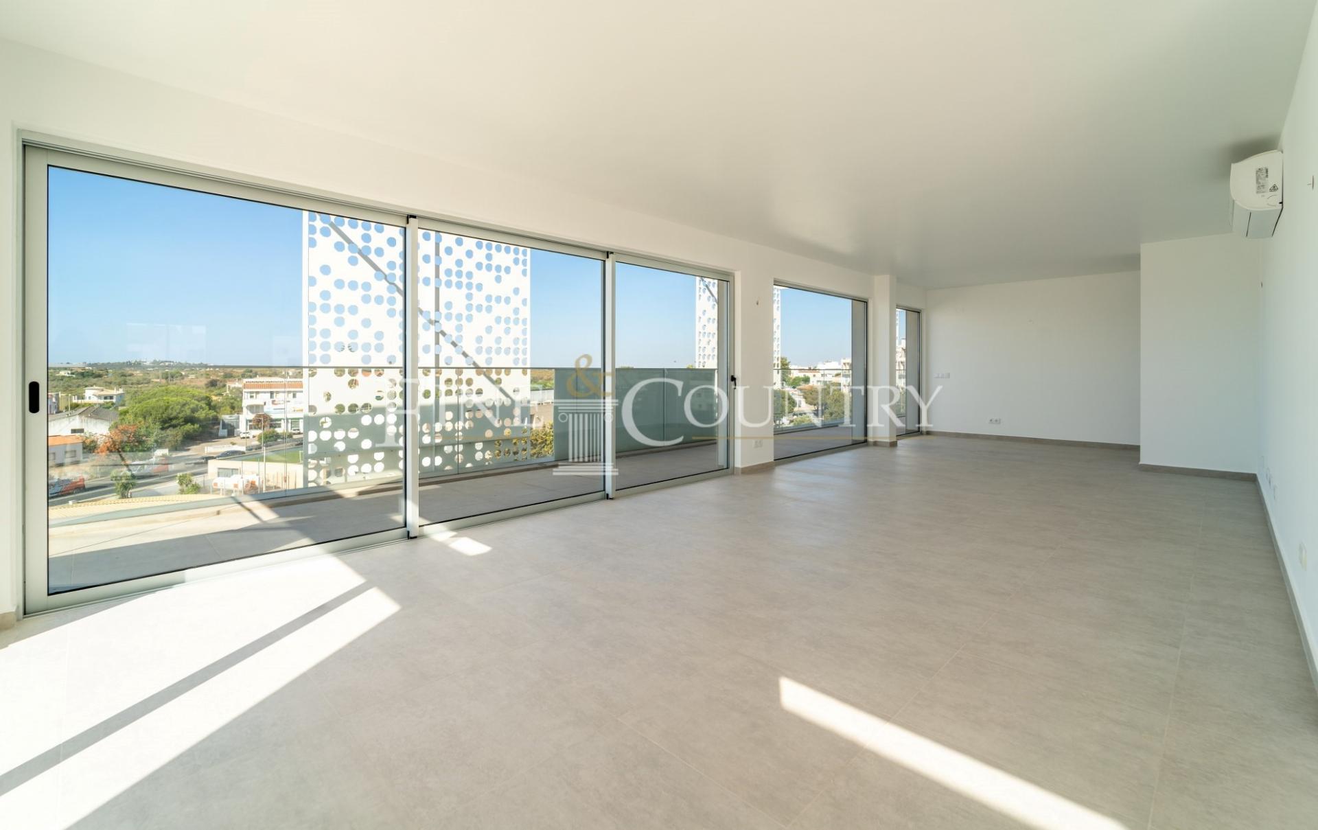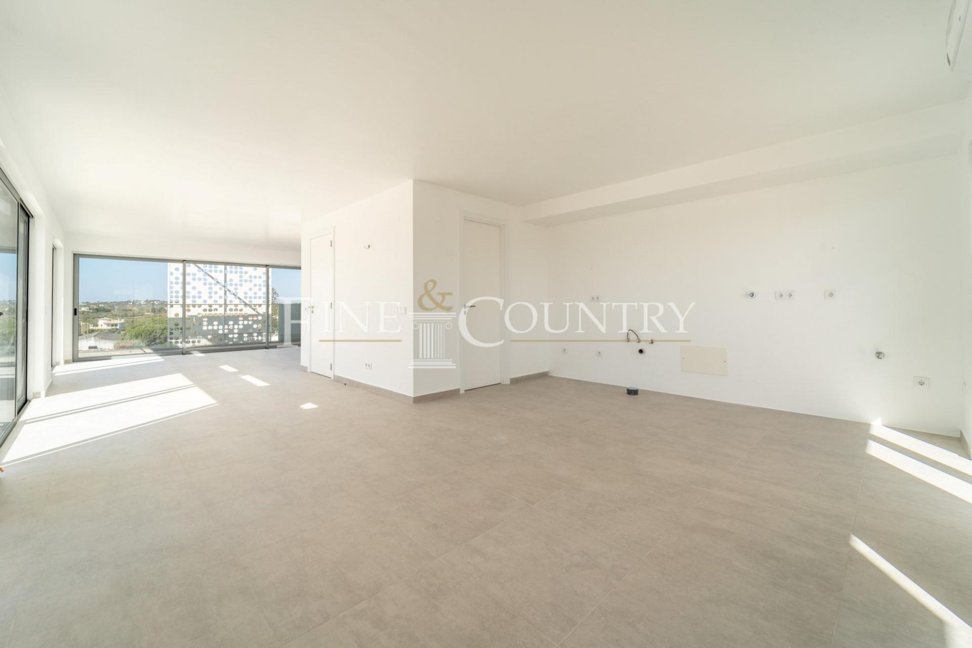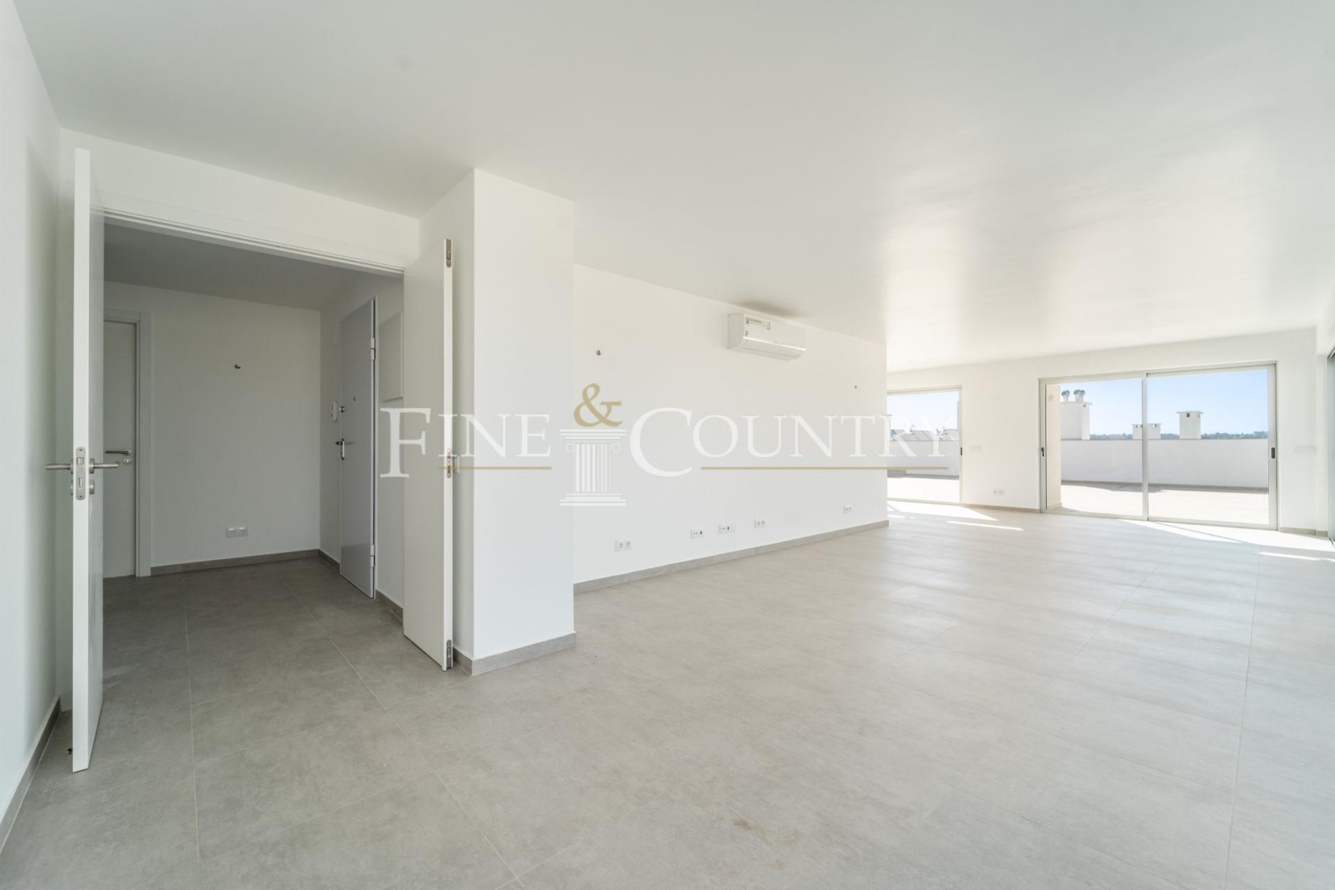 The spacious master bedroom features a stylish free-standing bathtub, a dressing area and an en-suite bathroom with shower. The three additional bedrooms currently share one family bathroom. The living area is large, with three defined areas all with patio doors opening to the extensive terrace. There is also a guest W/C and storage area. The kitchen is yet to be installed giving the buyer total flexibility to have their ideal kitchen designed within the generous space provided. The apartment is part of the Atrium Lagoa development, a modern and centrally located project within easy walking distance of the restaurants, cafés and shops of Lagoa. The property is fully air conditioned with access by elevator, and solar water heating. Included with the apartment are two parking spaces along with two large storage spaces in the basement area.