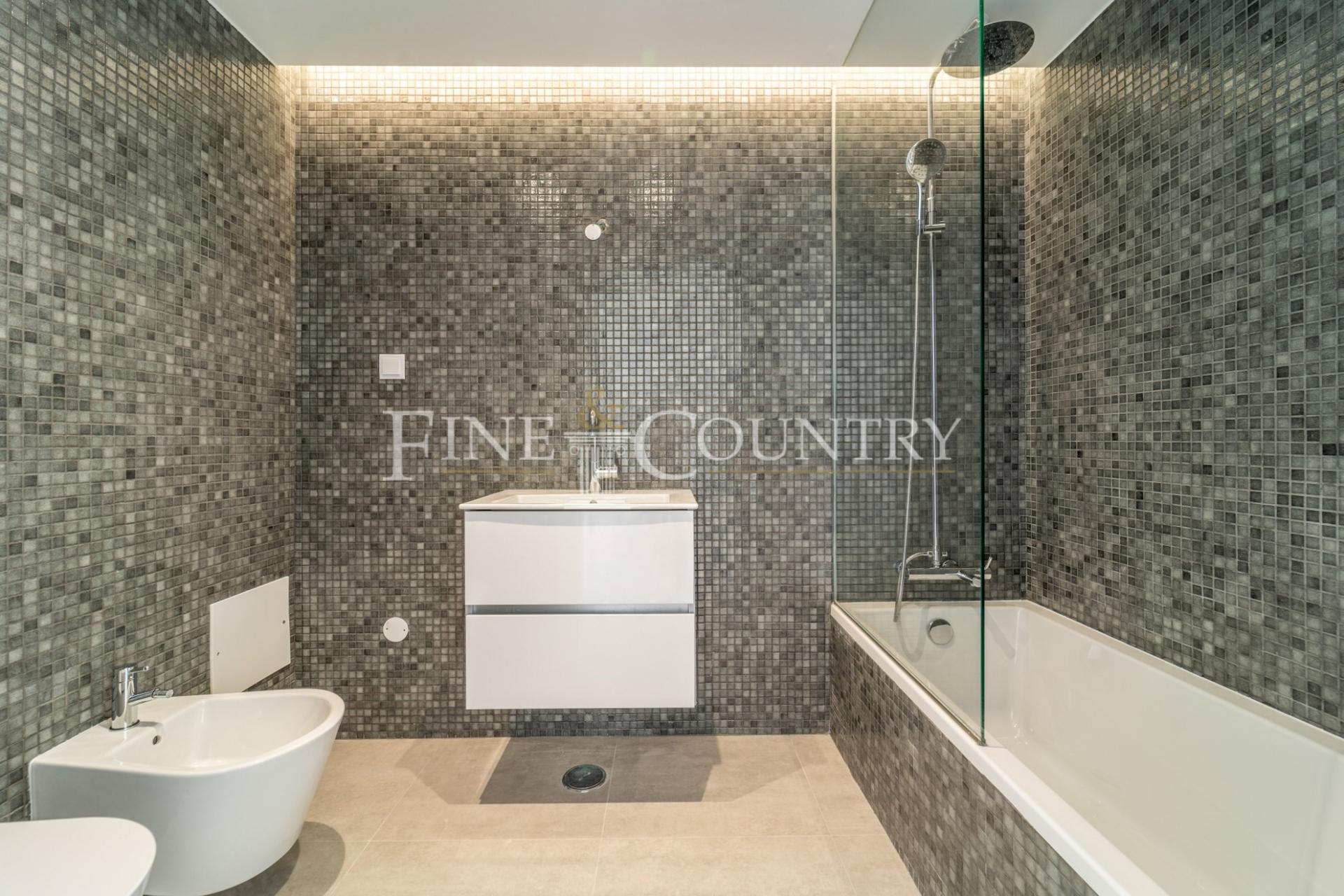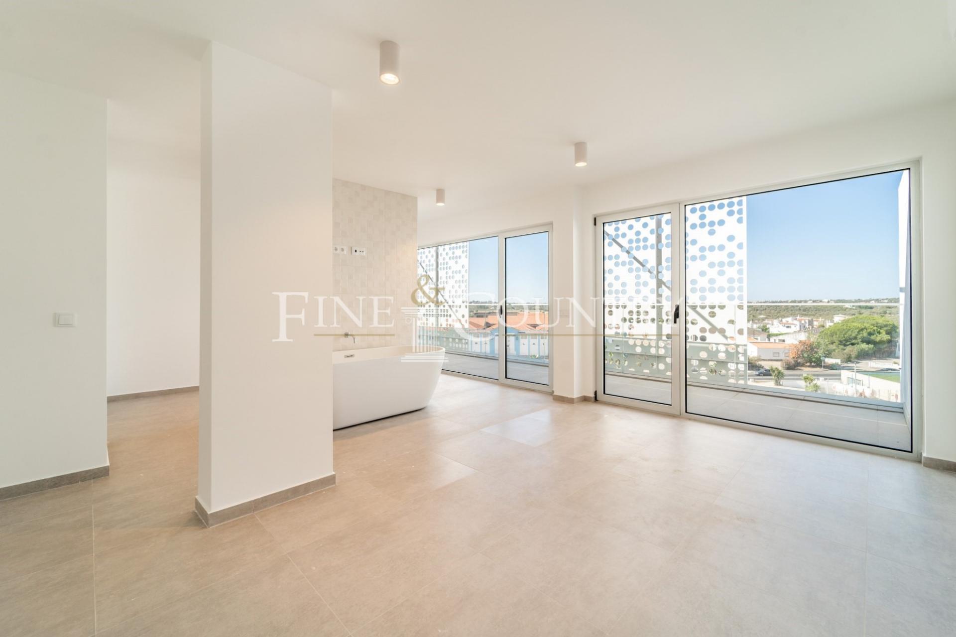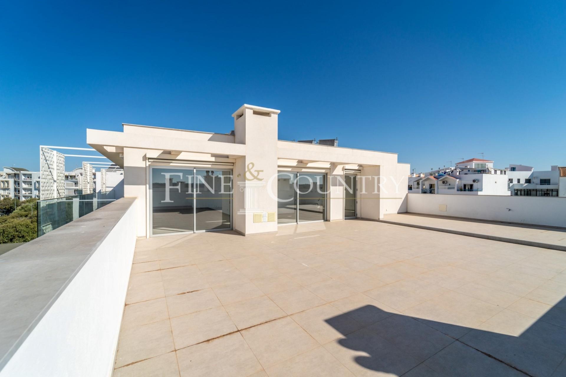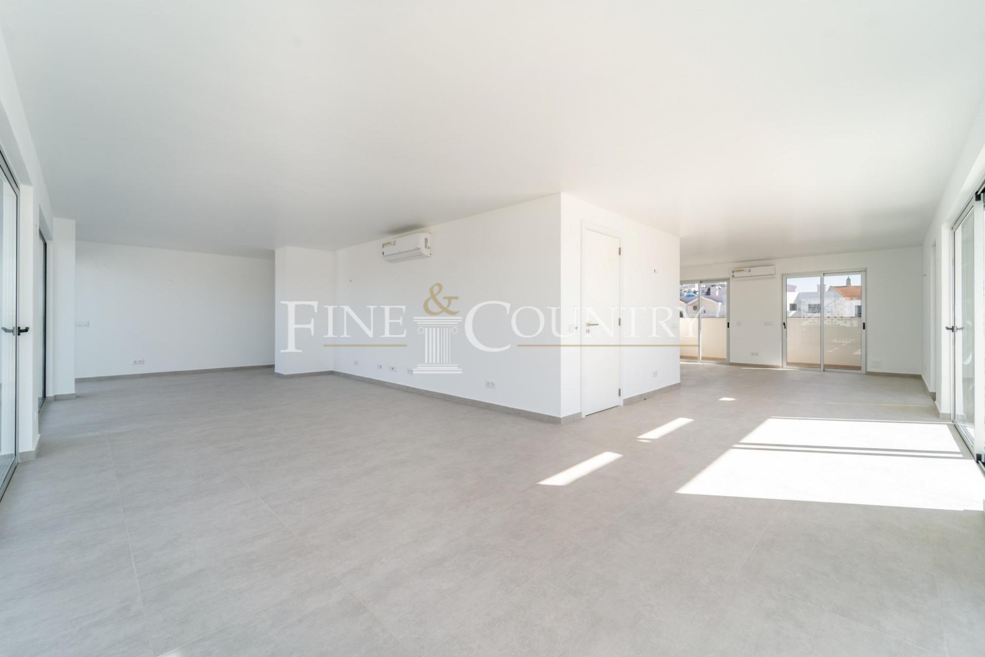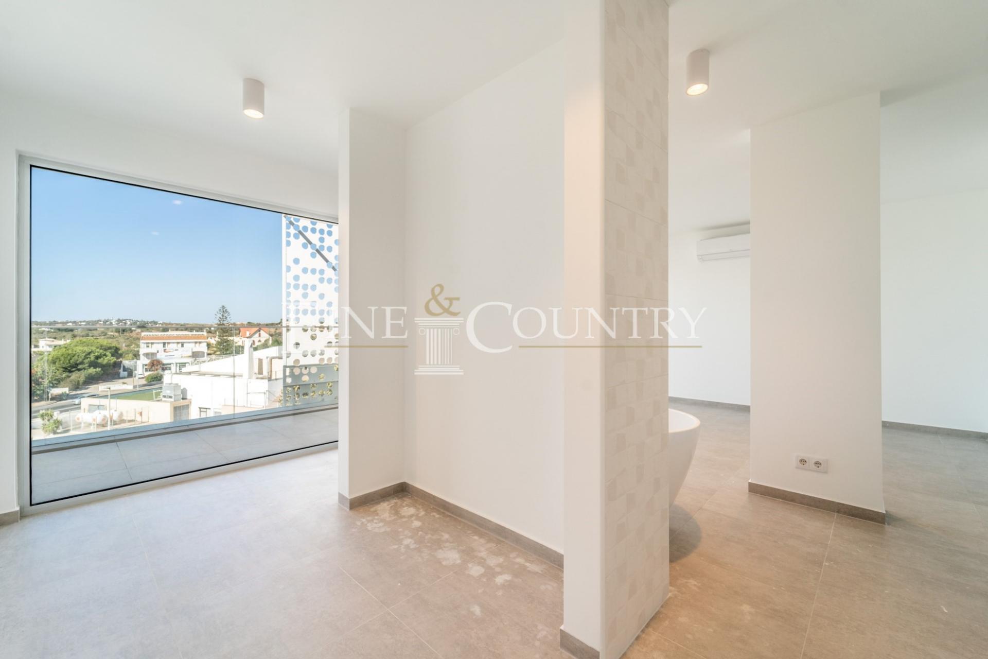The spacious master bedroom features a stylish free-standing bathtub, a dressing area and an en-suite bathroom with shower. The three additional bedrooms currently share one family bathroom. The living area is large, with three defined areas all with patio doors opening to the extensive terrace. There is also a guest W/C and storage area. The kitchen is yet to be installed giving the buyer total flexibility to have their ideal kitchen designed within the generous space provided. The apartment is part of the Atrium Lagoa development, a modern and centrally located project within easy walking distance of the restaurants, cafés and shops of Lagoa. The property is fully air conditioned with access by elevator, and solar water heating. Included with the apartment are two parking spaces along with two large storage spaces in the basement area.
