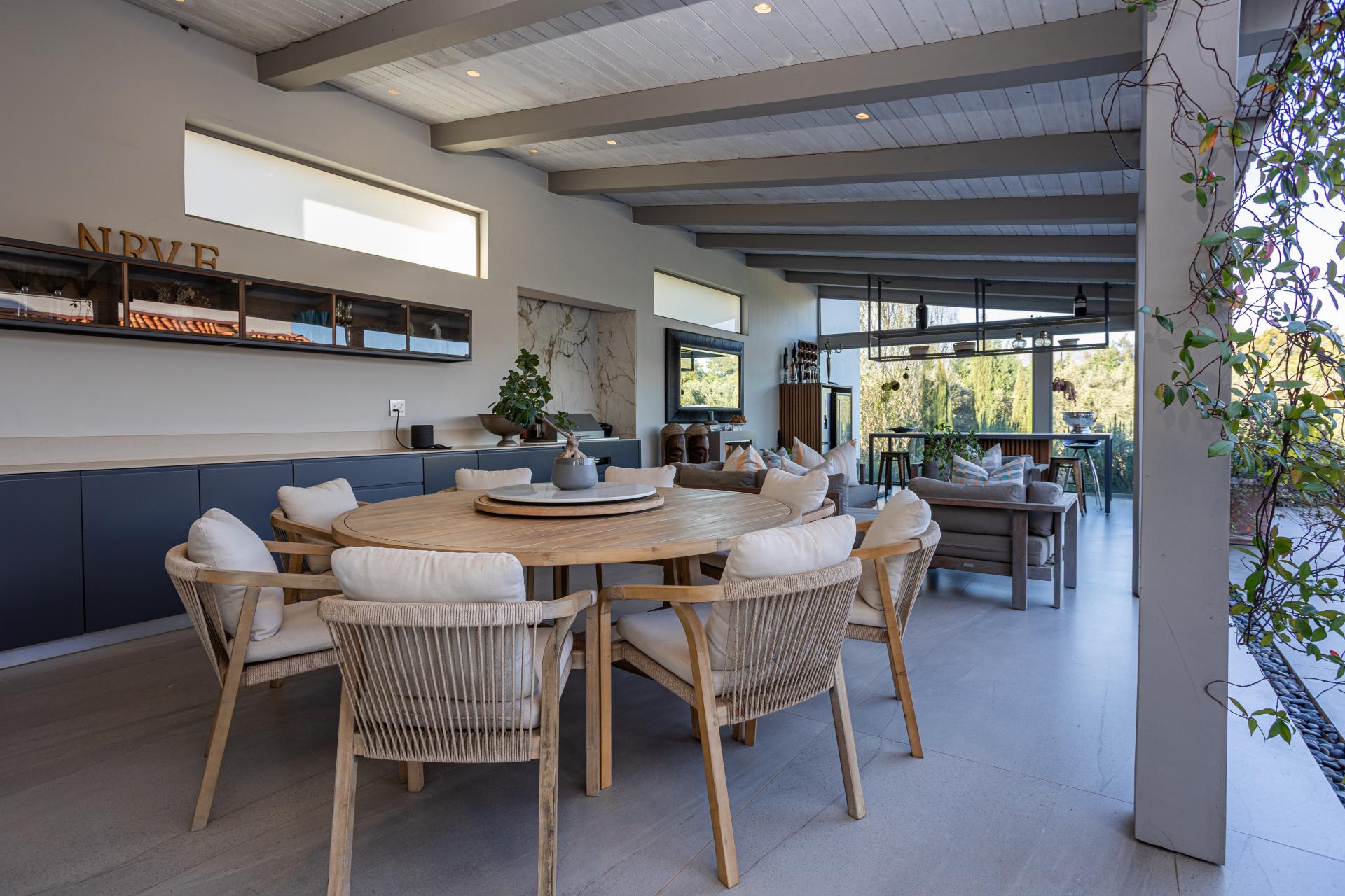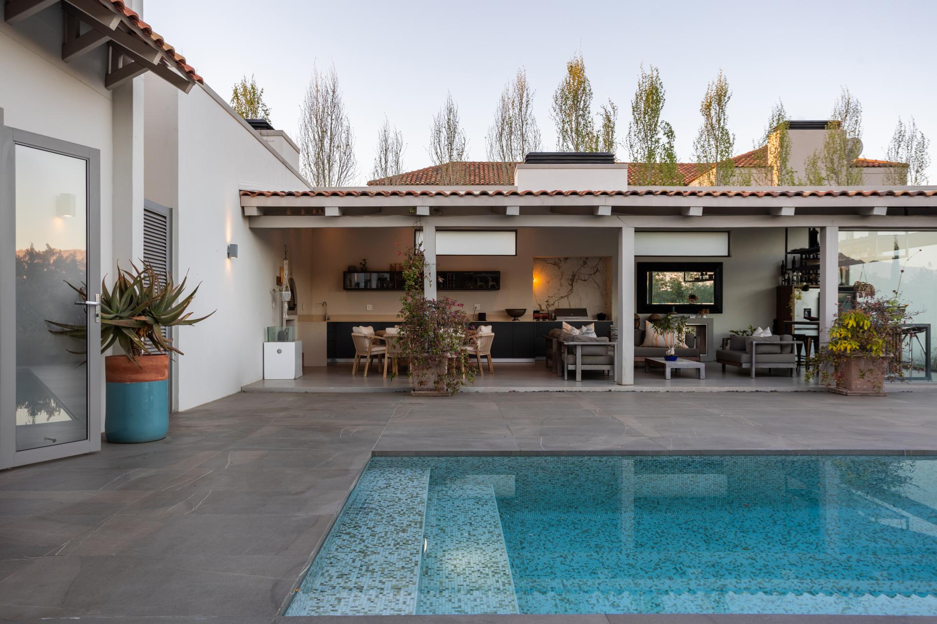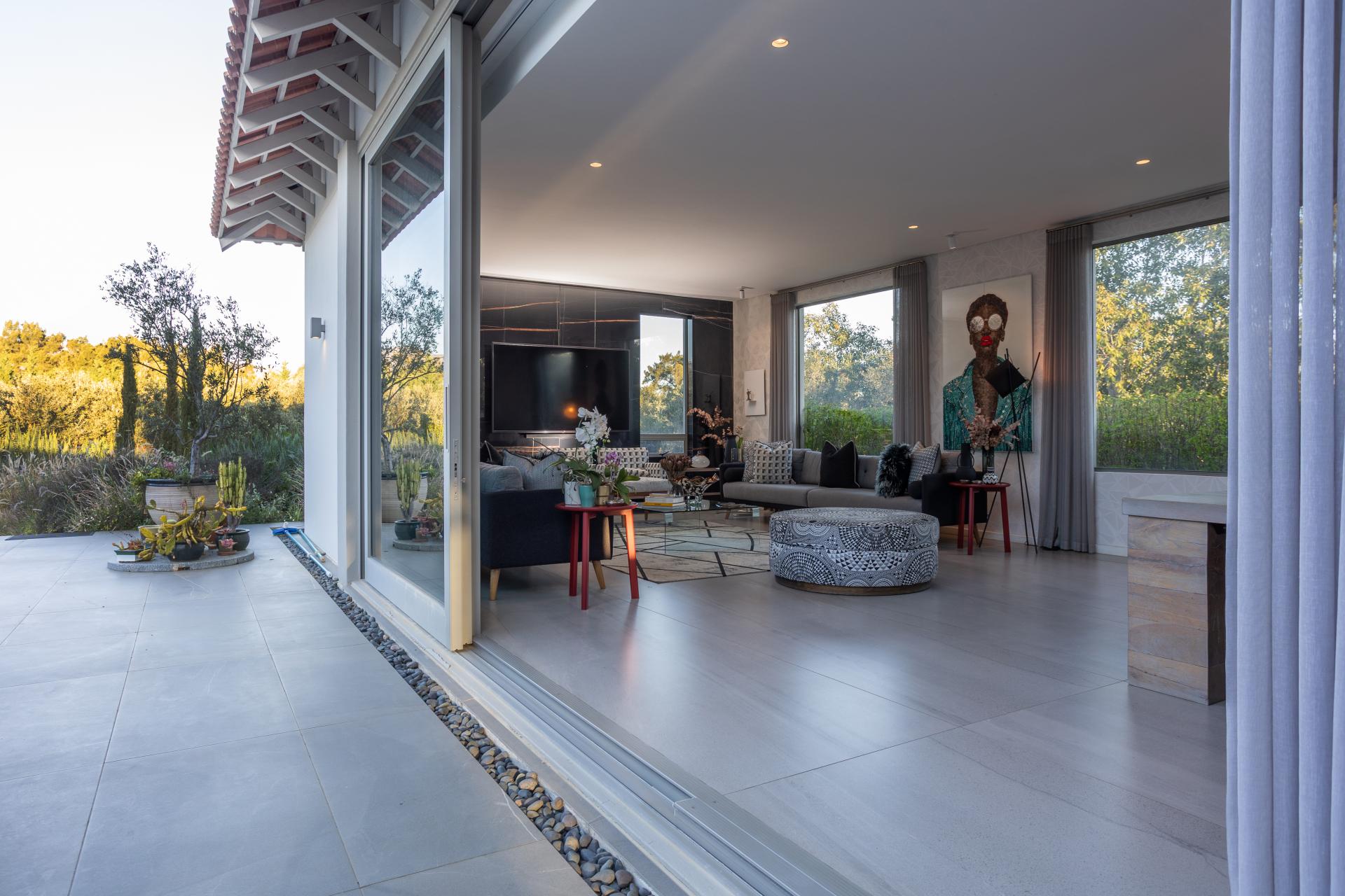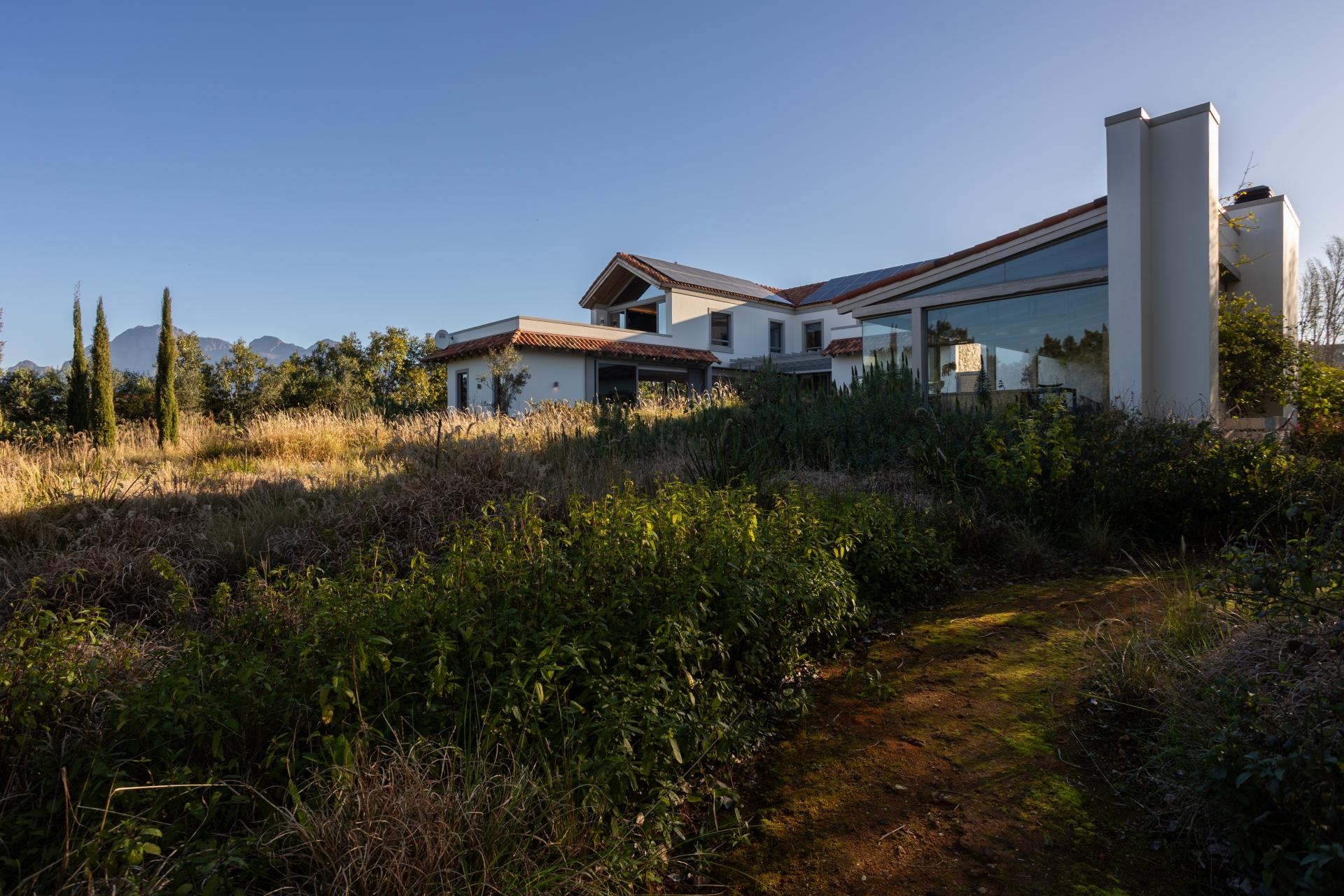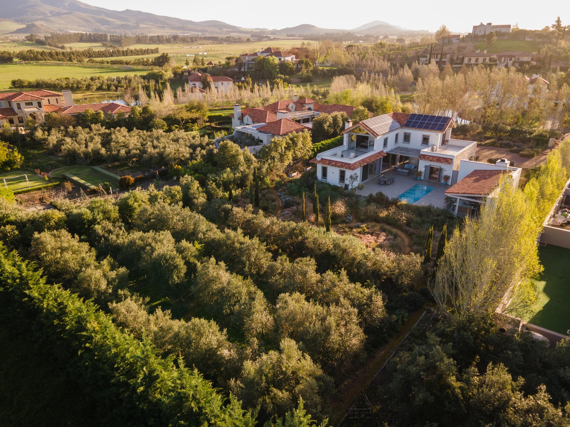 Set in the heart of the prestigious Winelands Estate, this distinguished residence embodies the essence of refined country living. Overlooking its own olive grove and framed by an indigenous garden alive with birdlife, the home combines natural elegance with contemporary comfort, enriched by imported stone finishes and streams of natural light.