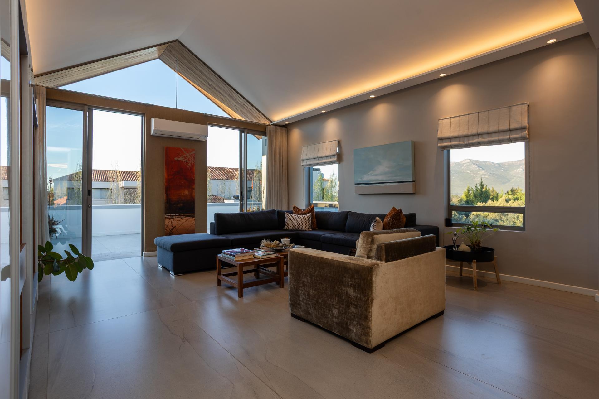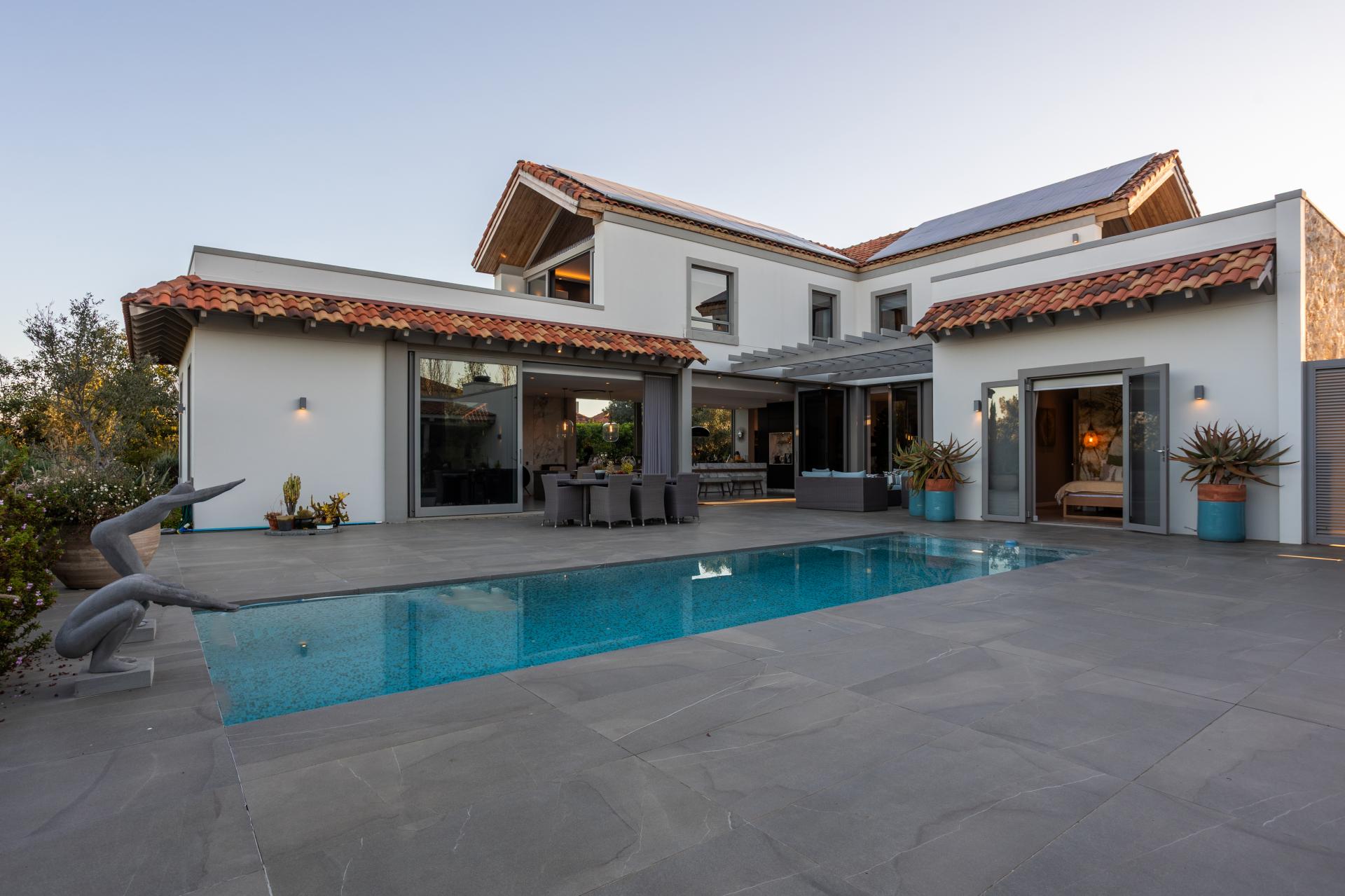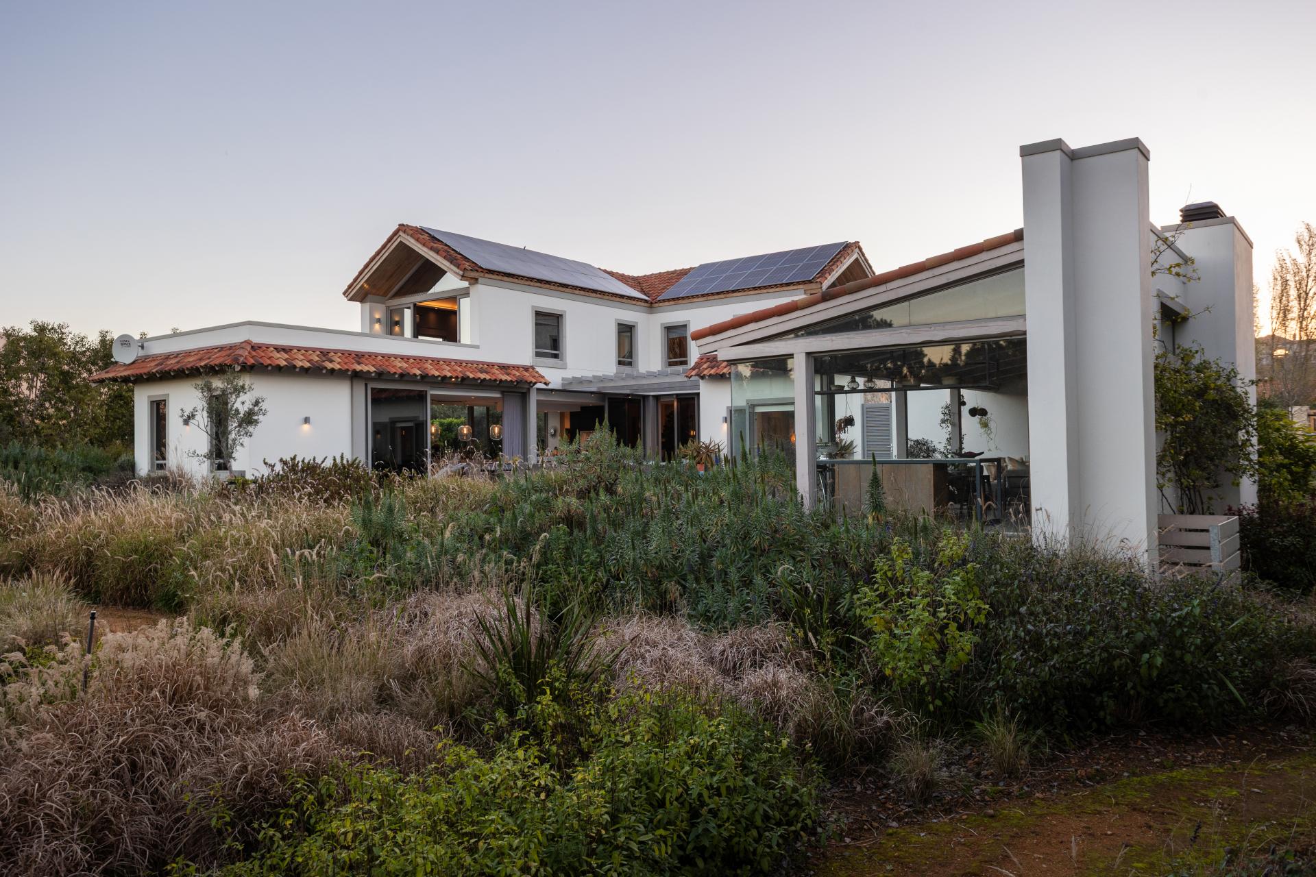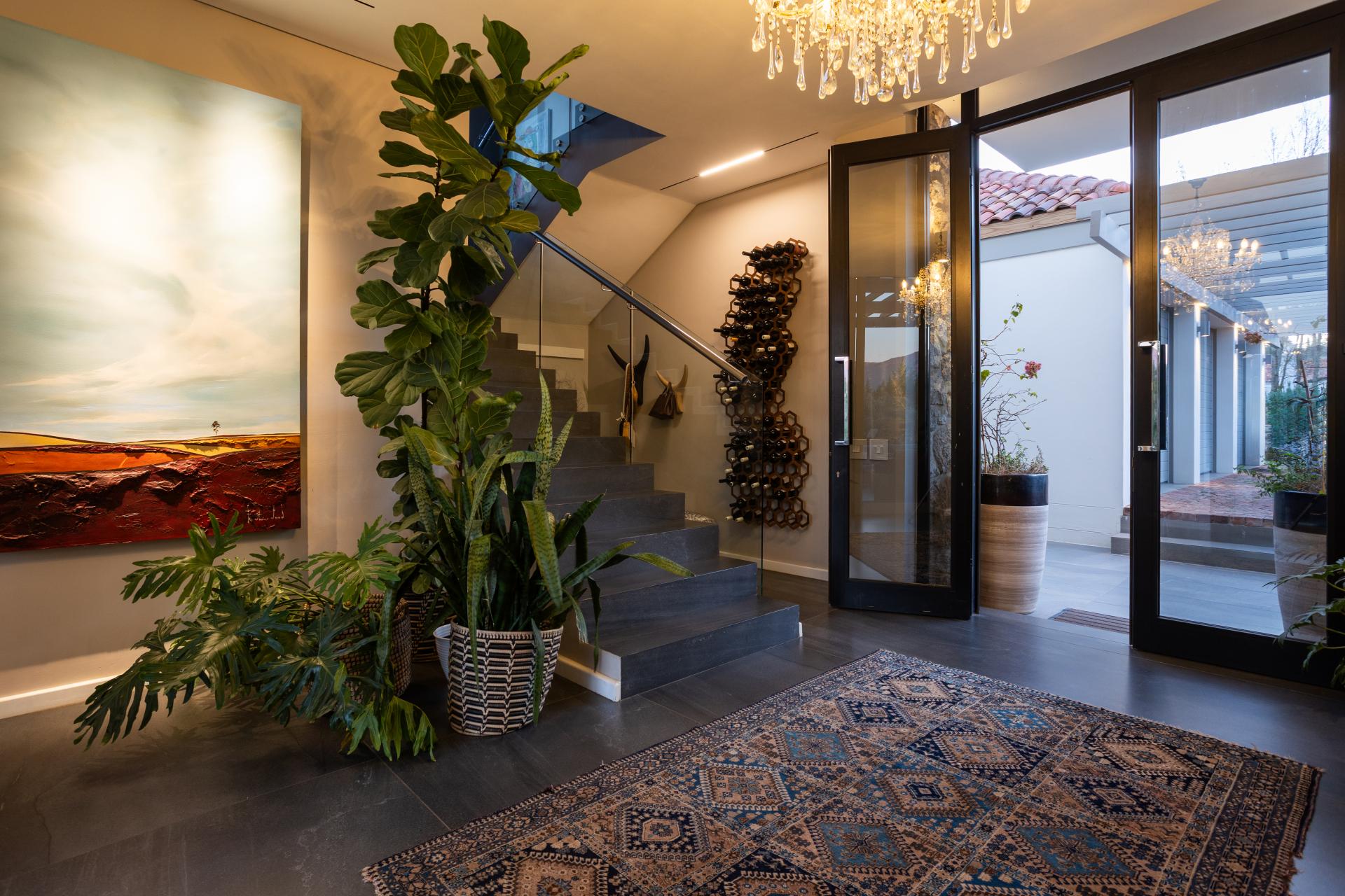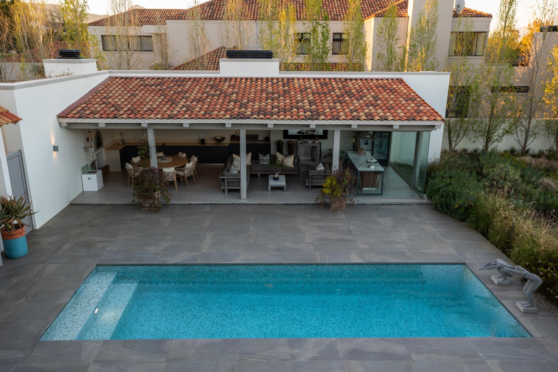 Set in the heart of the prestigious Winelands Estate, this distinguished residence embodies the essence of refined country living. Overlooking its own olive grove and framed by an indigenous garden alive with birdlife, the home combines natural elegance with contemporary comfort, enriched by imported stone finishes and streams of natural light.