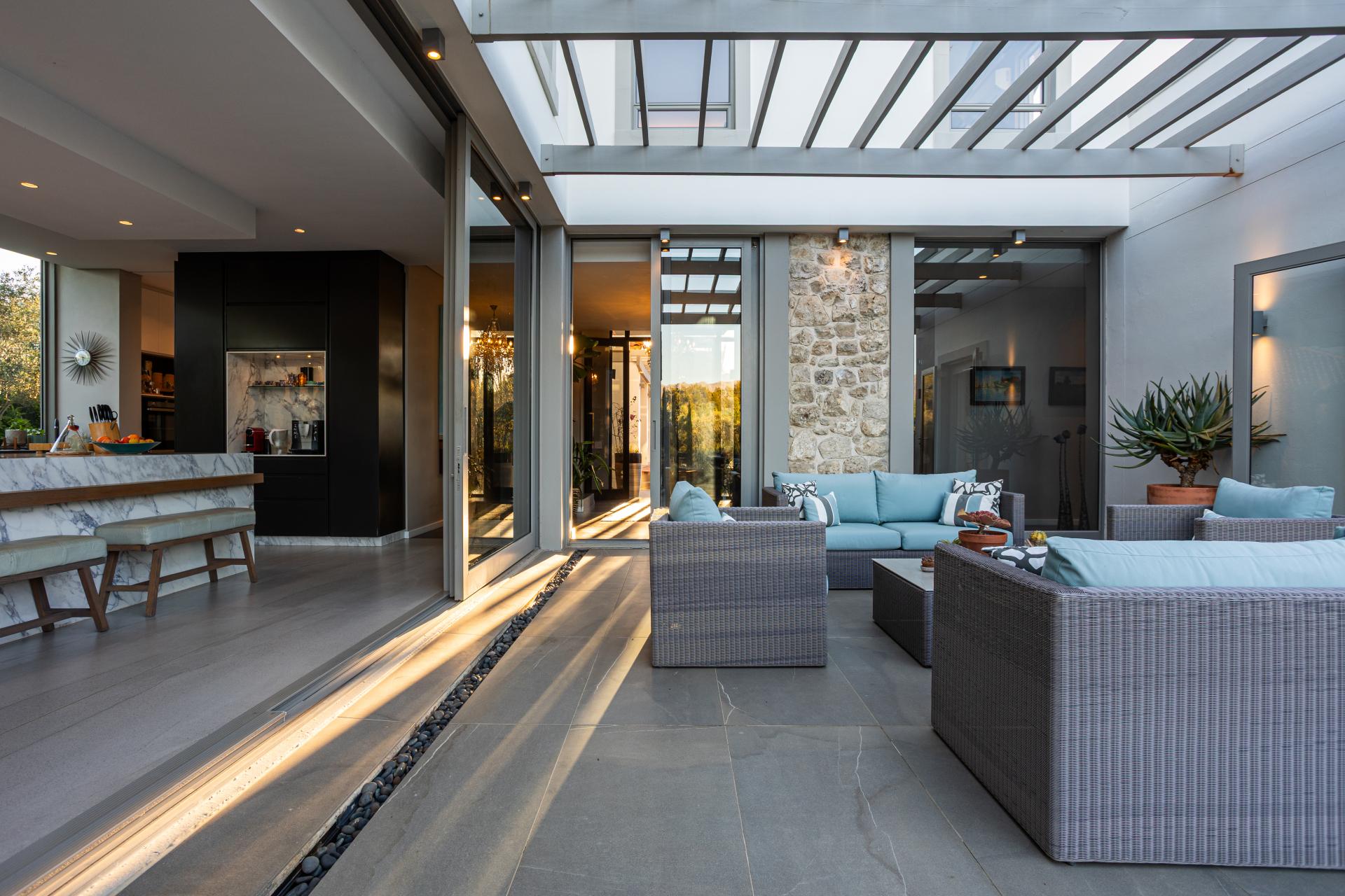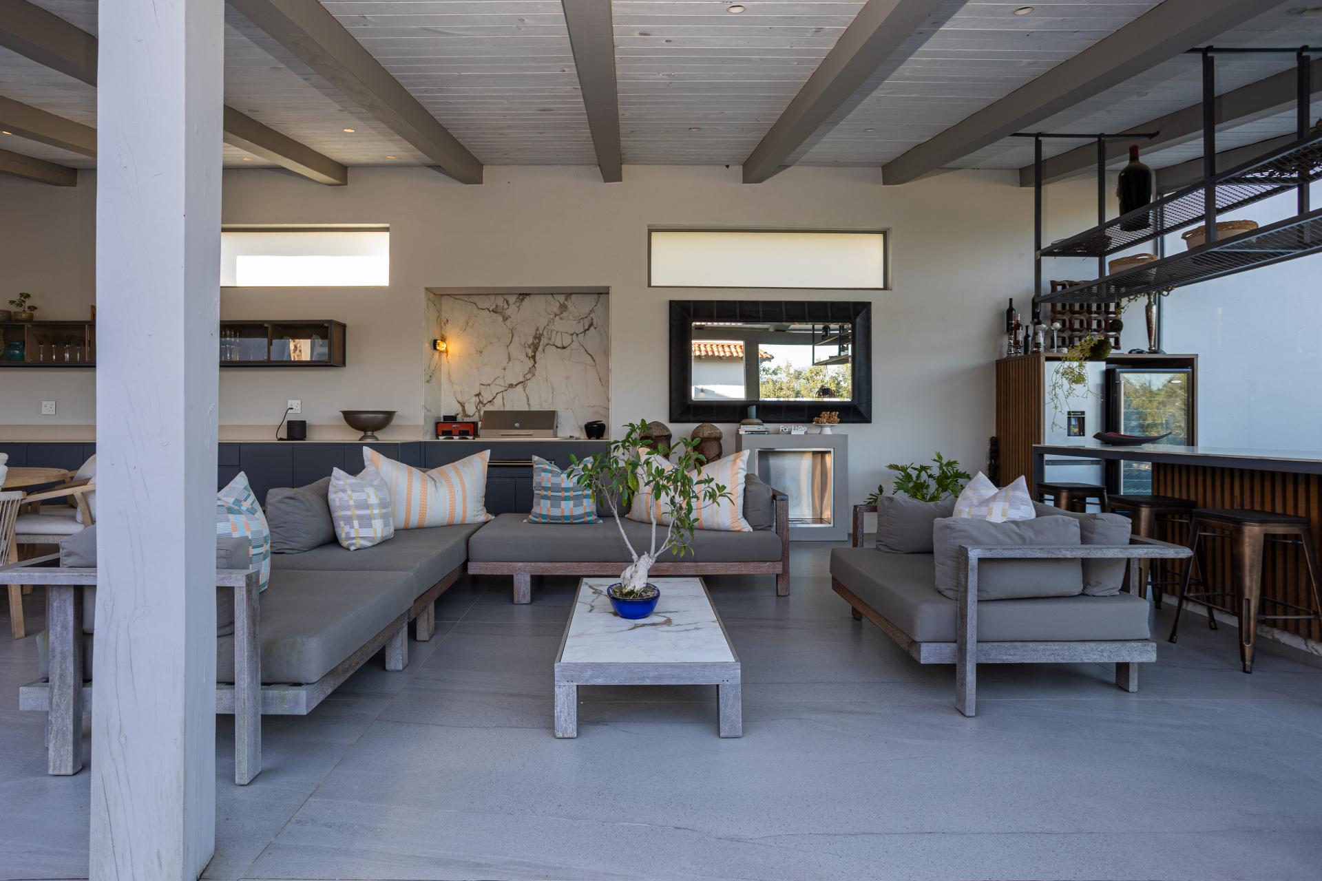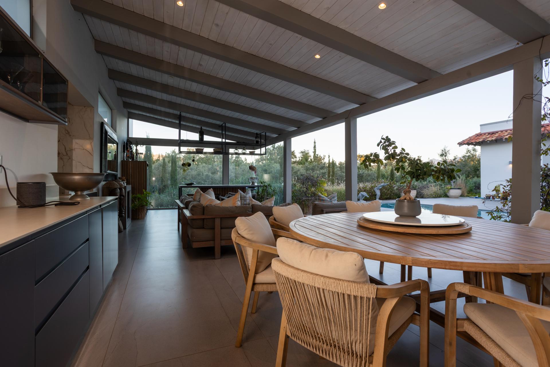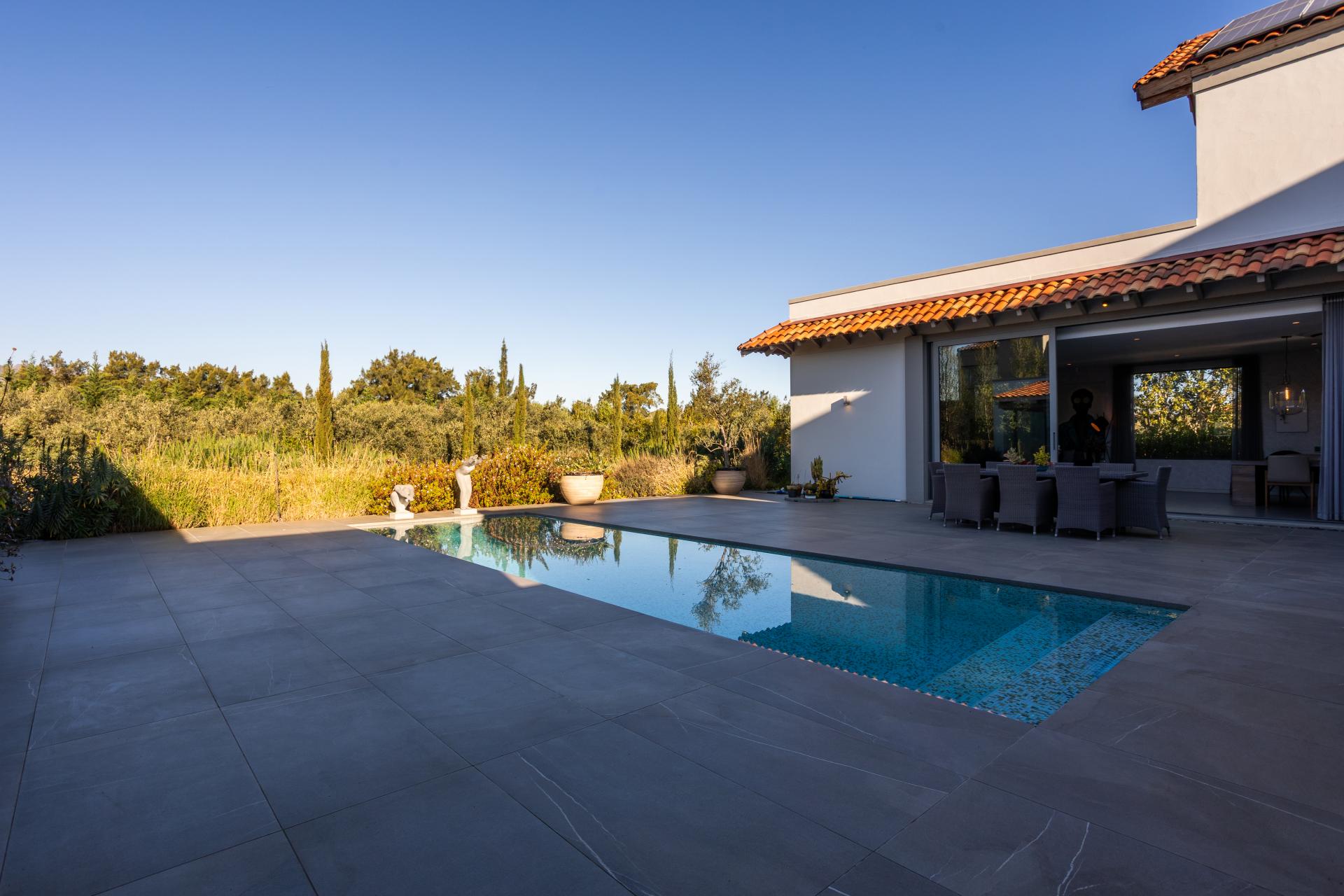The property truly excels as an entertainer’s haven, featuring a pavilion with both a relaxing and eating section and includes a built-in pizza oven, gas braai and a fireplace. A sparkling mosaic-tiled pool anchors the landscaped gardens, shaded by ancient olive trees and meandering walkways.