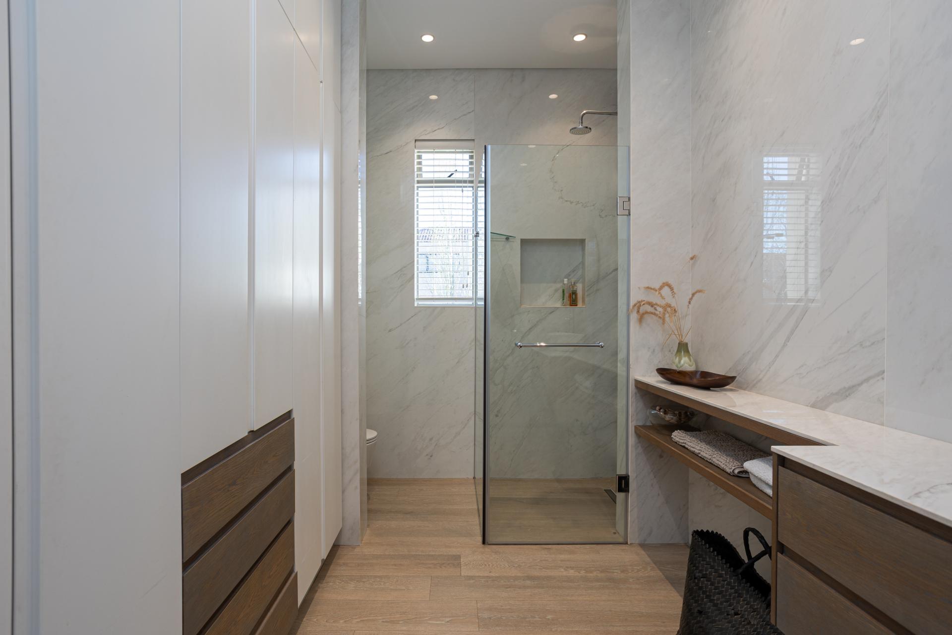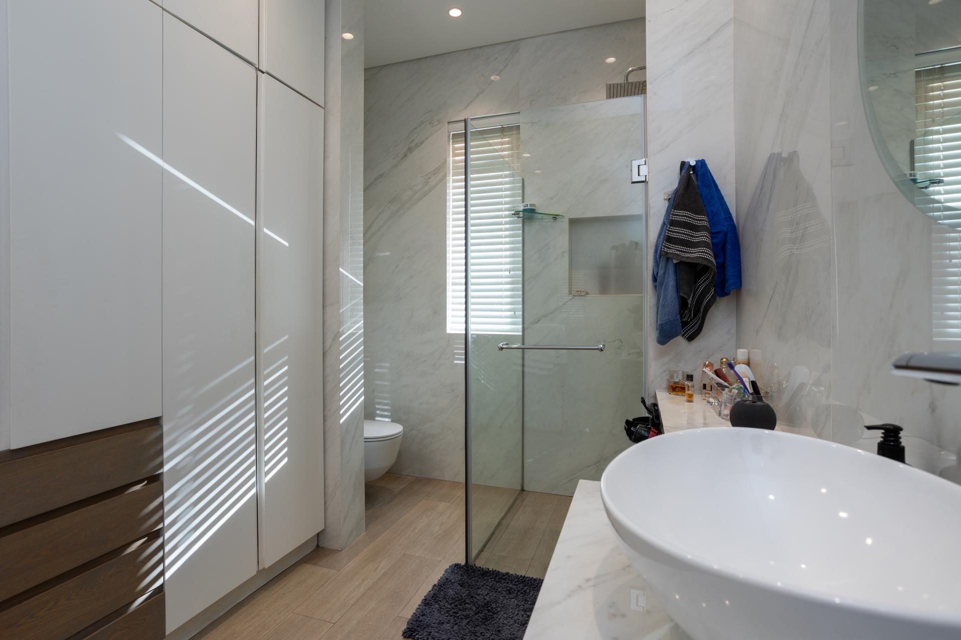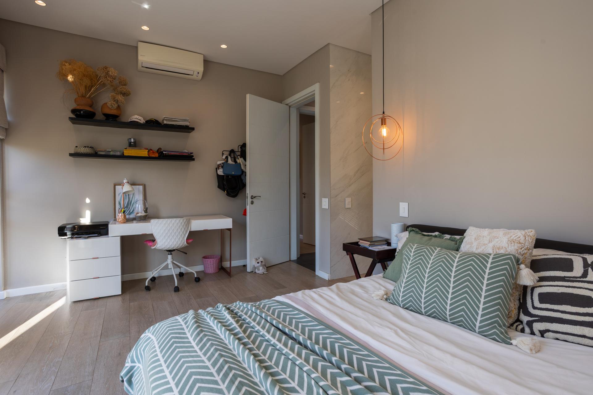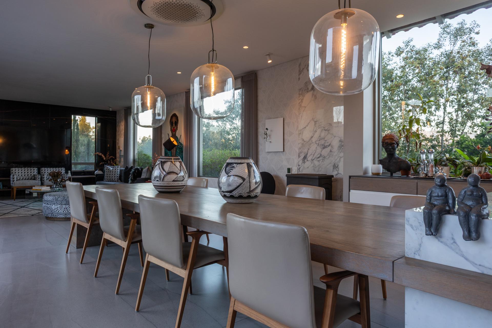 At the centre of the home lies a chef’s kitchen, complete with premium Grundig appliances, a large central island, and a beautifully integrated solid wood dining table. The open-plan layout flows seamlessly into the elegant living and dining areas, where imported stone accents add warmth and sophistication.