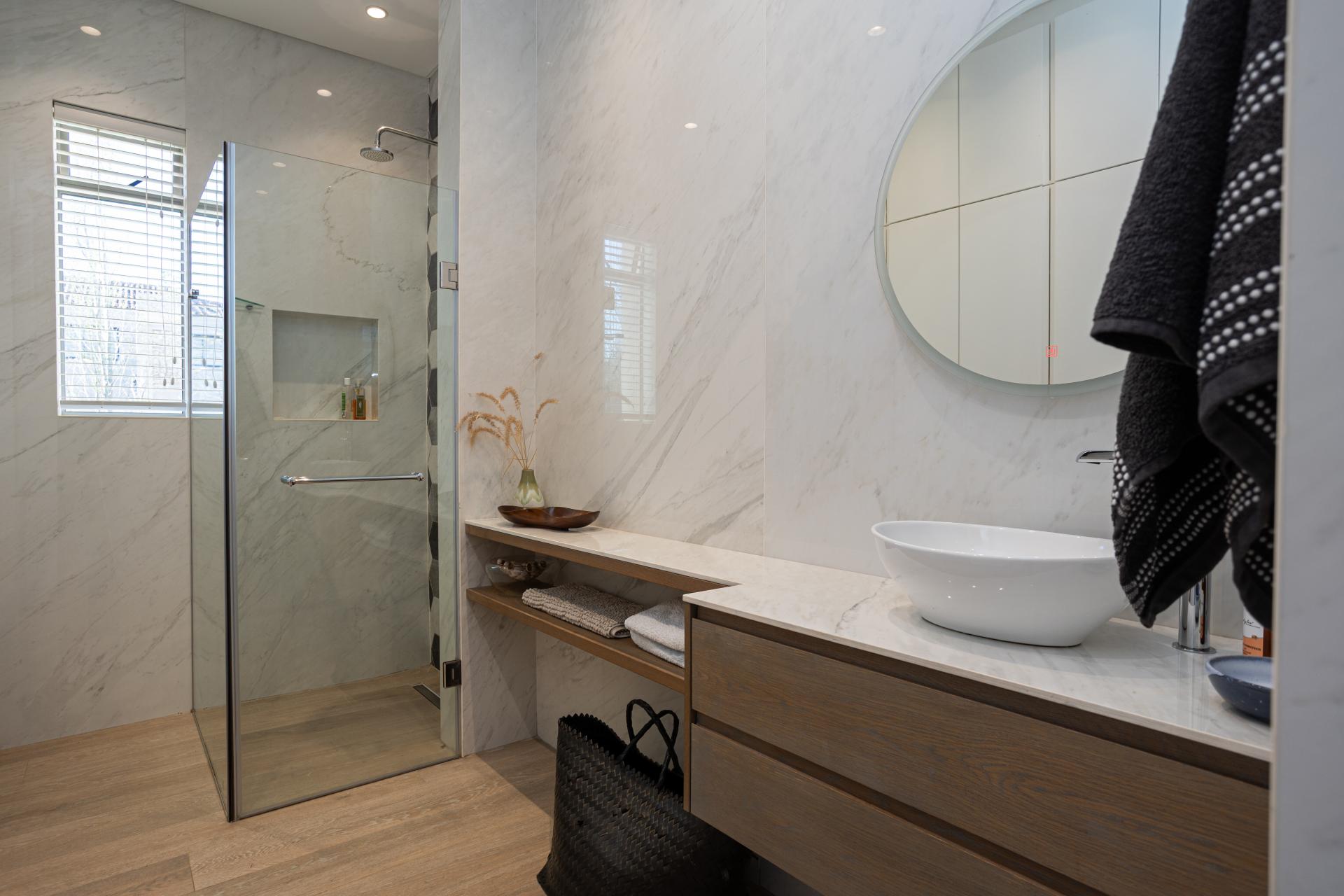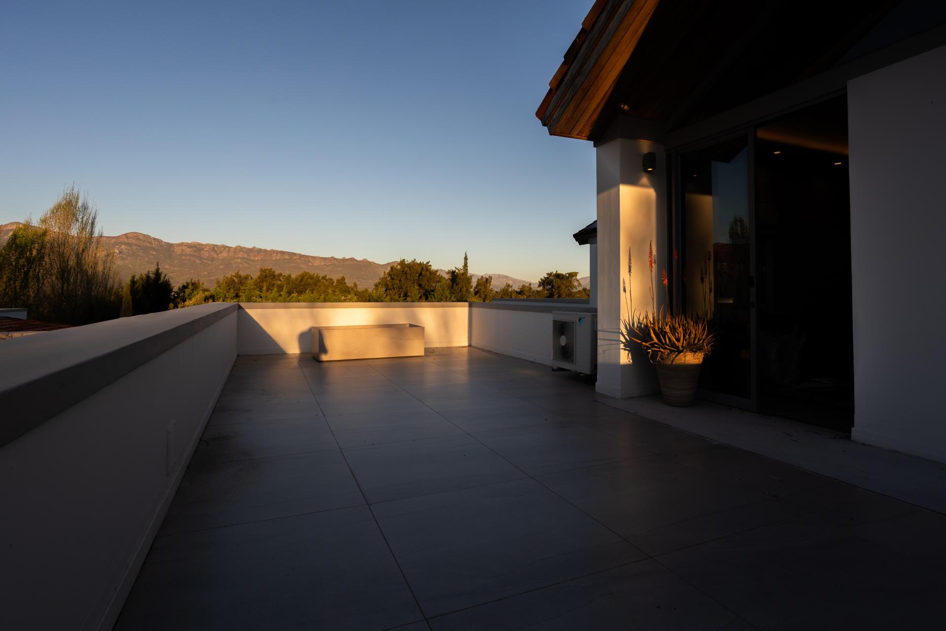 The master suite is a private retreat, offering a walk-in dressing room, full en-suite bathroom, and a secluded patio with sweeping mountain vistas. Two additional en-suite bedrooms on the lower level enjoy serene garden views, while approved plans for a fourth upstairs bedroom provide scope for easy expansion.