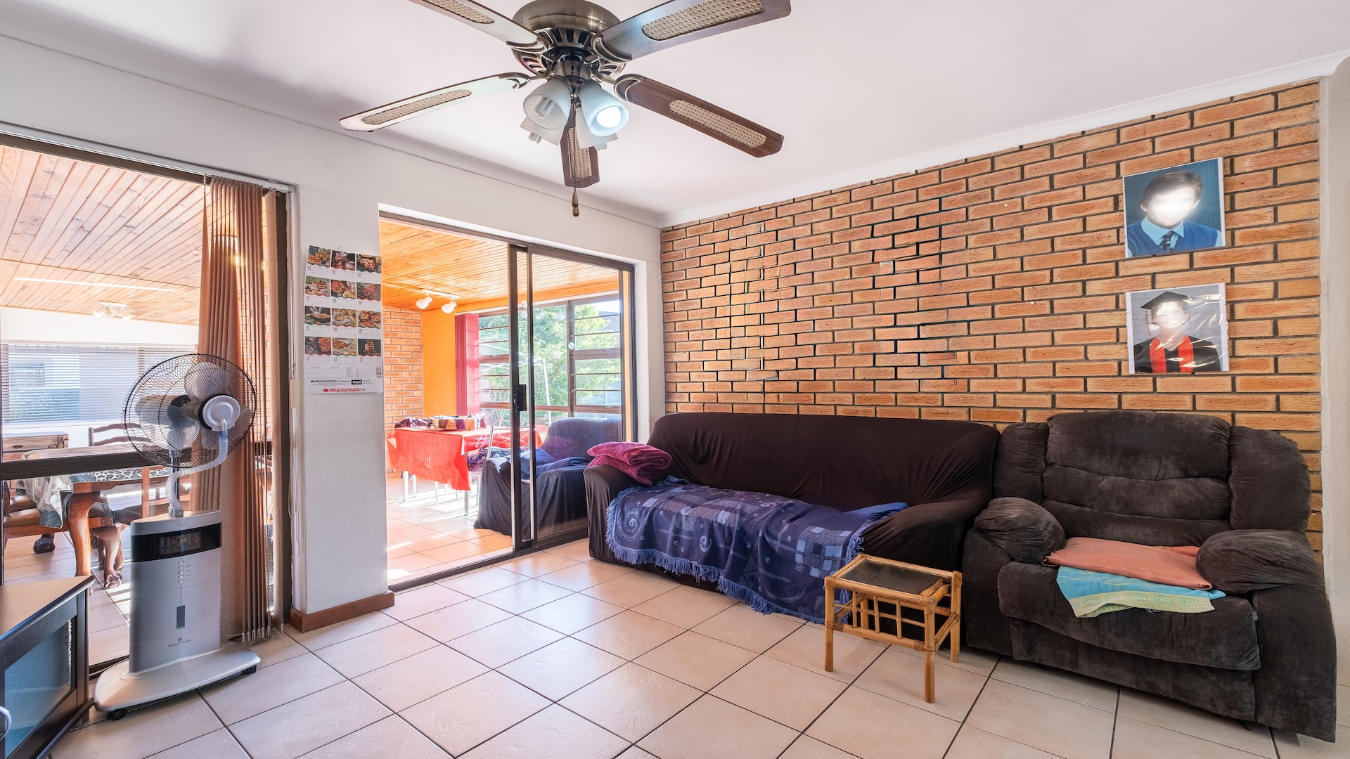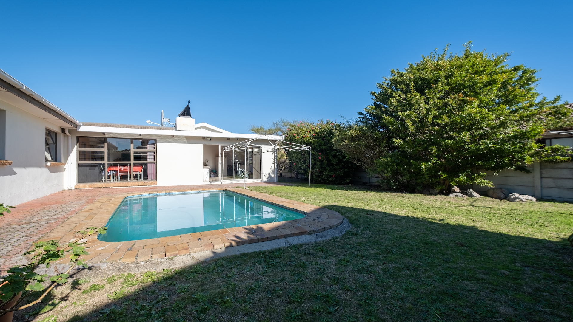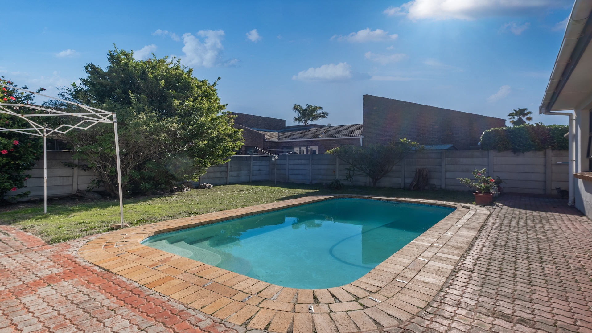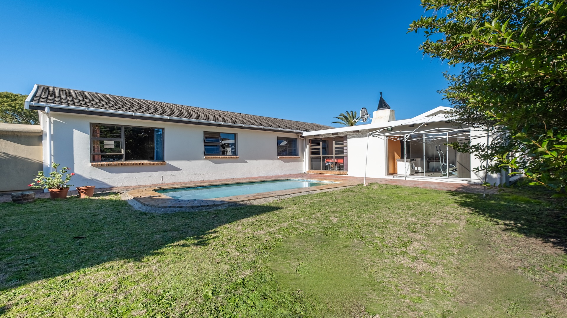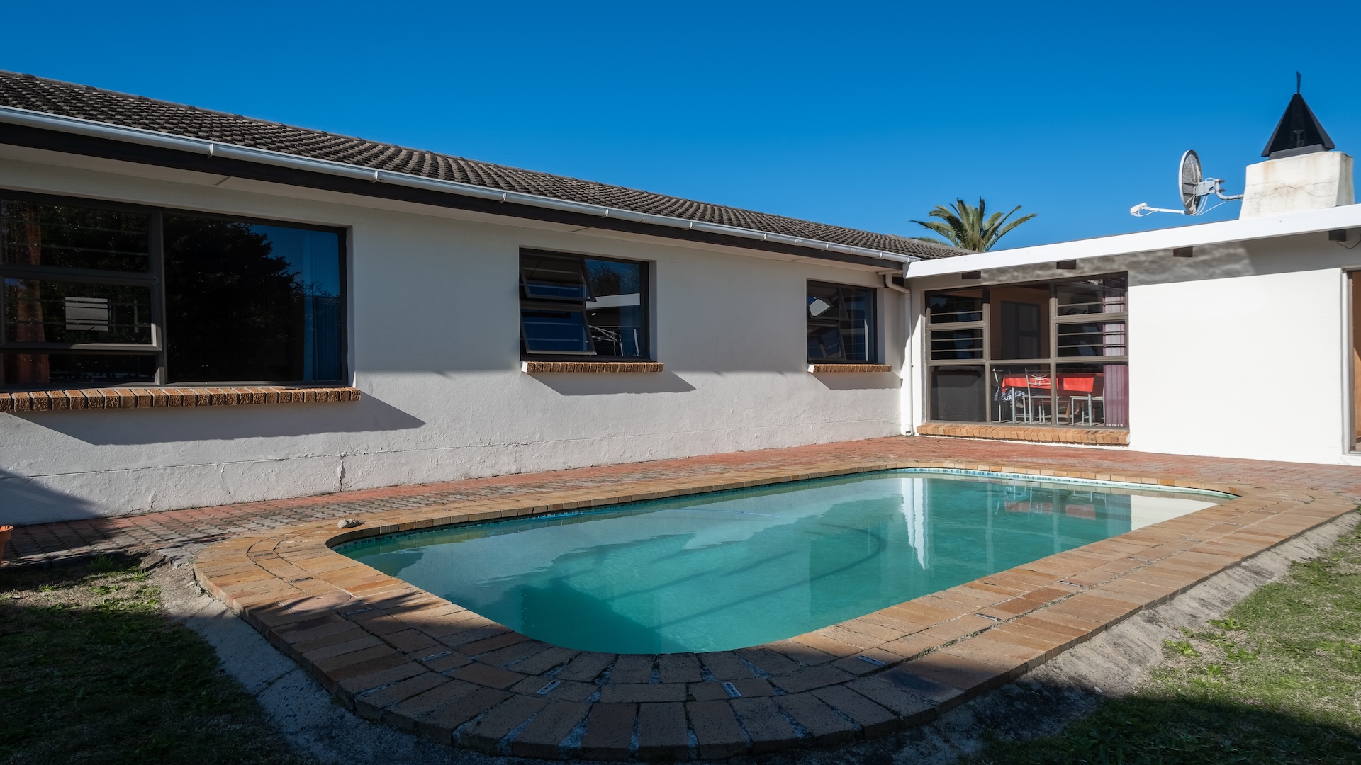 The kitchen flows seamlessly into the family room, a fully enclosed braai room, and then into the sunroom overlooking a comfortable-sized pool in a lawn-covered backyard with paved pathways. This home offers four ample bedrooms, providing adequate space for family and comfort. There are two bathrooms, one full family bathroom and an en-suite, thus ensuring convenience for all occupants.