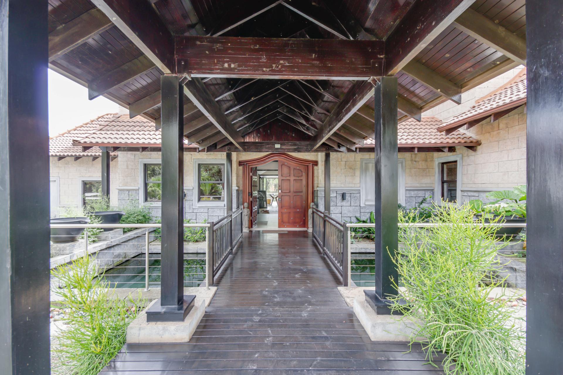 This breathtaking Balinese-style home, situated on the golf course, offers majestic views and an exceptional blend of luxury and tranquility. Upon entering, you are greeted by a serene koi pond and a grand double-volume entrance, leading to expansive open-plan living spaces that exude Asian fusion flair. The open-plan kitchen flows seamlessly into the lounge and dining areas, while the indoor patio features large glass stacking doors that frame incredible golf course views. The ground floor also includes a self-contained study with a built-in library and a spacious guest suite, perfect for visitors.