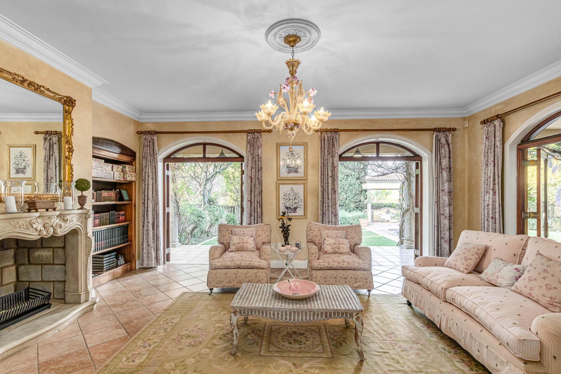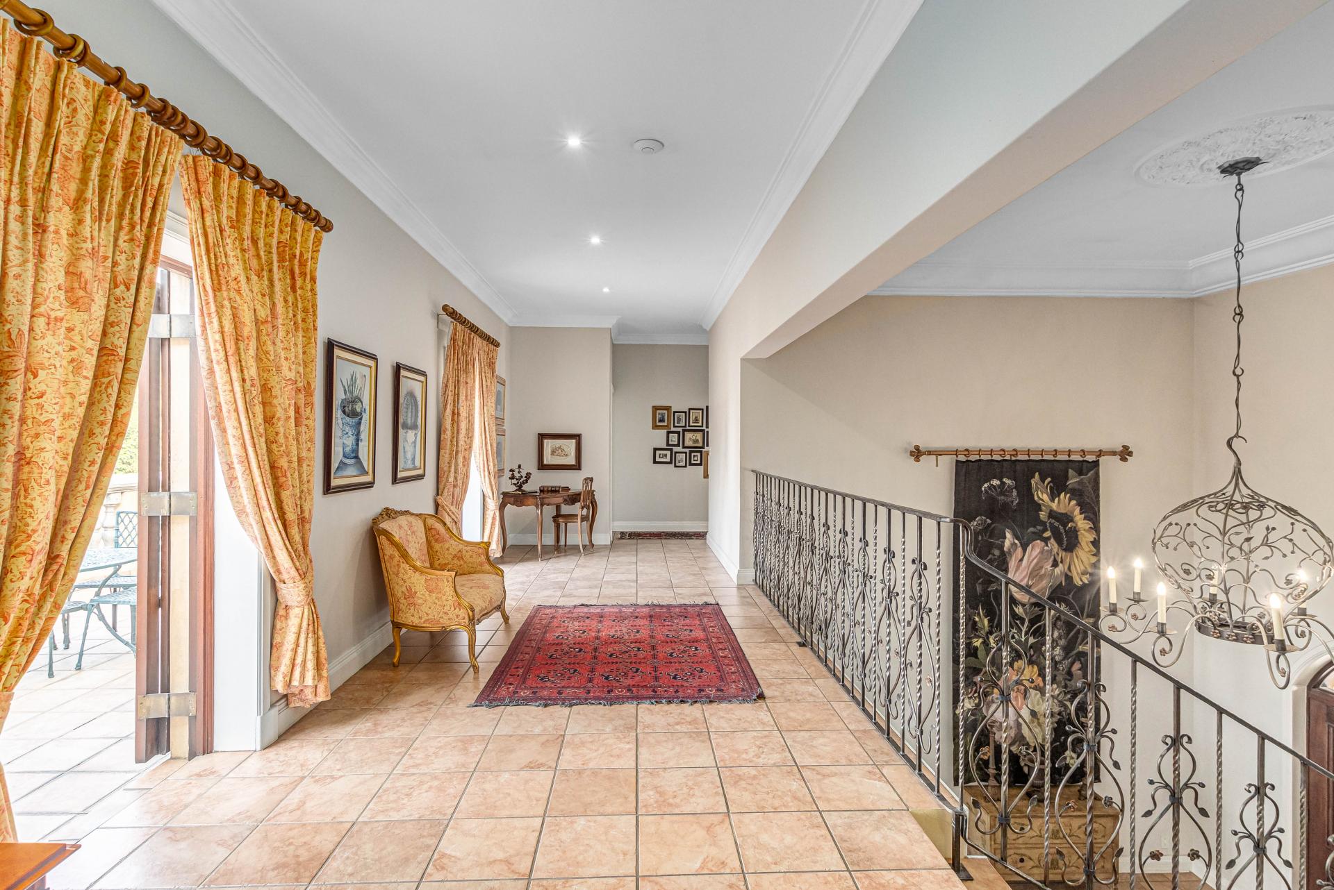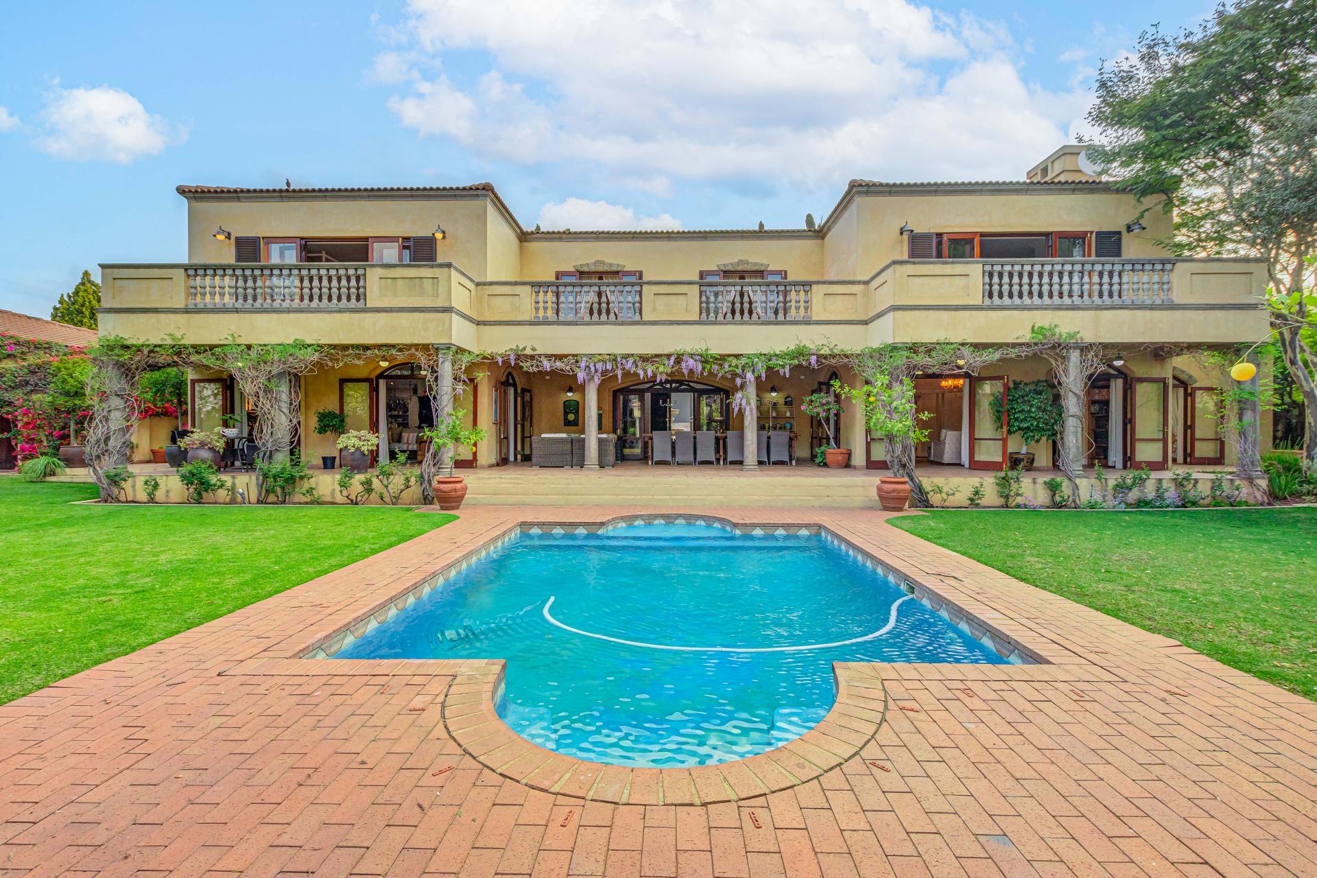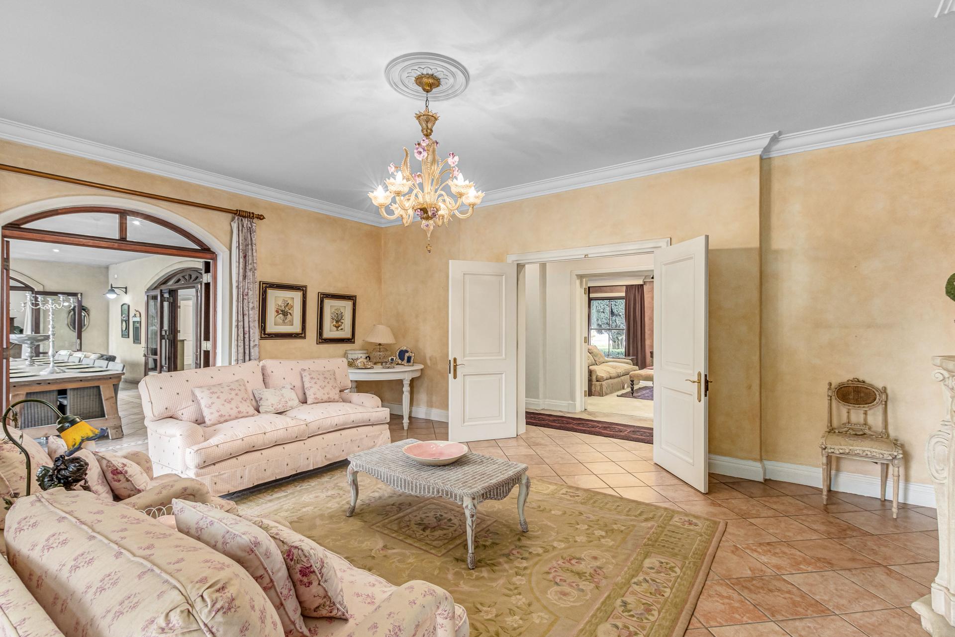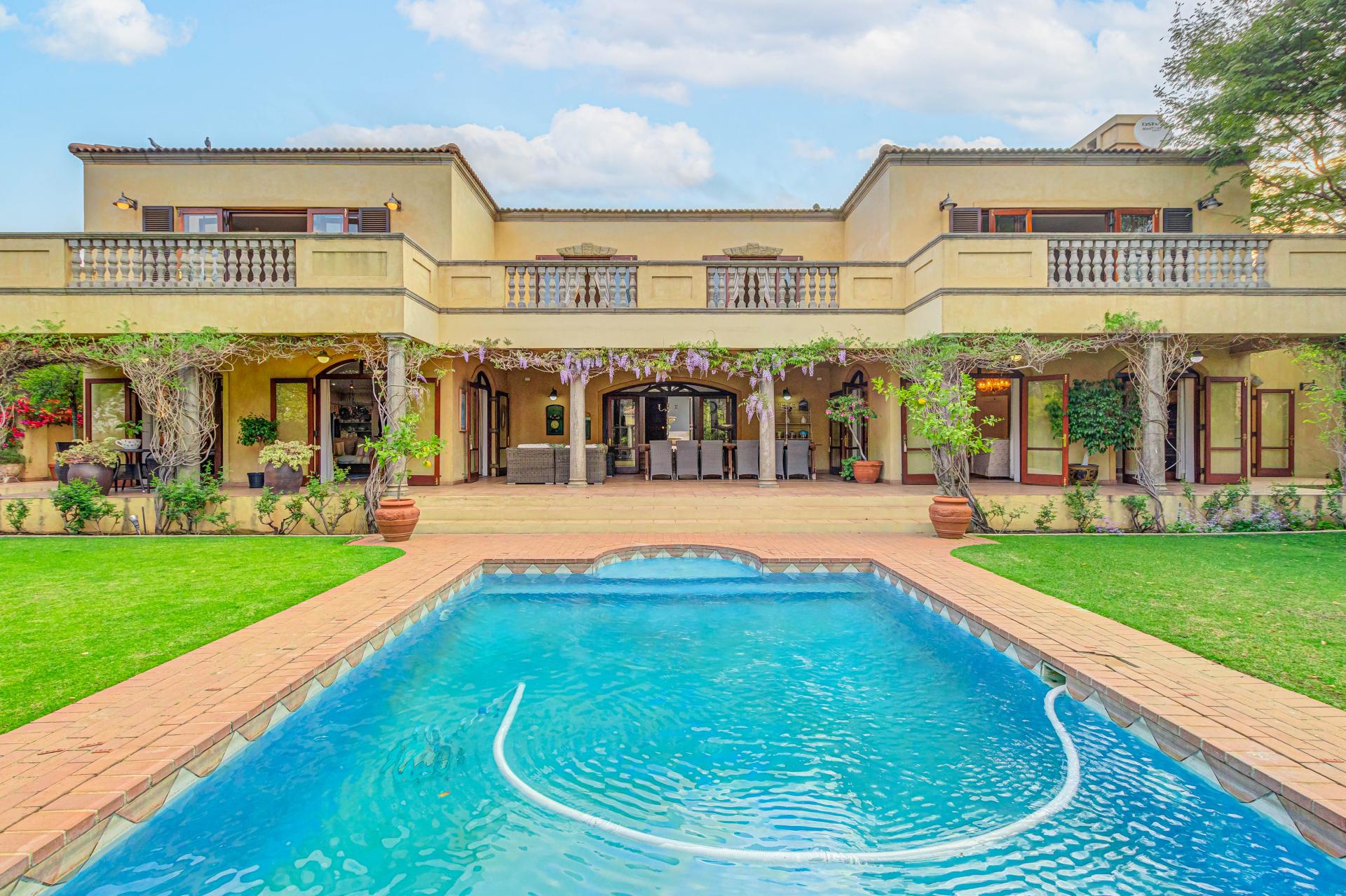 This luxurious Tuscan-style home, set on a consolidated double stand in the exclusive Dainfern Golf Estate, offers a seamless blend of elegance and functionality. The home’s architectural beauty is highlighted by its warm exterior tones, high ceilings, genuine sash windows, and imported Italian Murano chandeliers, capturing the essence of Tuscan charm.