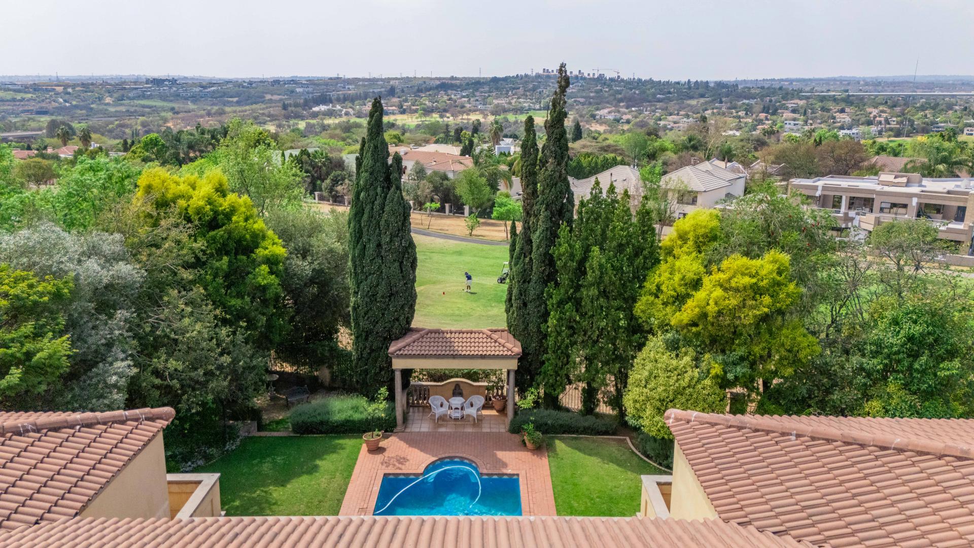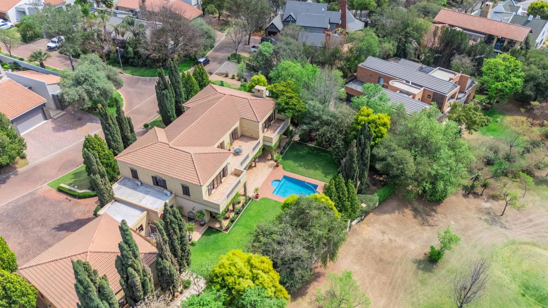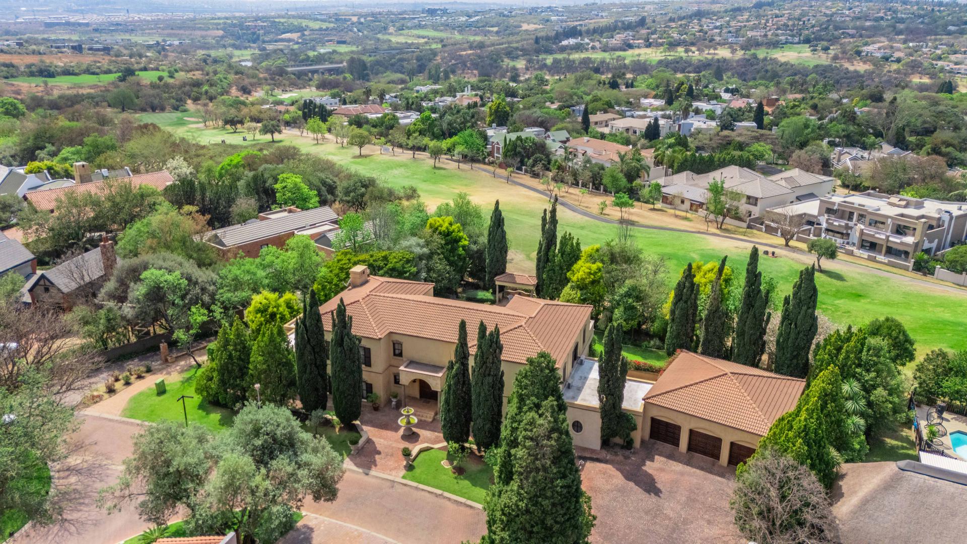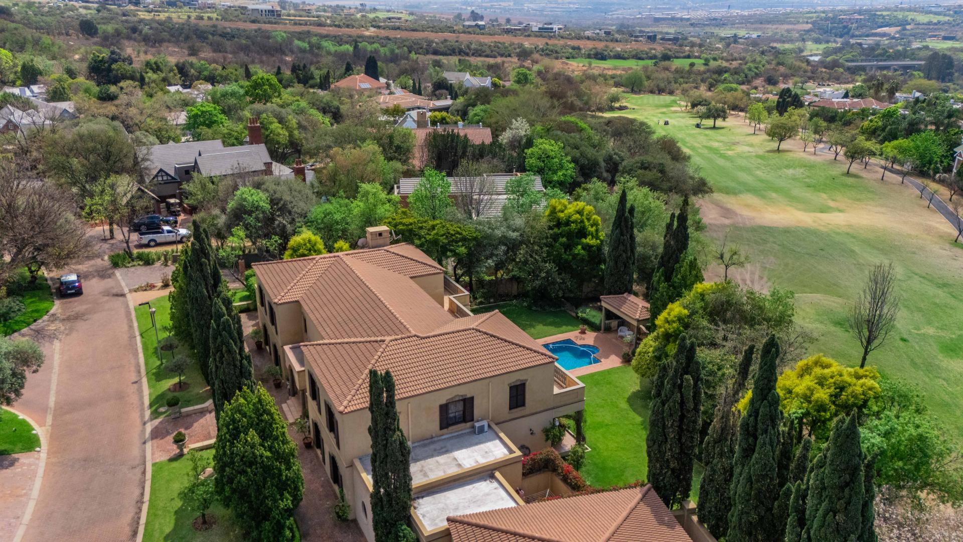 The grand entrance, framed by double wooden doors, opens up to an expansive covered patio that flows effortlessly into a beautifully landscaped garden. With a sparkling swimming pool and stunning views of the 5th fairway of the Dainfern Country Club, this outdoor space is perfect for both relaxation and entertaining.