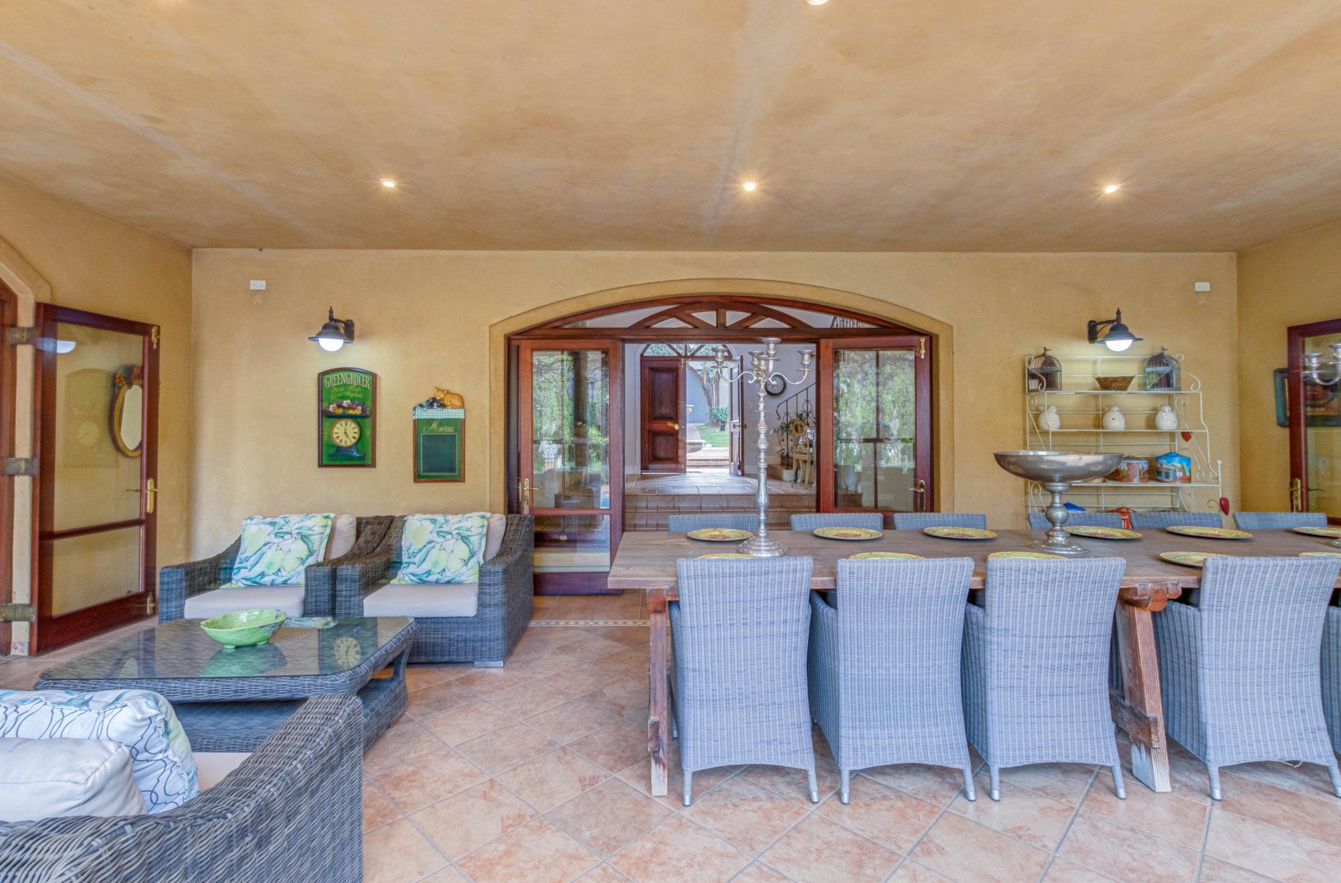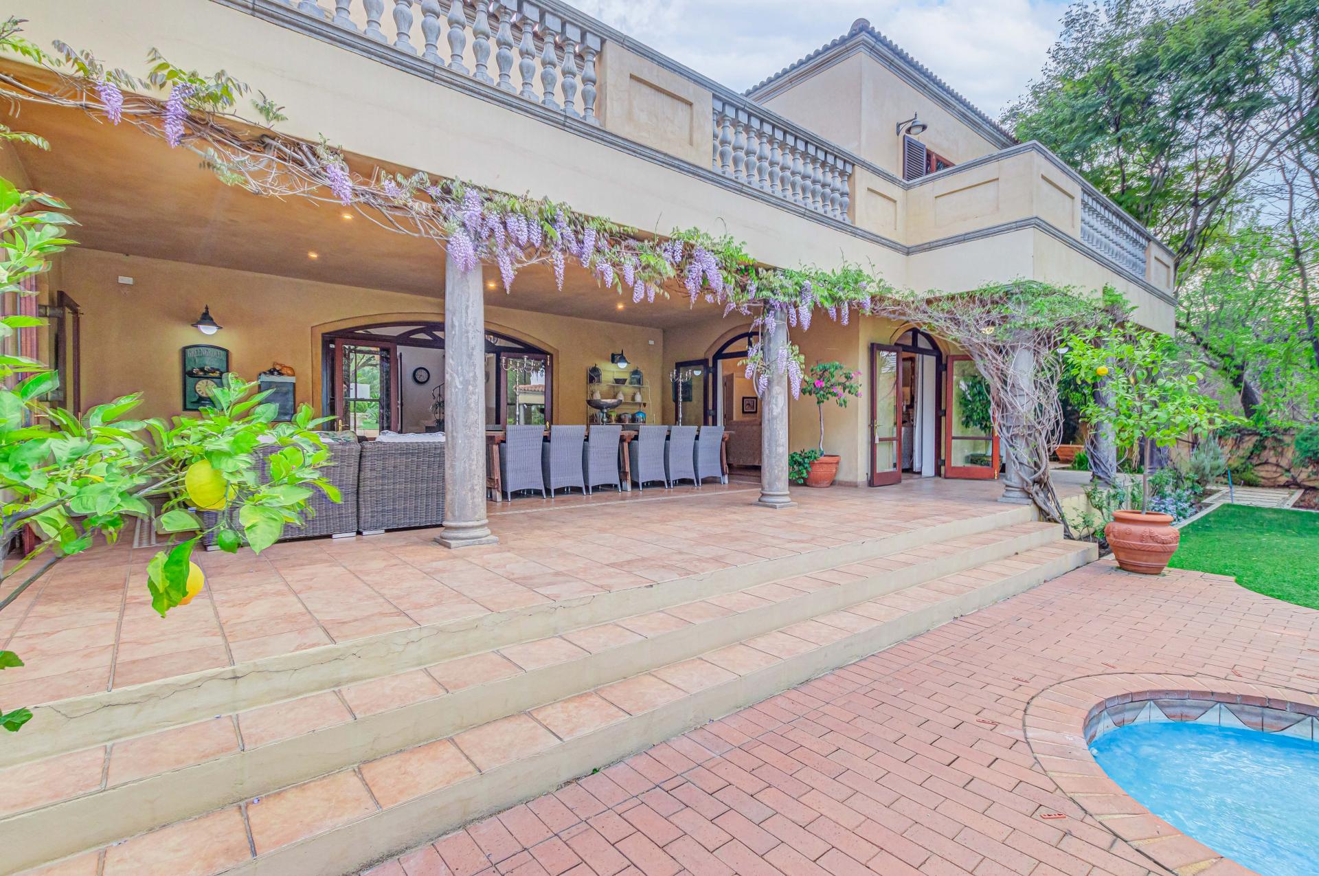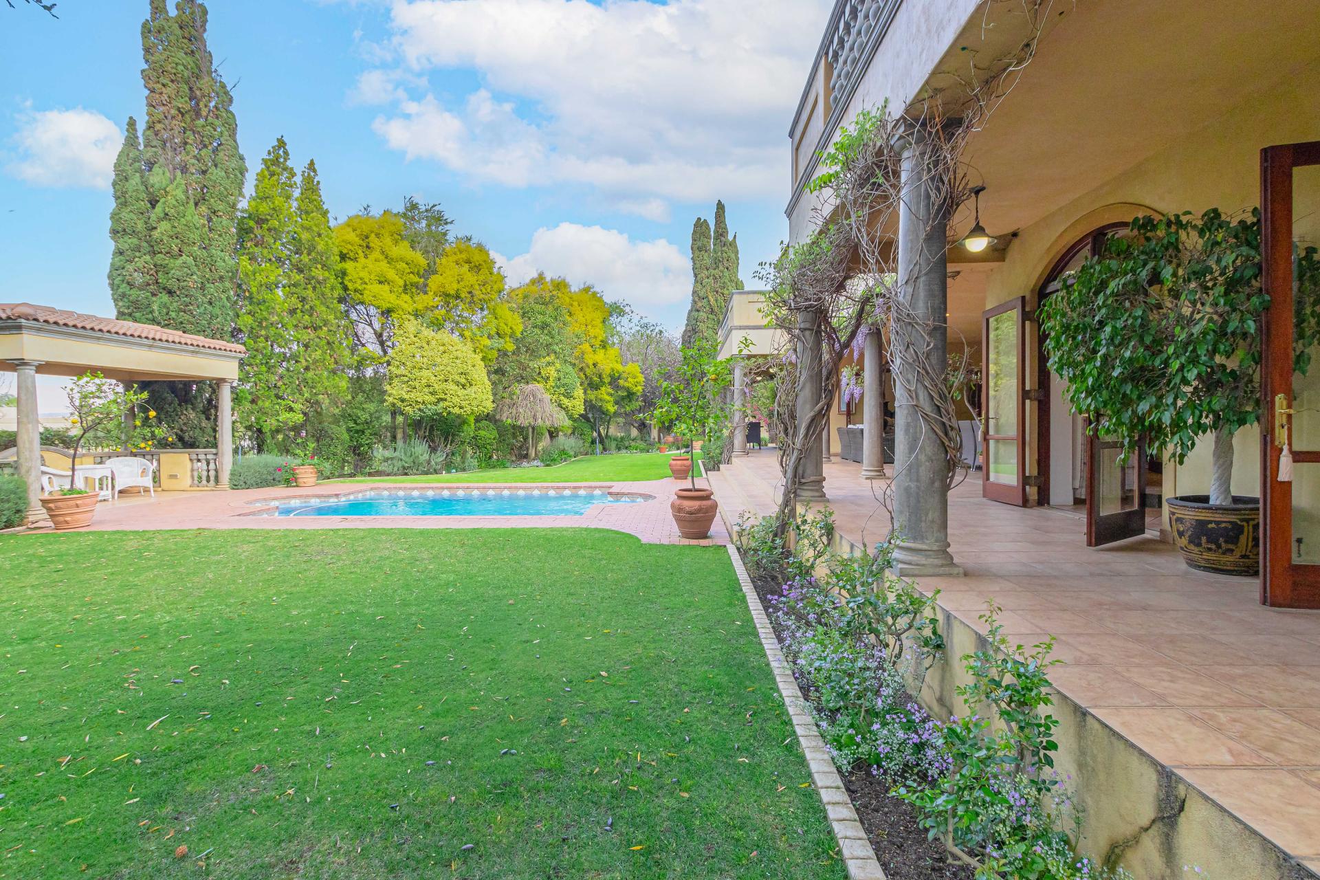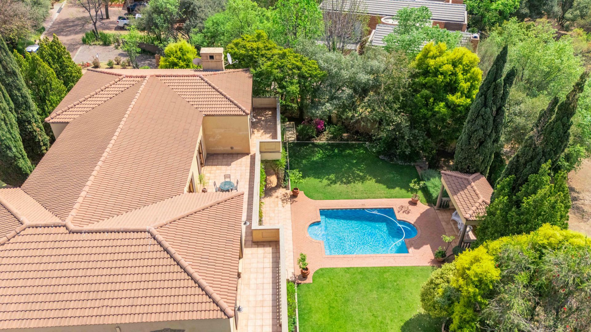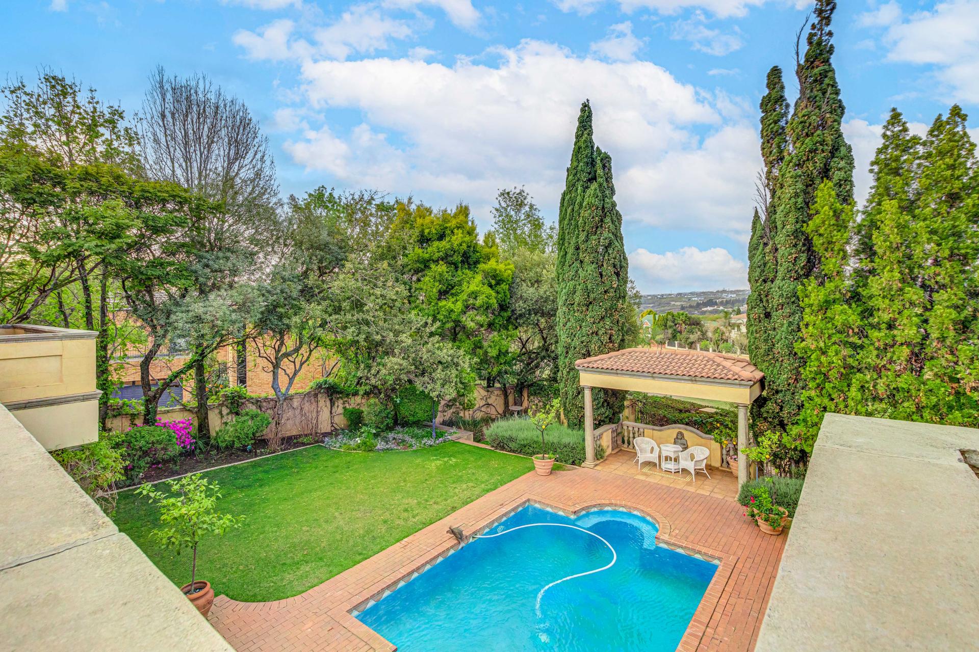 The grand entrance, framed by double wooden doors, opens up to an expansive covered patio that flows effortlessly into a beautifully landscaped garden. With a sparkling swimming pool and stunning views of the 5th fairway of the Dainfern Country Club, this outdoor space is perfect for both relaxation and entertaining.
