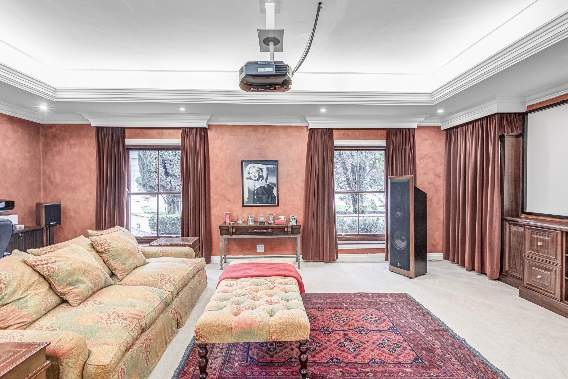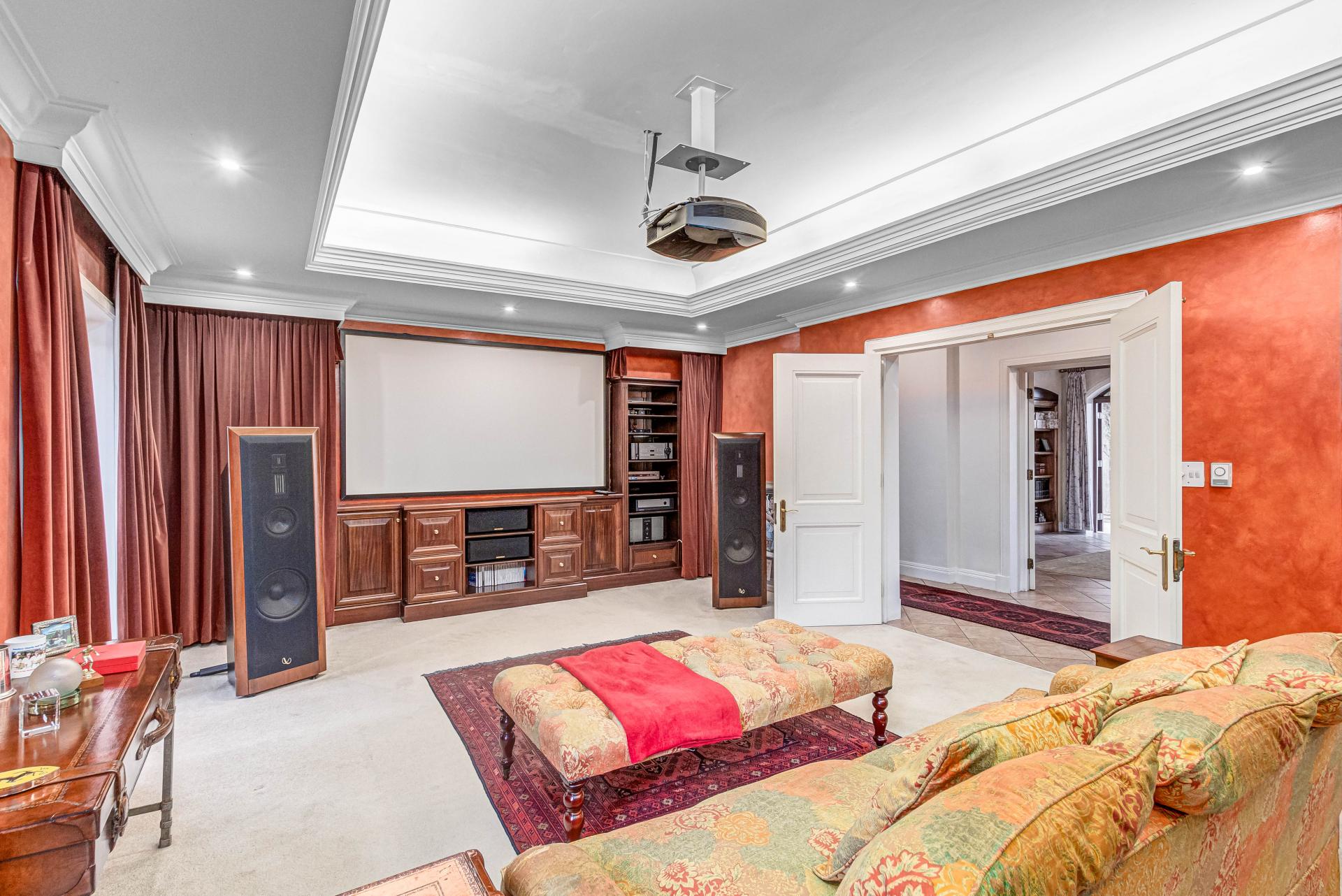 The lower level of the home is designed for ultimate comfort and entertainment, featuring a cozy library with a fireplace, a themed cinema, and multiple formal and informal living spaces, including a dining room and breakfast area. The spacious kitchen, complete with a pantry, offers a homely atmosphere for family gatherings, while the staff quarters ensure convenience and privacy.