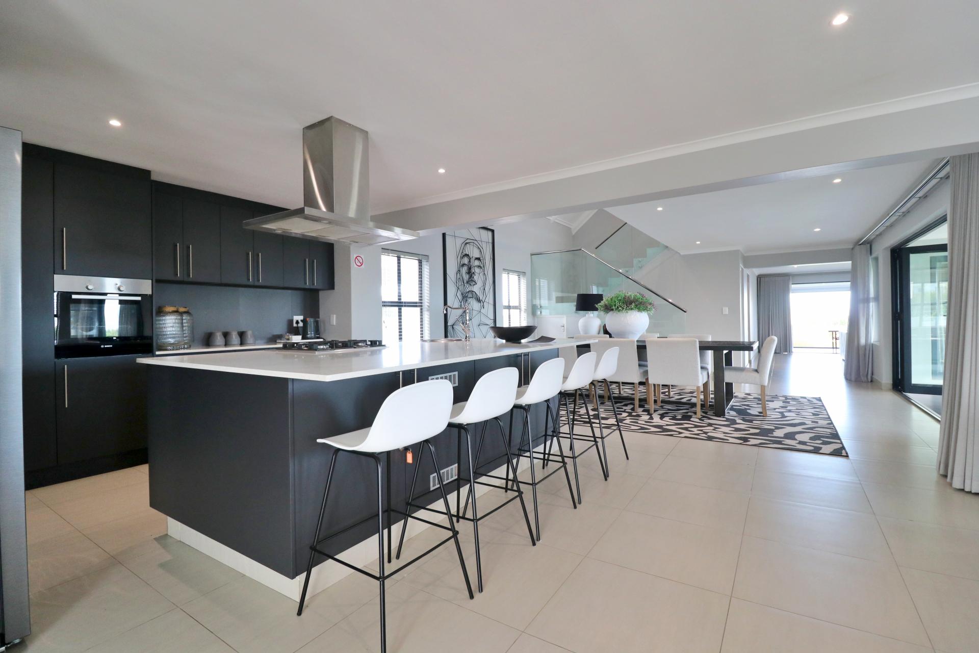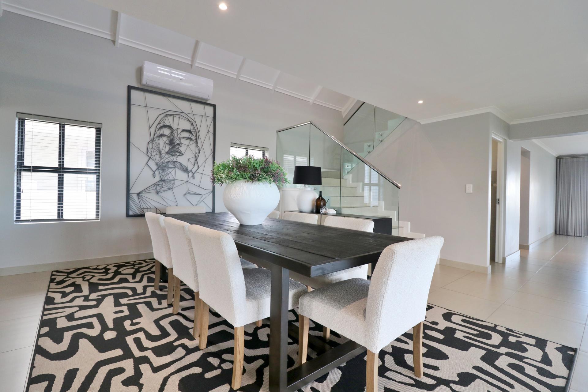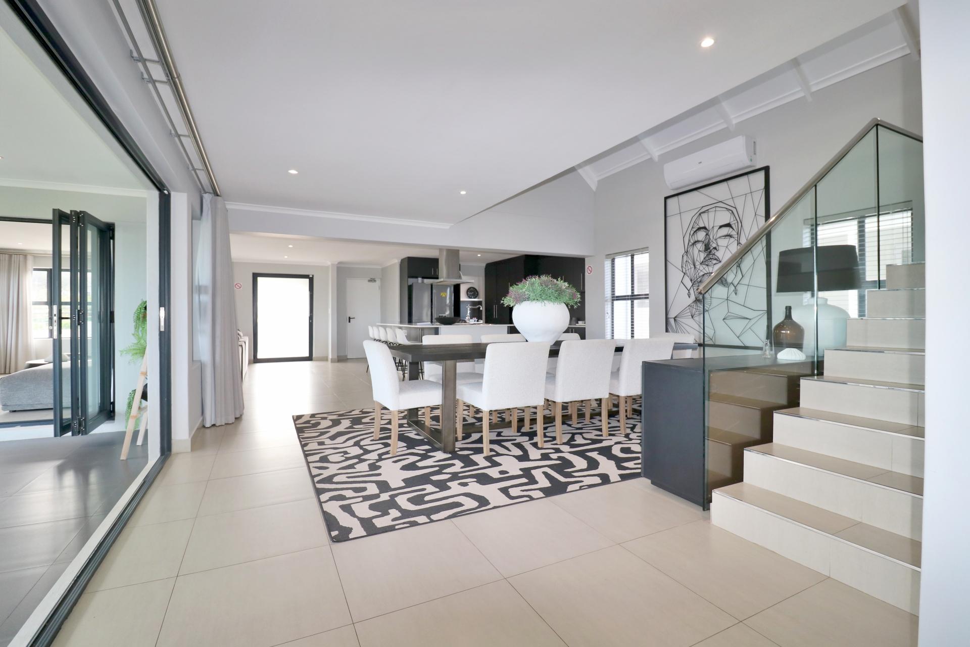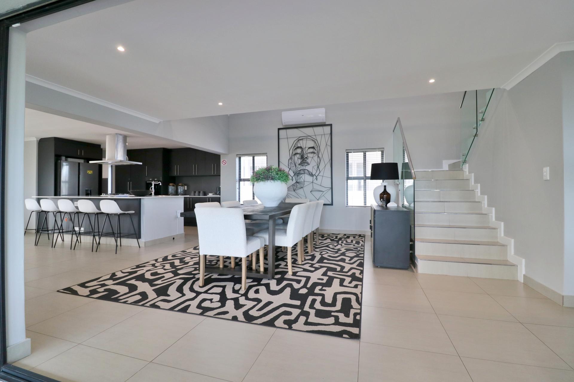Step inside to a spacious, light-filled interior where a designer kitchen takes center stage. Complete with a center island, gas hob, eye-level oven, and separate scullery, it flows seamlessly into the expansive dining space where a bold staircase of glass and steel rises like a modern artwork, setting the tone for the home’s contemporary sophistication. The living room, with its inviting fireplace, extends onto a large enclosed patio with stacker doors that connect to the garden. A second entertainment lounge with an indoor braai leads to yet another enclosed patio, both spaces flowing into the lush back garden and tranquil greenbelt beyond.
