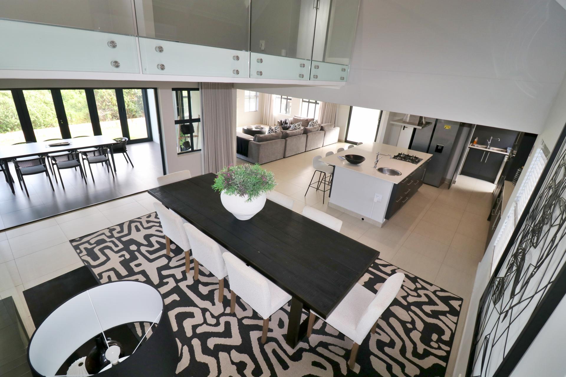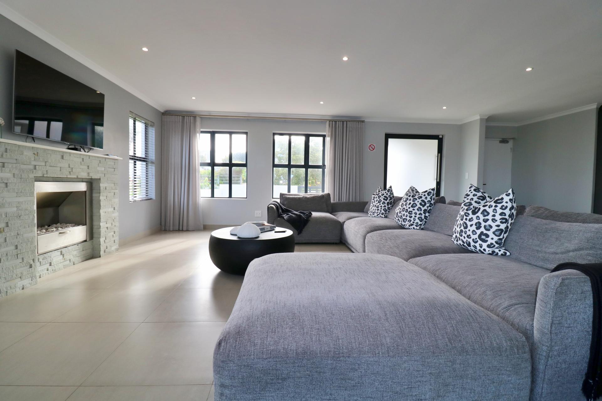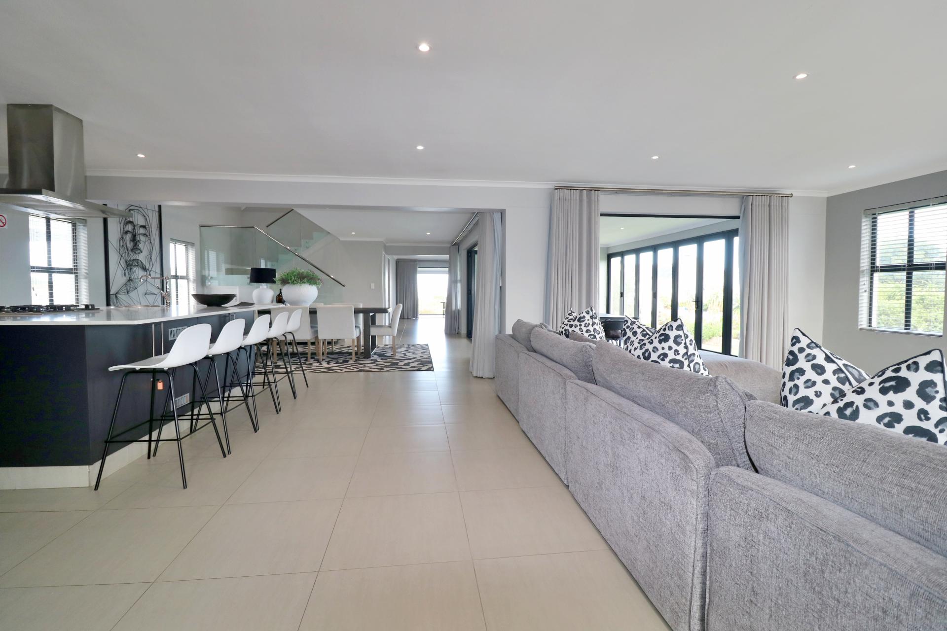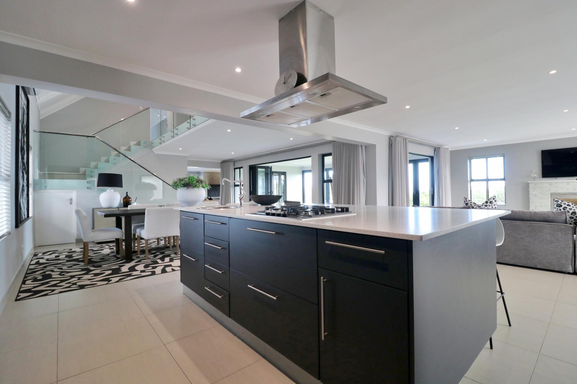 Step inside to a spacious, light-filled interior where a designer kitchen takes center stage. Complete with a center island, gas hob, eye-level oven, and separate scullery, it flows seamlessly into the expansive dining space where a bold staircase of glass and steel rises like a modern artwork, setting the tone for the home’s contemporary sophistication. The living room, with its inviting fireplace, extends onto a large enclosed patio with stacker doors that connect to the garden. A second entertainment lounge with an indoor braai leads to yet another enclosed patio, both spaces flowing into the lush back garden and tranquil greenbelt beyond.