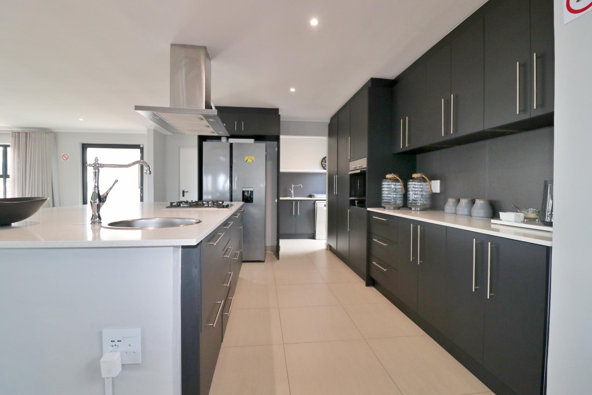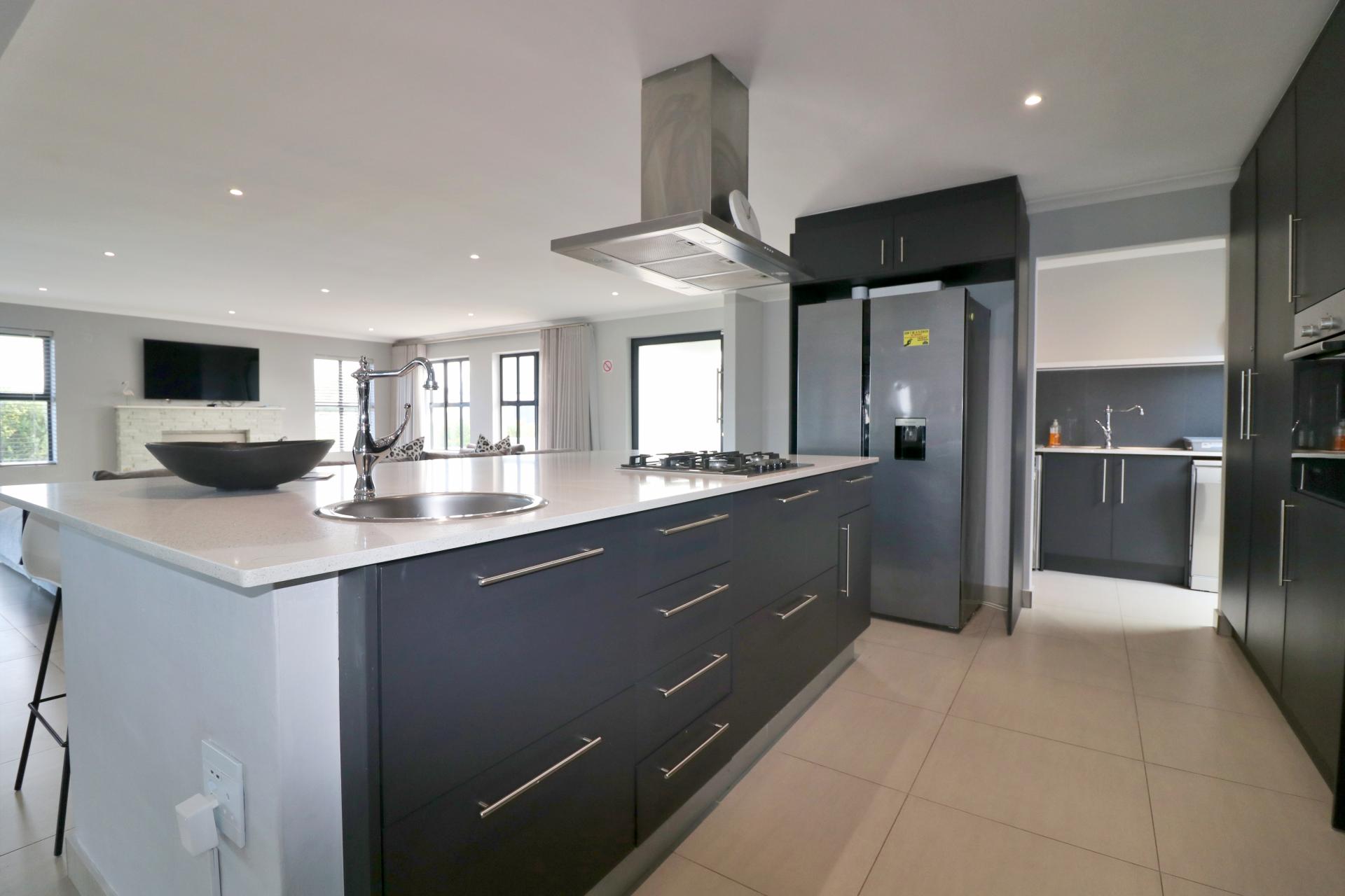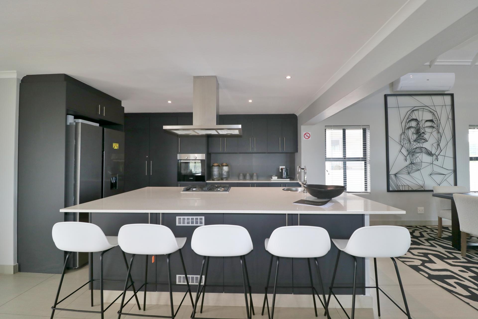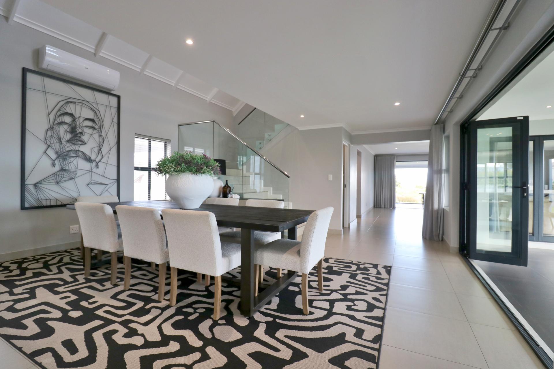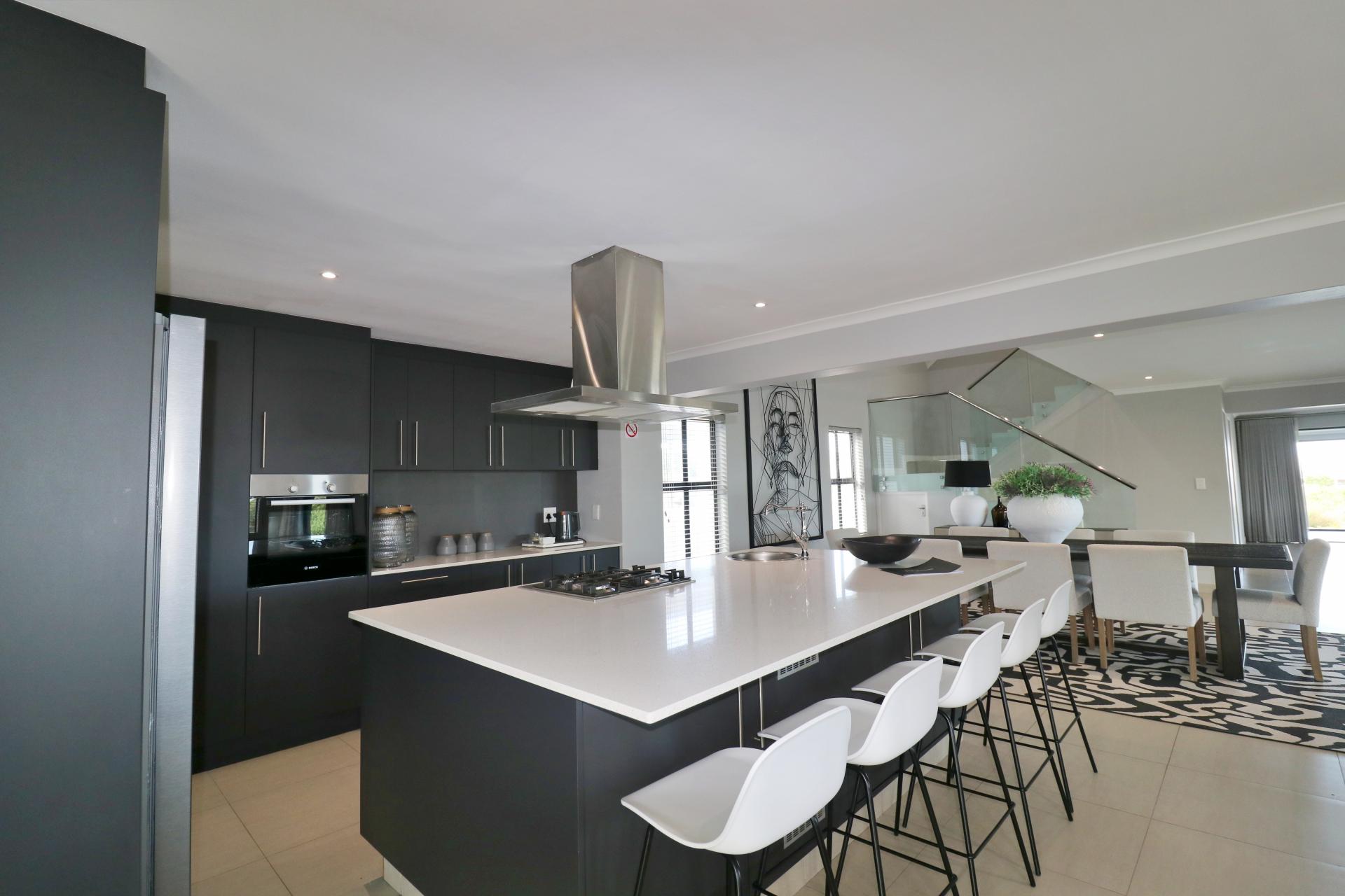 Step inside to a spacious, light-filled interior where a designer kitchen takes center stage. Complete with a center island, gas hob, eye-level oven, and separate scullery, it flows seamlessly into the expansive dining space where a bold staircase of glass and steel rises like a modern artwork, setting the tone for the home’s contemporary sophistication. The living room, with its inviting fireplace, extends onto a large enclosed patio with stacker doors that connect to the garden. A second entertainment lounge with an indoor braai leads to yet another enclosed patio, both spaces flowing into the lush back garden and tranquil greenbelt beyond.