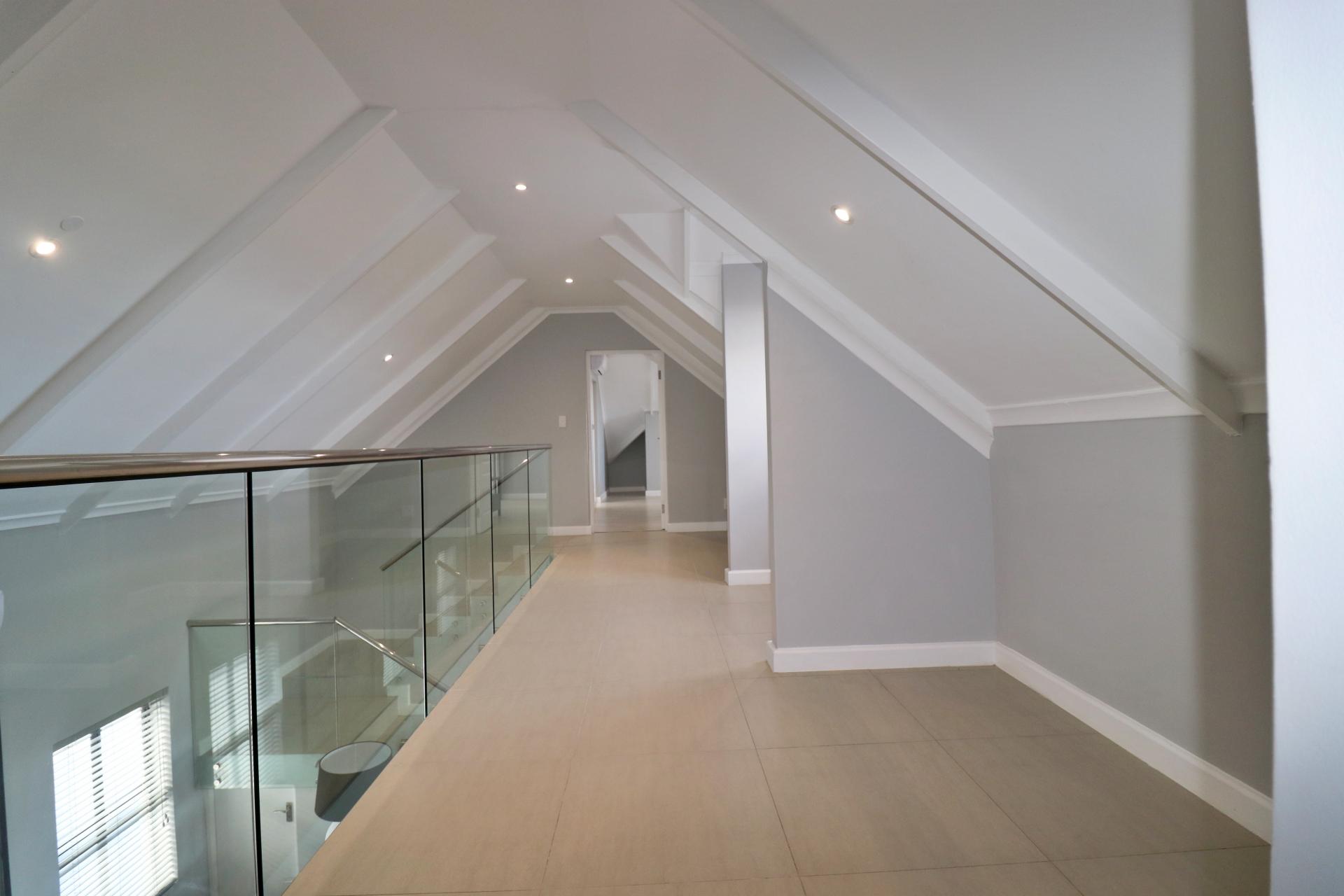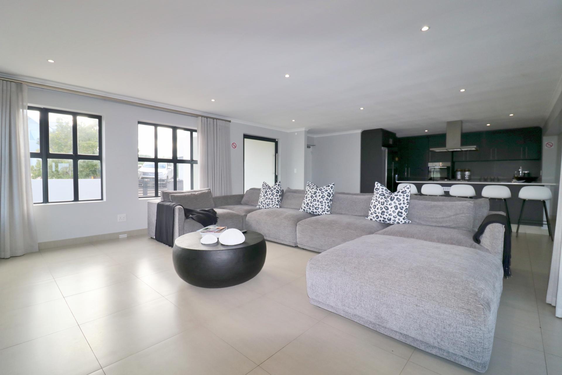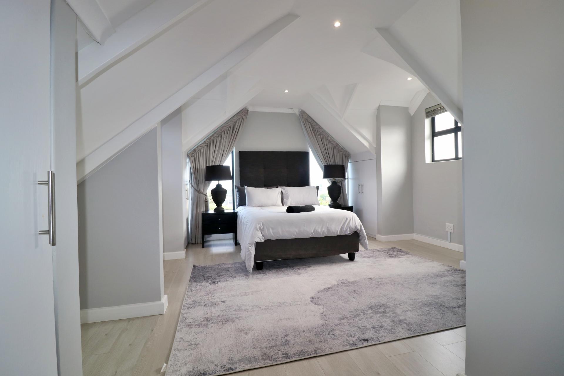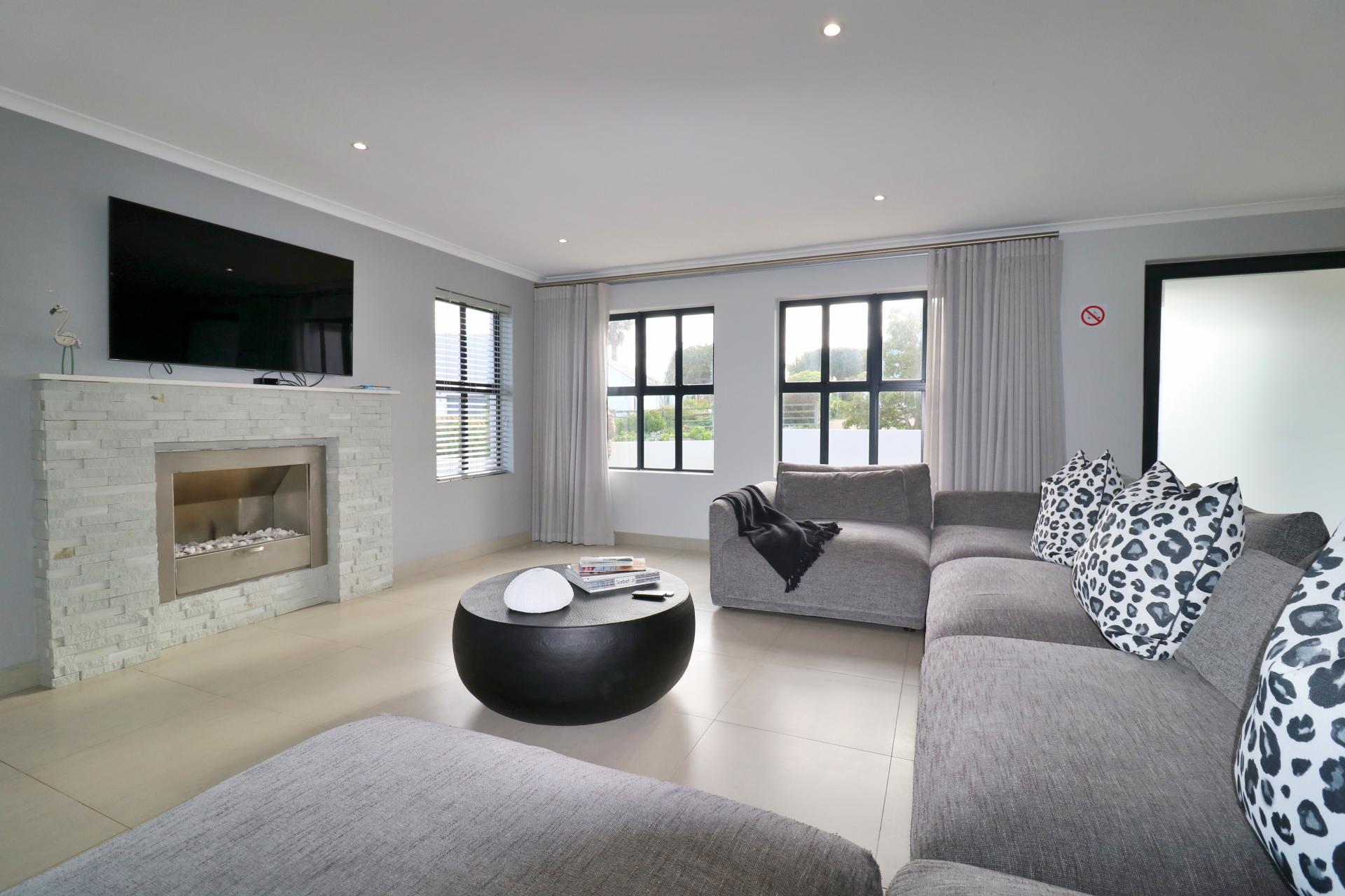Step inside to a spacious, light-filled interior where a designer kitchen takes center stage. Complete with a center island, gas hob, eye-level oven, and separate scullery, it flows seamlessly into the expansive dining space where a bold staircase of glass and steel rises like a modern artwork, setting the tone for the home’s contemporary sophistication. The living room, with its inviting fireplace, extends onto a large enclosed patio with stacker doors that connect to the garden. A second entertainment lounge with an indoor braai leads to yet another enclosed patio, both spaces flowing into the lush back garden and tranquil greenbelt beyond.