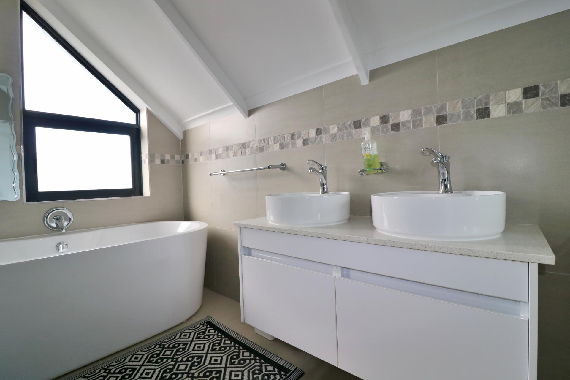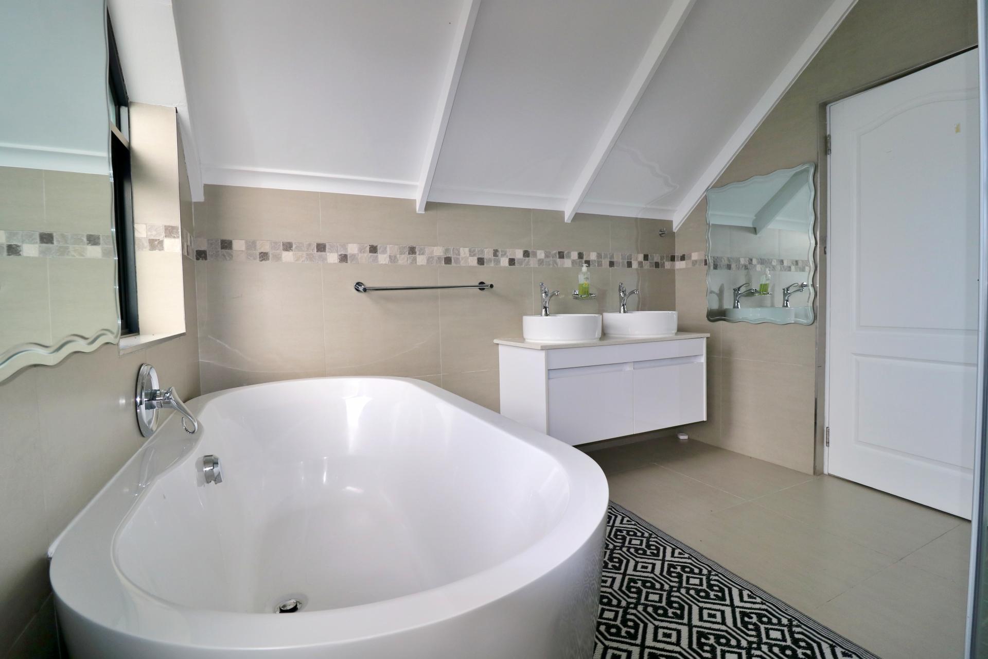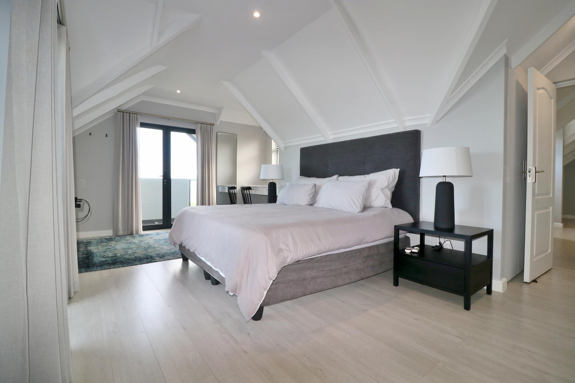 Accommodation includes four beautifully appointed bedrooms. A private guest suite downstairs offers built-in cupboards and an en-suite bathroom. Upstairs, a striking glass bridge links two bedrooms with a shared bathroom to the sea-facing master retreat. The main suite enjoys panoramic views, a luxury en-suite with double vanities, and a serene sense of privacy.
