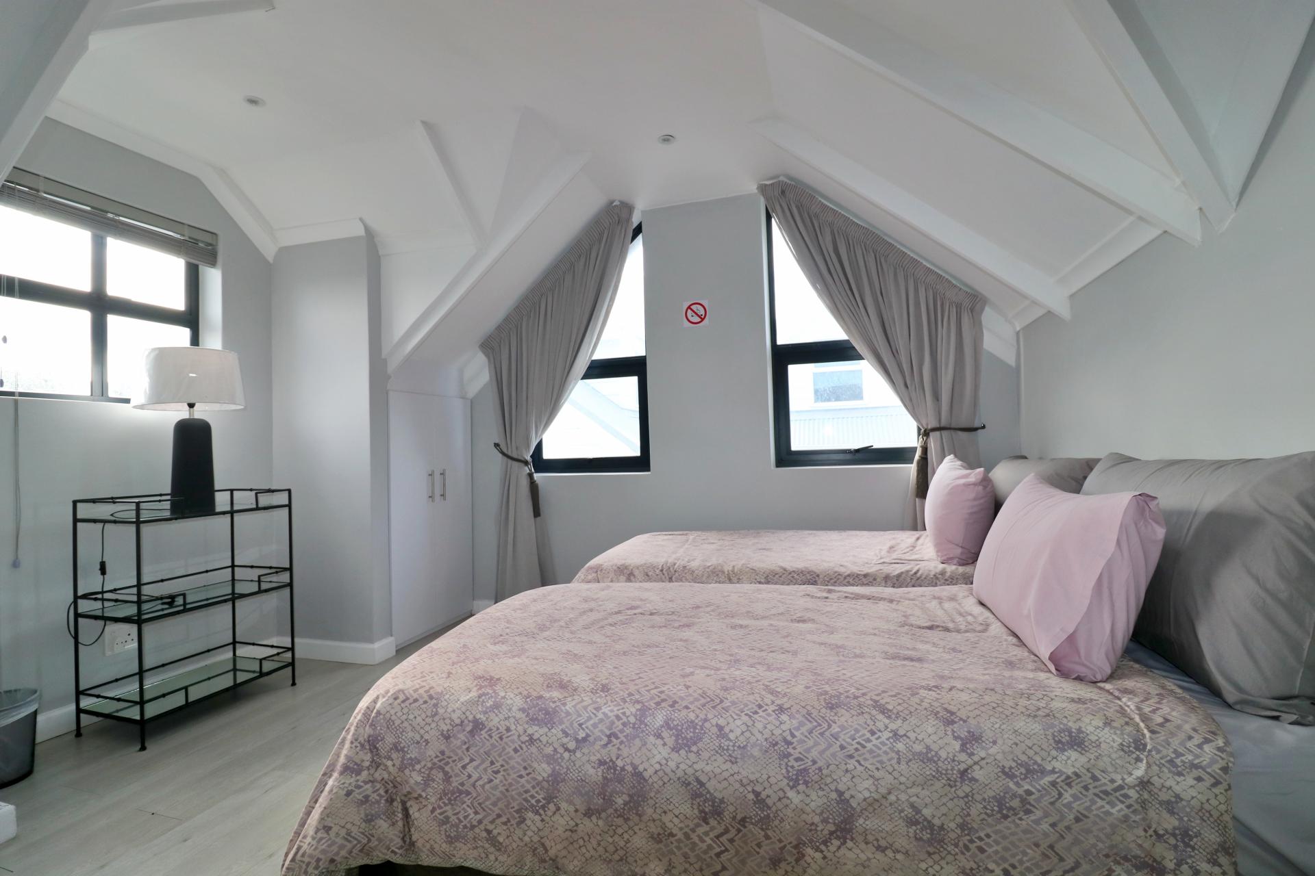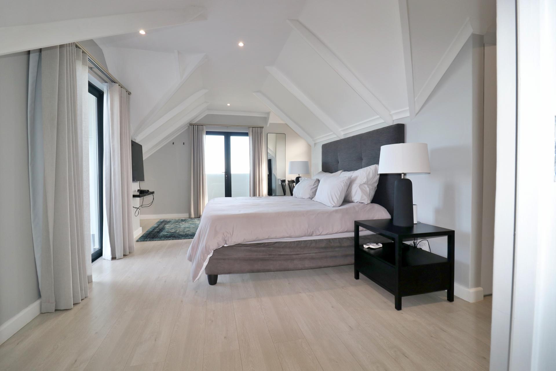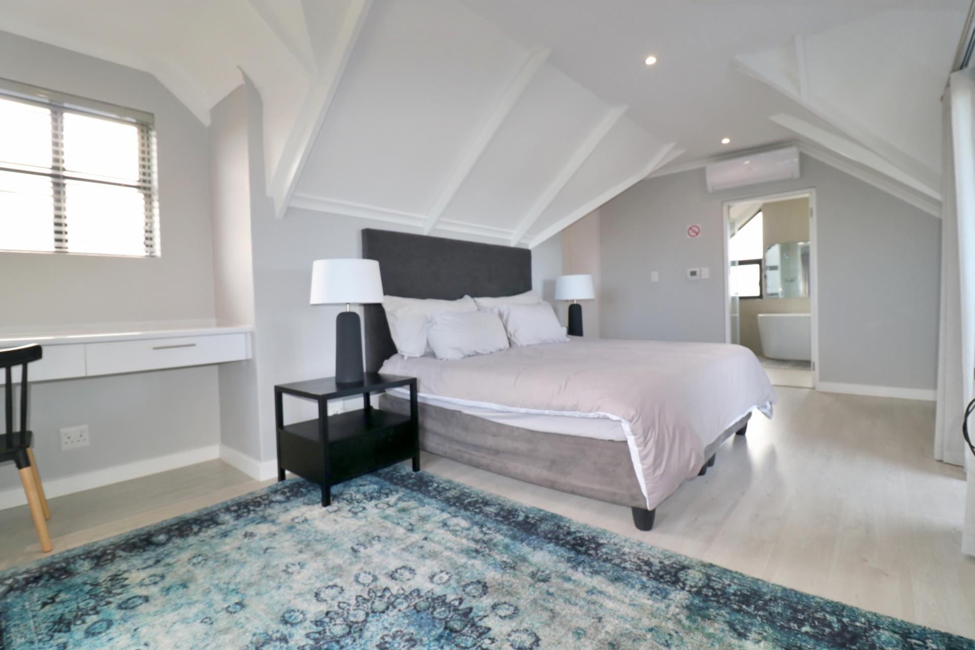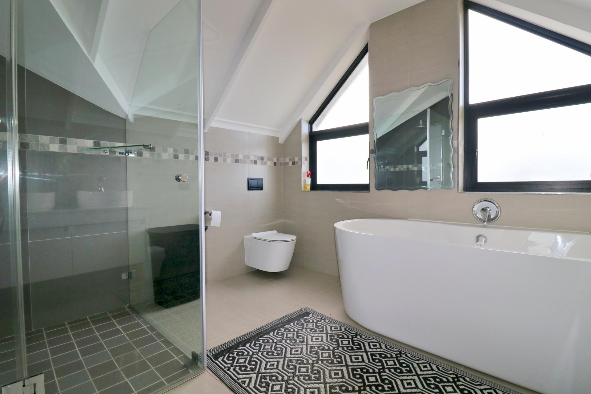 Accommodation includes four beautifully appointed bedrooms. A private guest suite downstairs offers built-in cupboards and an en-suite bathroom. Upstairs, a striking glass bridge links two bedrooms with a shared bathroom to the sea-facing master retreat. The main suite enjoys panoramic views, a luxury en-suite with double vanities, and a serene sense of privacy.