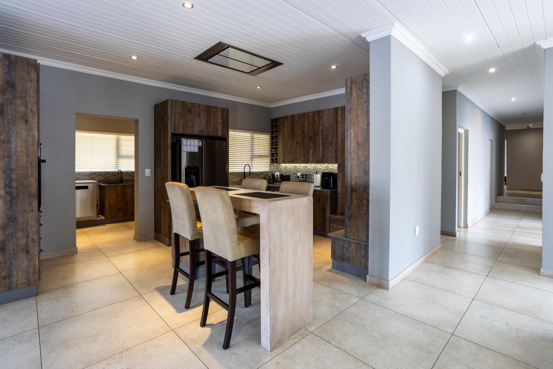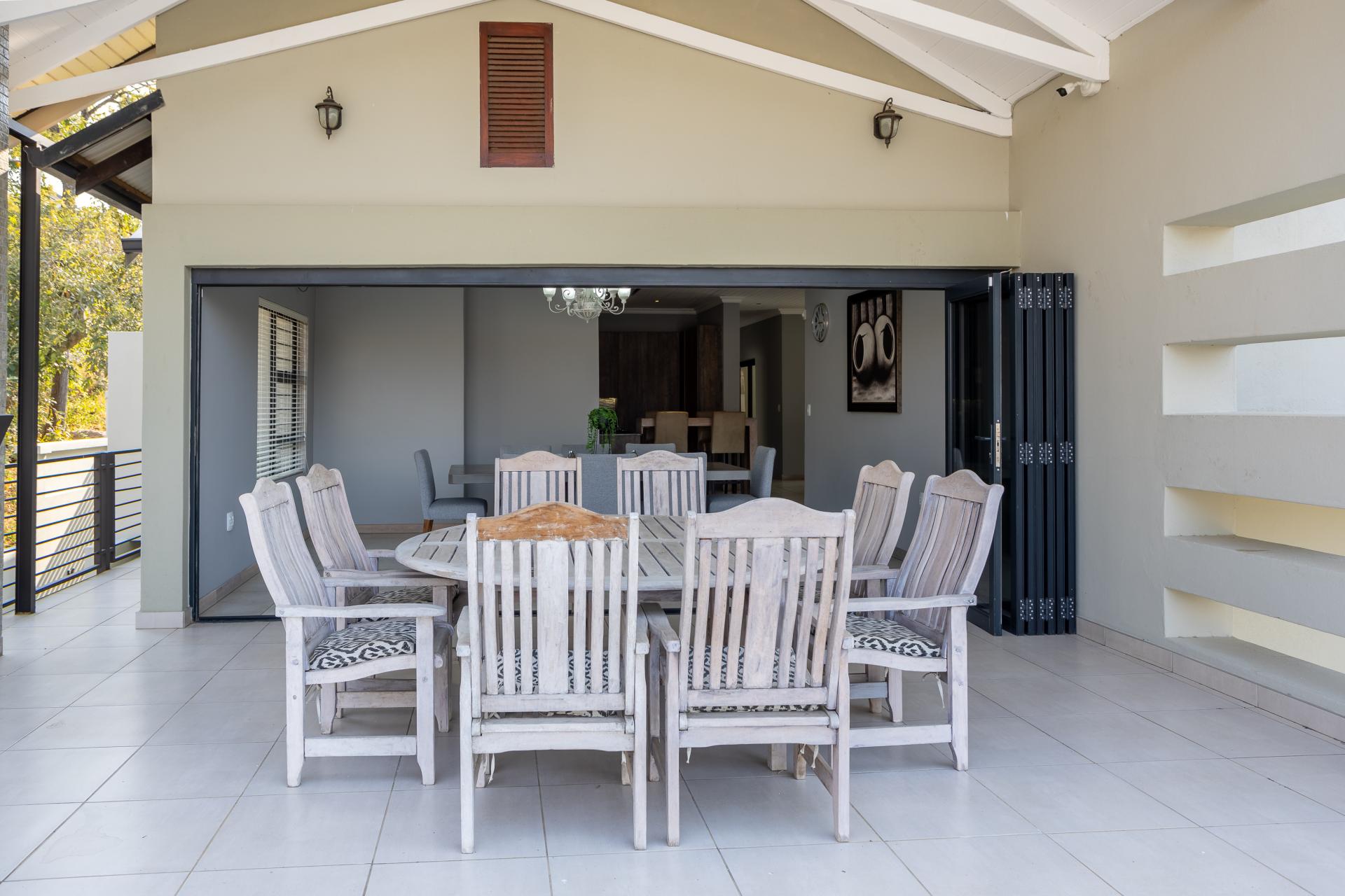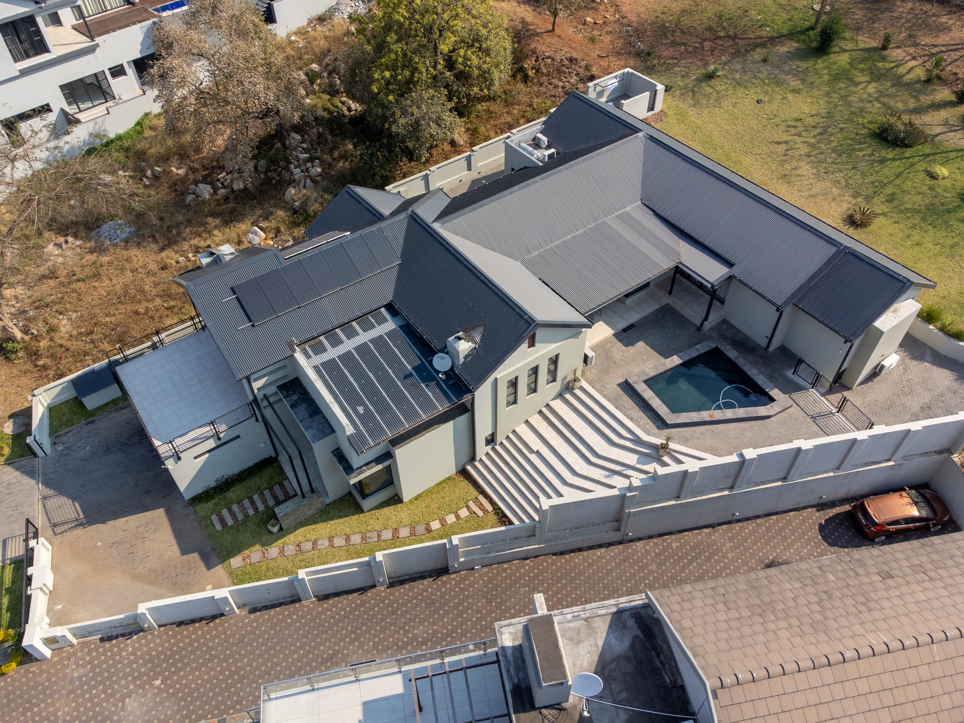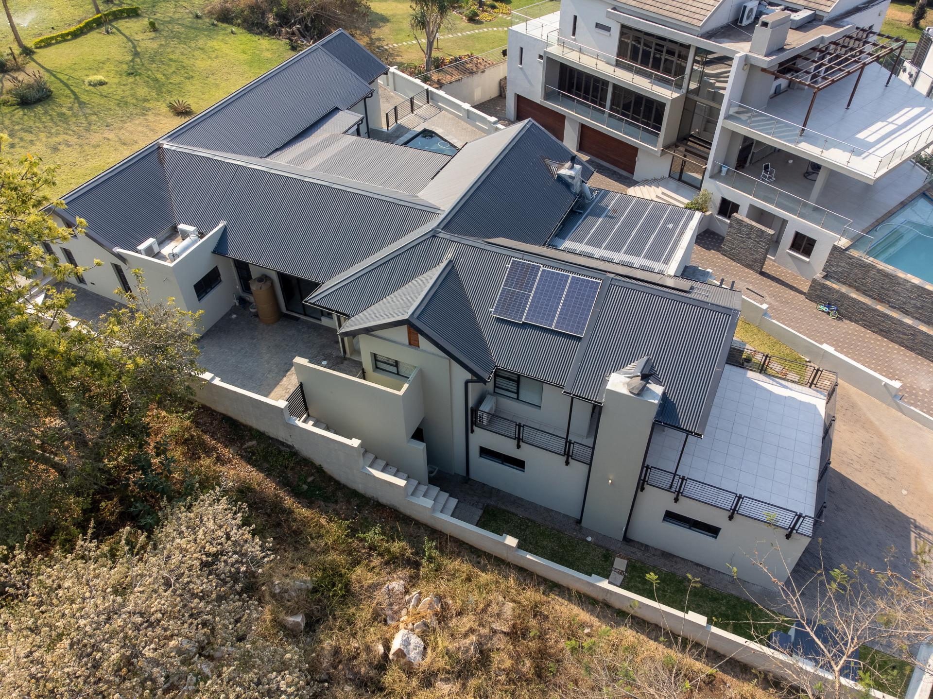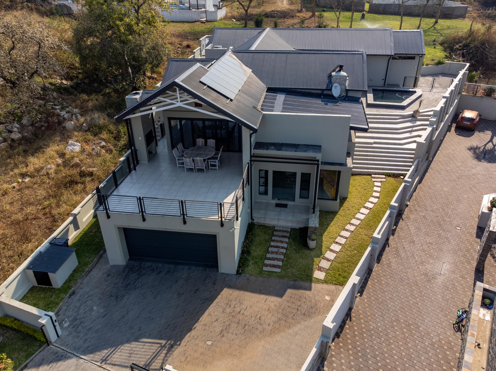 Located in one of the Lowveld’s most sought-after lifestyle estates offers luxury, comfort,sophistication, and safety. Each bedroom is en-suite, with the main featuring a dressing room and full bathroom with double basins. The open-plan living, dining, and kitchen areas flow seamlessly to a covered balcony with breathtaking views, while a central swimming pool is accessible from both the main bedroom and living area. Additional features include a study, cinema, guest ablution, staff quarters, storeroom, scullery, pantry, and garage for four vehicles. With solar, water tank, and premium finishes, this beautifully planned home epitomizes modern estate living.