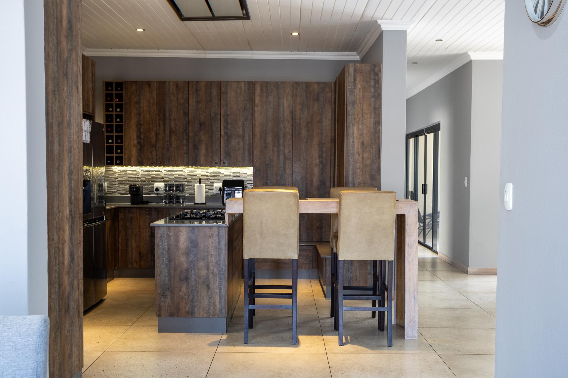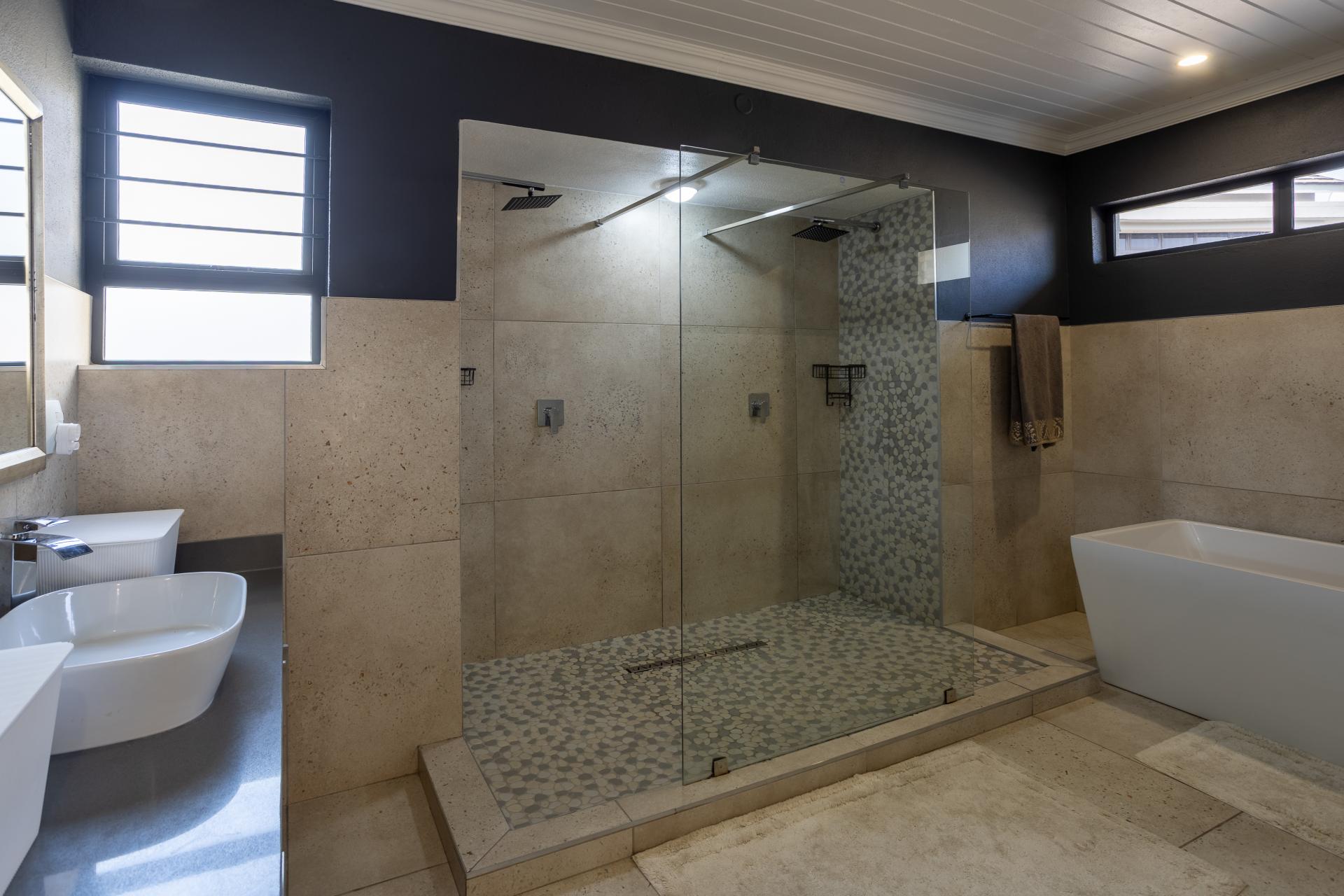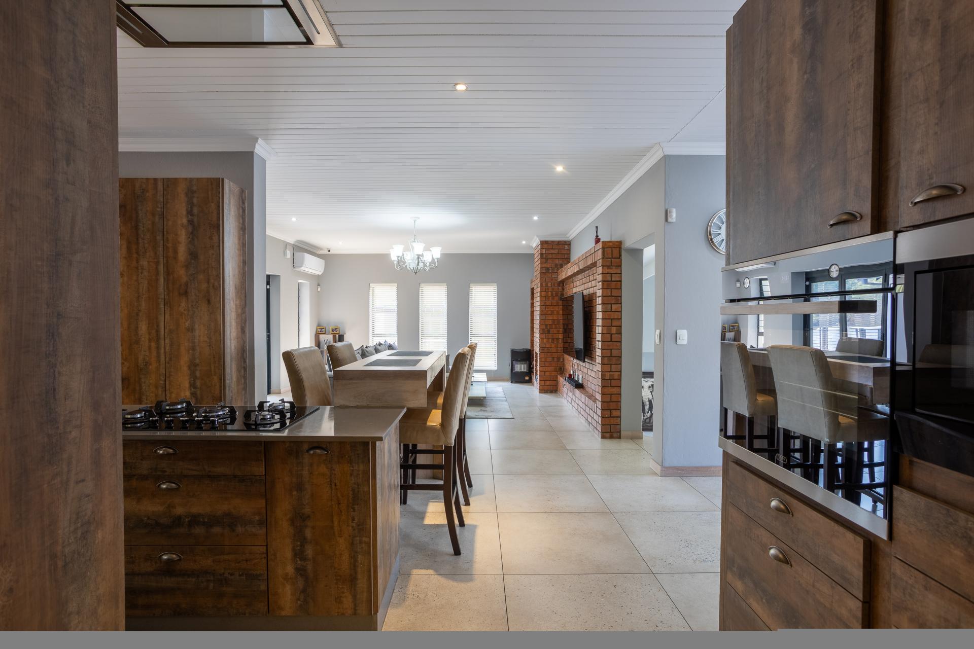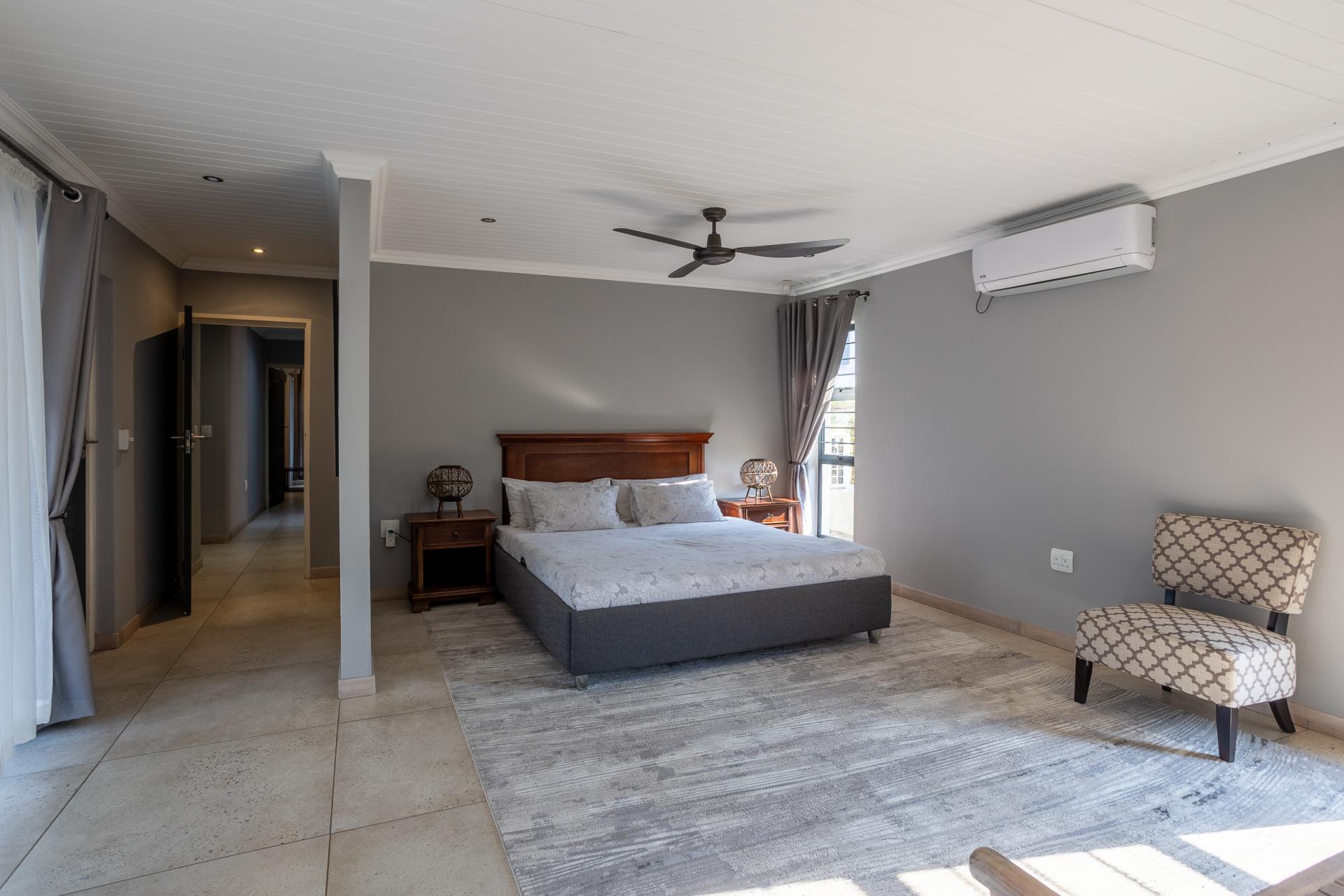 Located in one of the Lowveld’s most sought-after lifestyle estates offers luxury, comfort,sophistication, and safety. Each bedroom is en-suite, with the main featuring a dressing room and full bathroom with double basins. The open-plan living, dining, and kitchen areas flow seamlessly to a covered balcony with breathtaking views, while a central swimming pool is accessible from both the main bedroom and living area. Additional features include a study, cinema, guest ablution, staff quarters, storeroom, scullery, pantry, and garage for four vehicles. With solar, water tank, and premium finishes, this beautifully planned home epitomizes modern estate living.