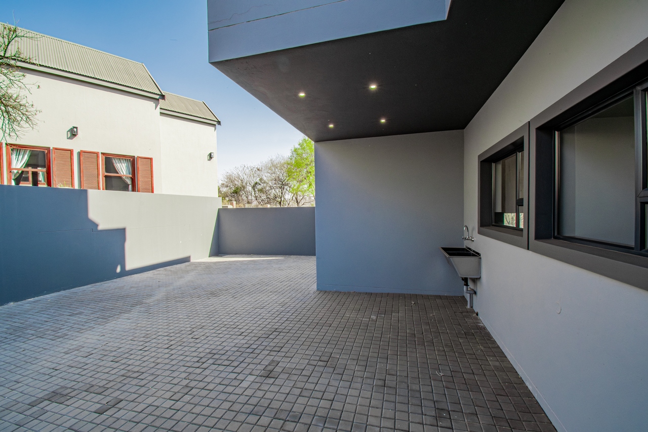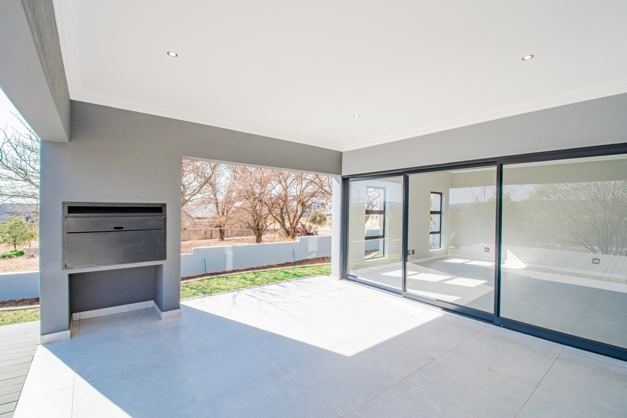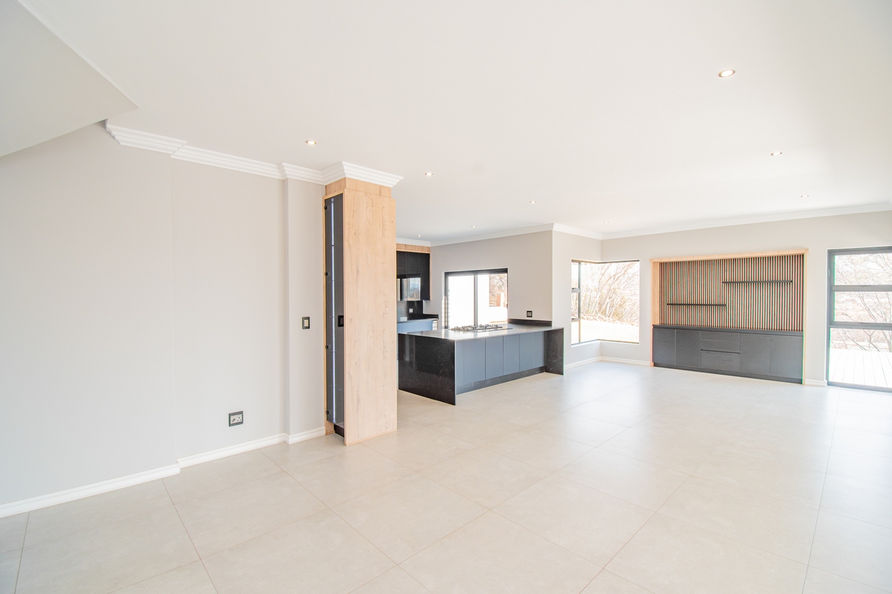 The two spacious living areas flow seamlessly onto a patio with a built-in braai, creating an ideal setting for indoor-outdoor living. This harmonious design perfectly balances comfort with the estate's natural beauty, making it perfect for entertaining or simply unwinding in a serene environment.