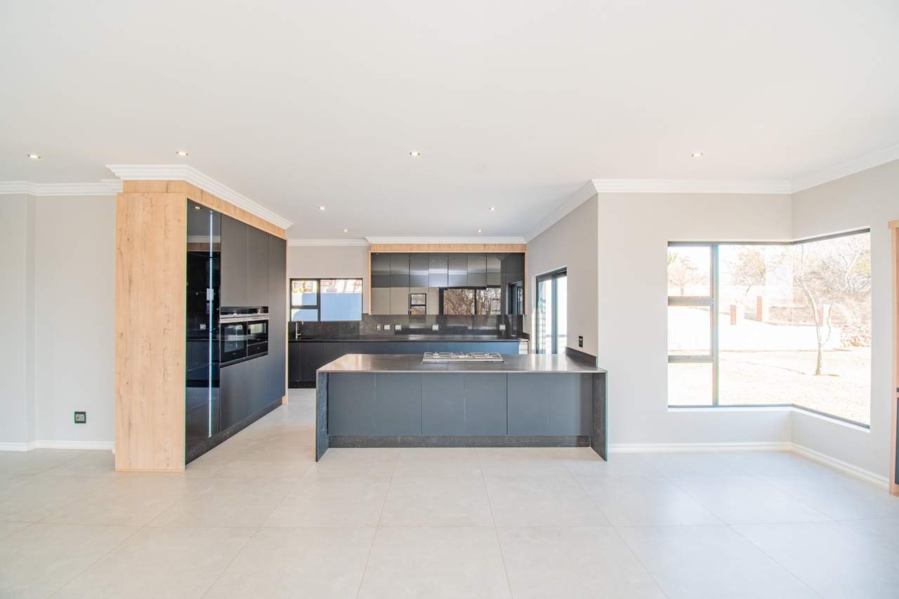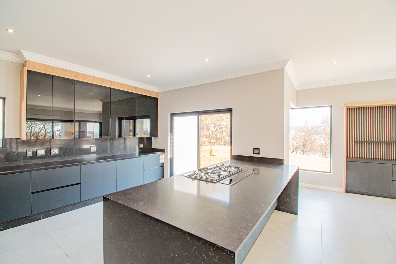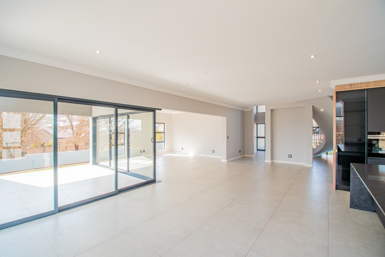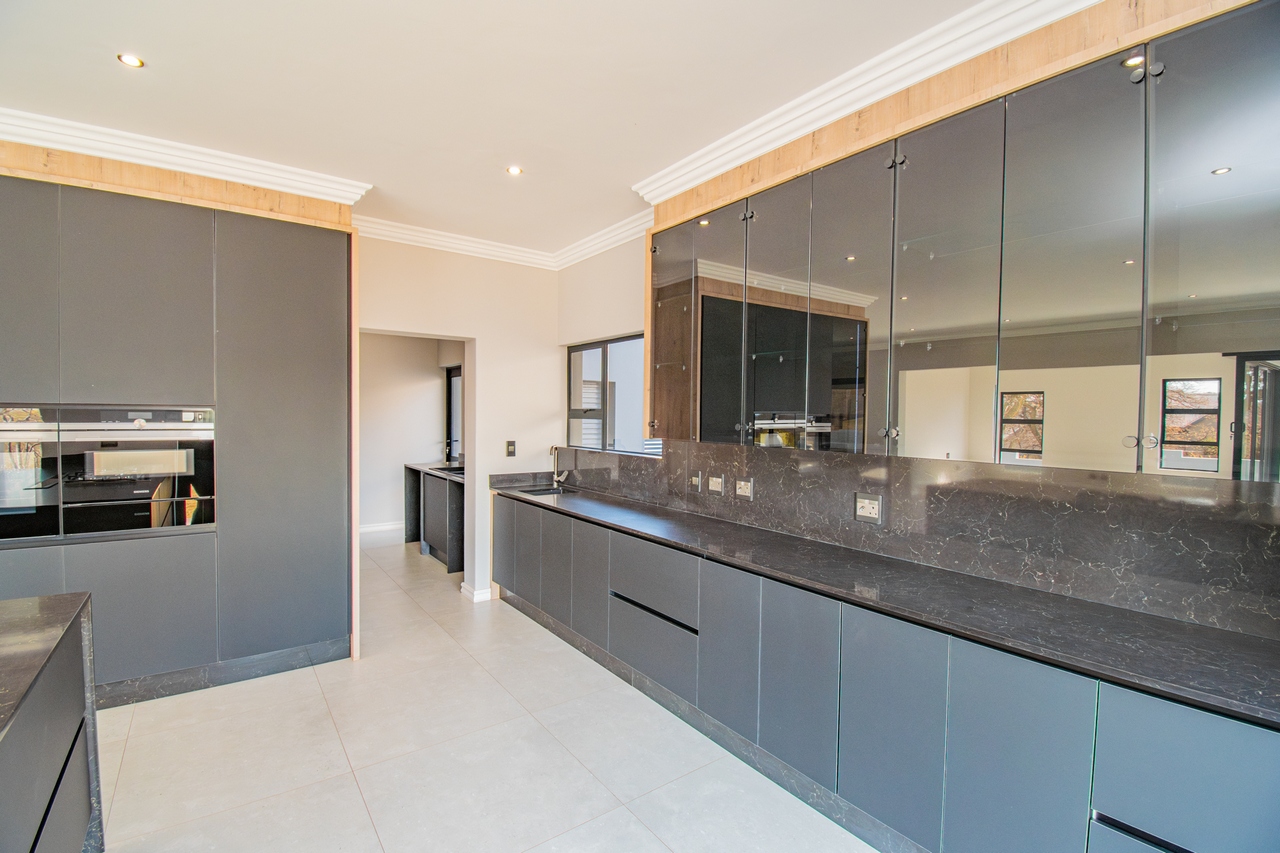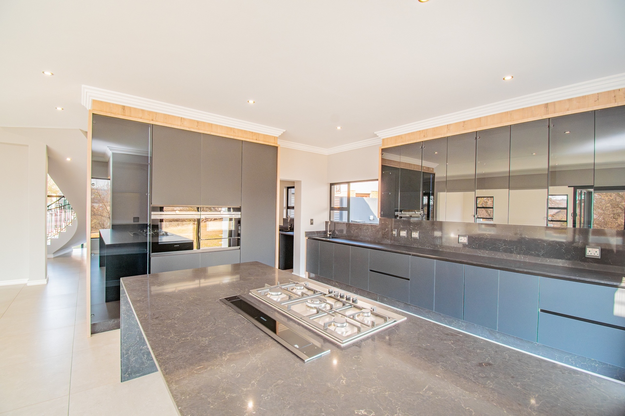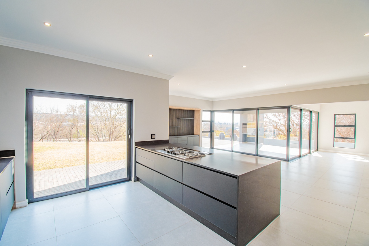 The open-concept kitchen is a chef’s dream, featuring a full suite of high-end Siemens appliances, including a built-in refrigerator, freezer, microwave with warming drawer, and a gas range with a top-of-the-line under-counter Siemens extractor. The kitchen flows effortlessly into the living areas, enhancing the sense of space and connectivity. A separate scullery adds convenience and practicality to this beautifully designed space.