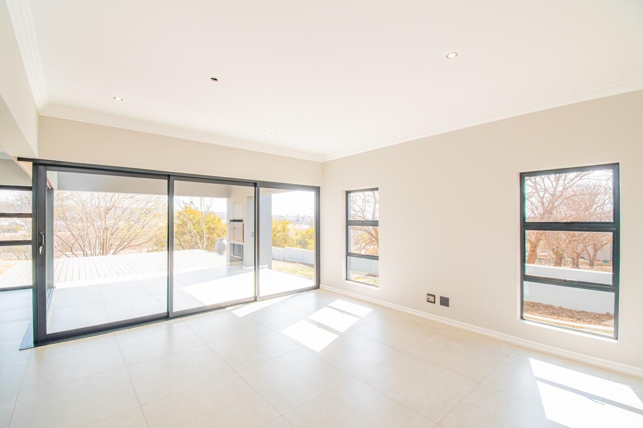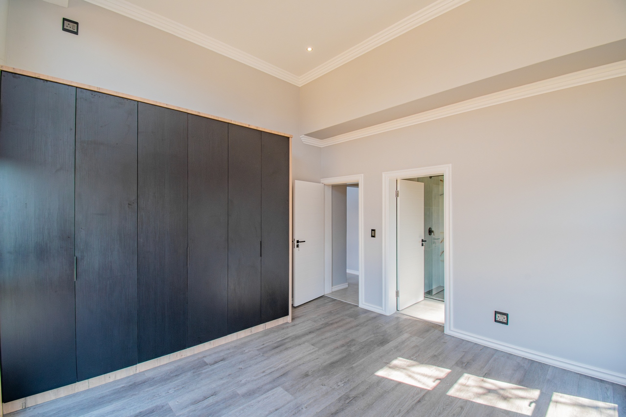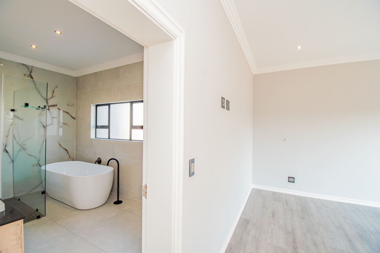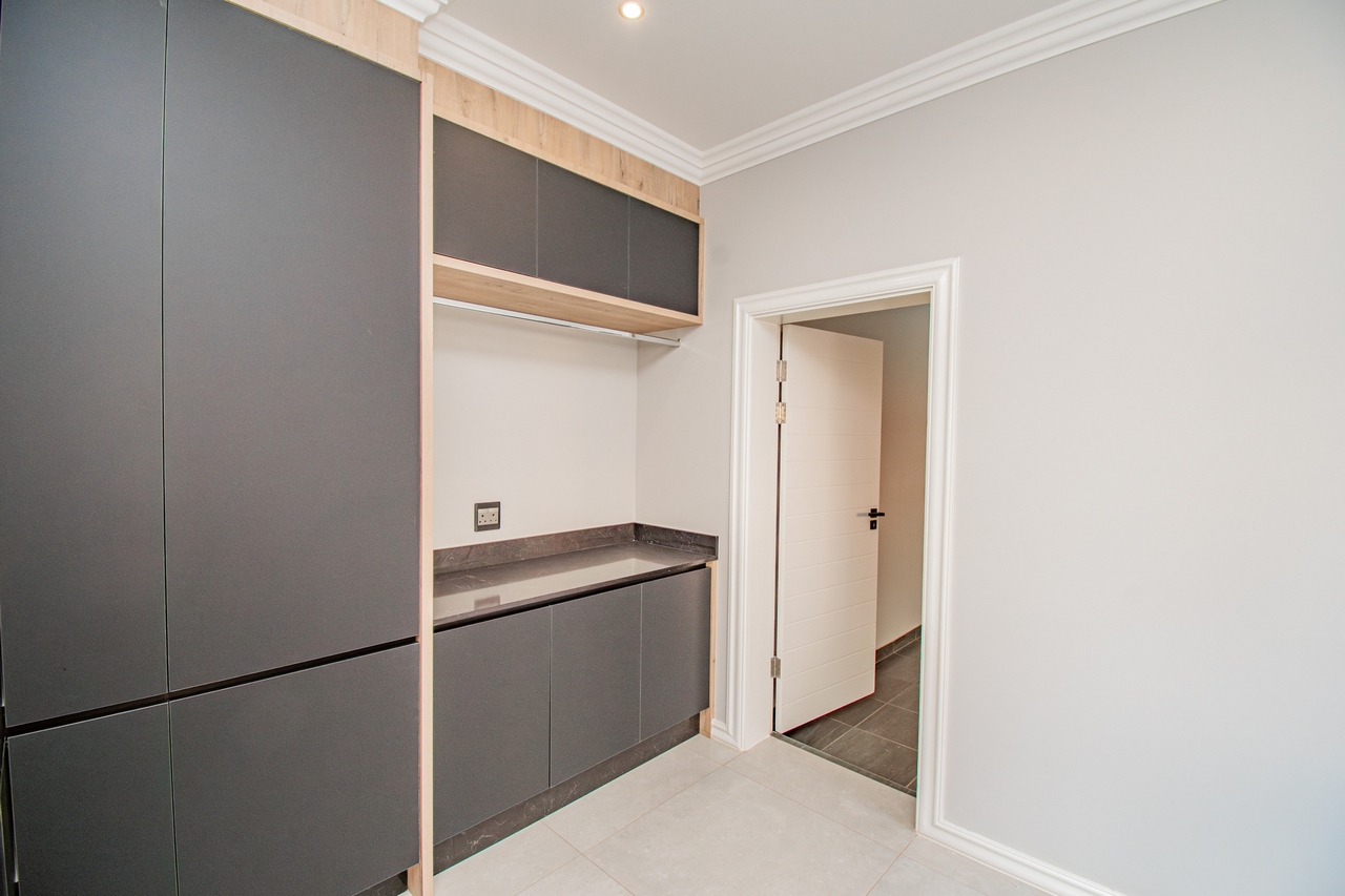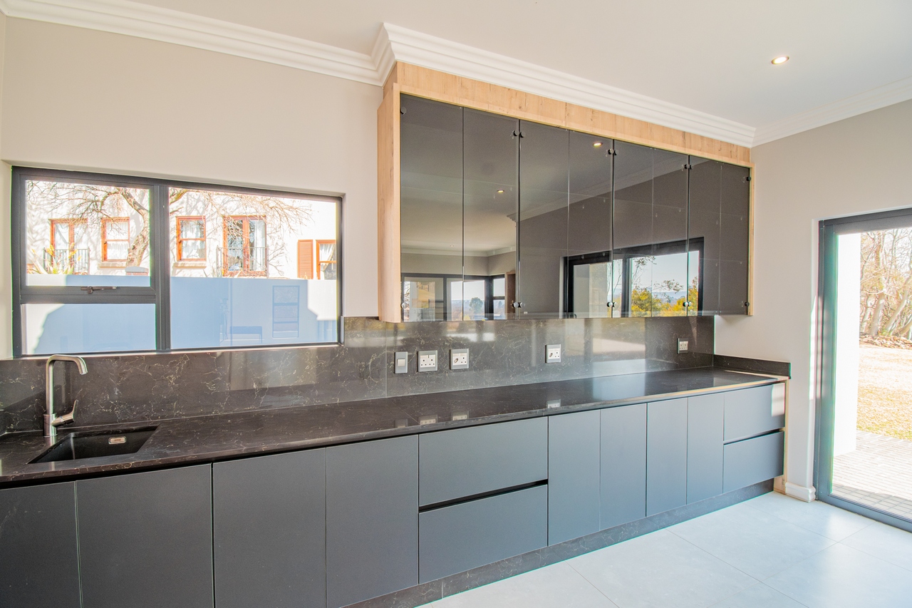The open-concept kitchen is a chef’s dream, featuring a full suite of high-end Siemens appliances, including a built-in refrigerator, freezer, microwave with warming drawer, and a gas range with a top-of-the-line under-counter Siemens extractor. The kitchen flows effortlessly into the living areas, enhancing the sense of space and connectivity. A separate scullery adds convenience and practicality to this beautifully designed space.
