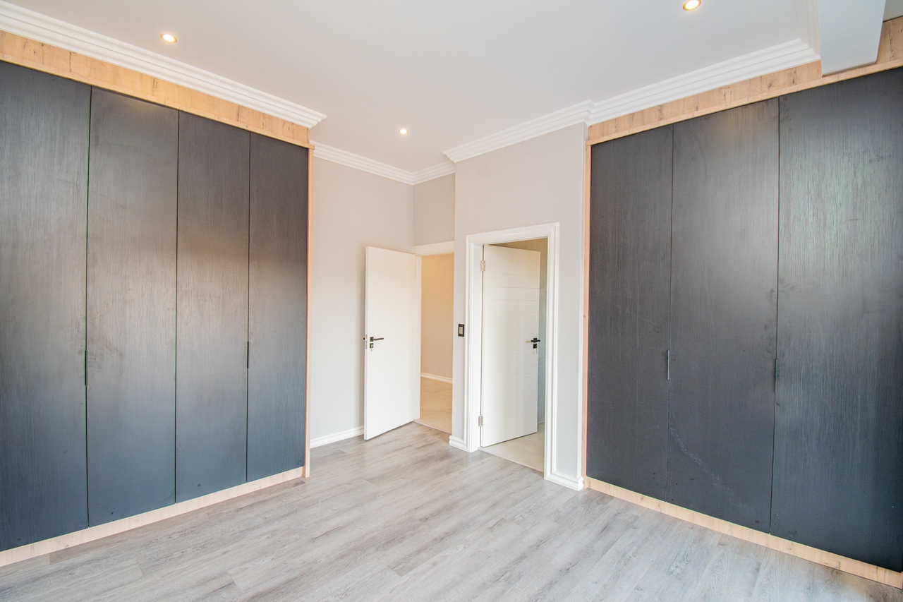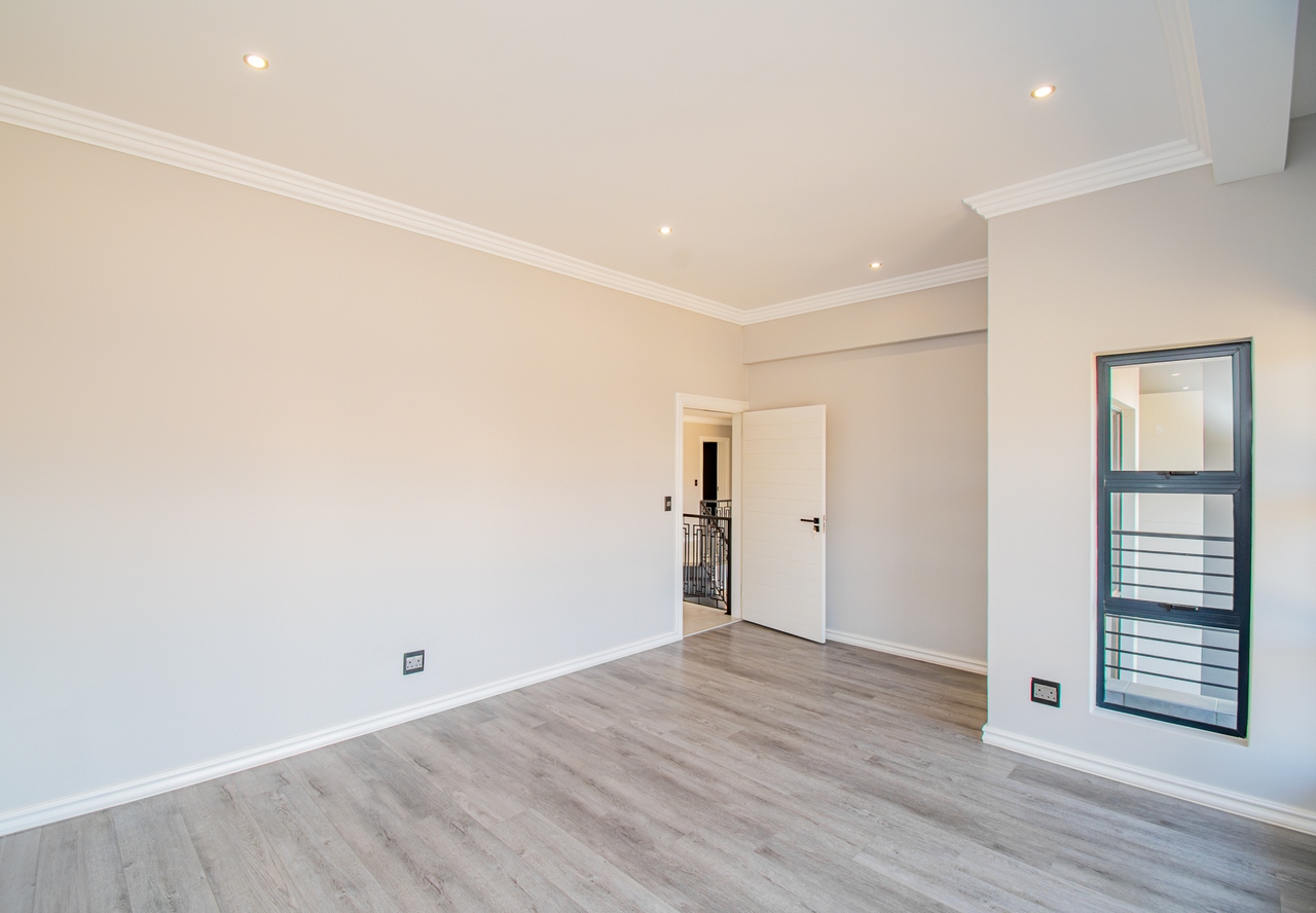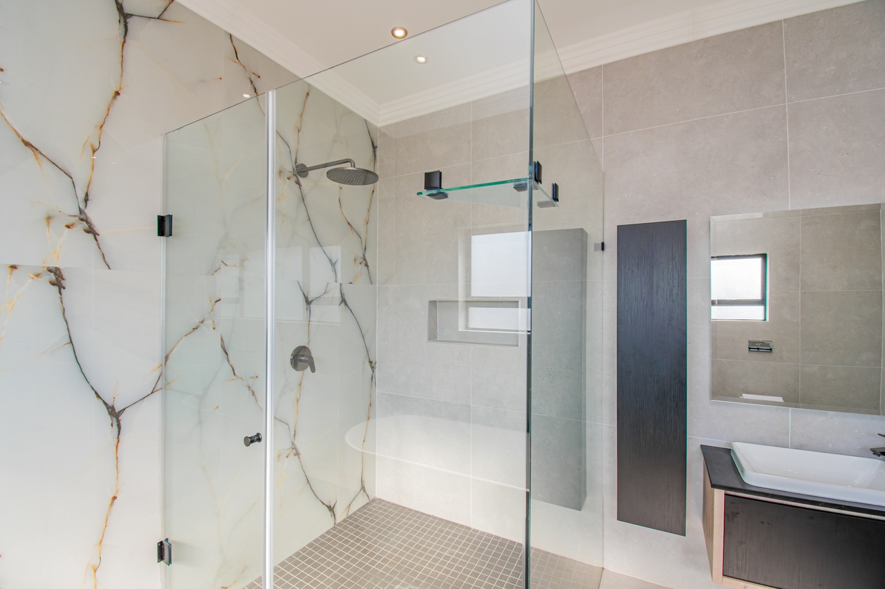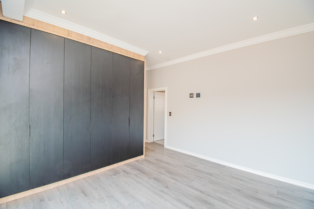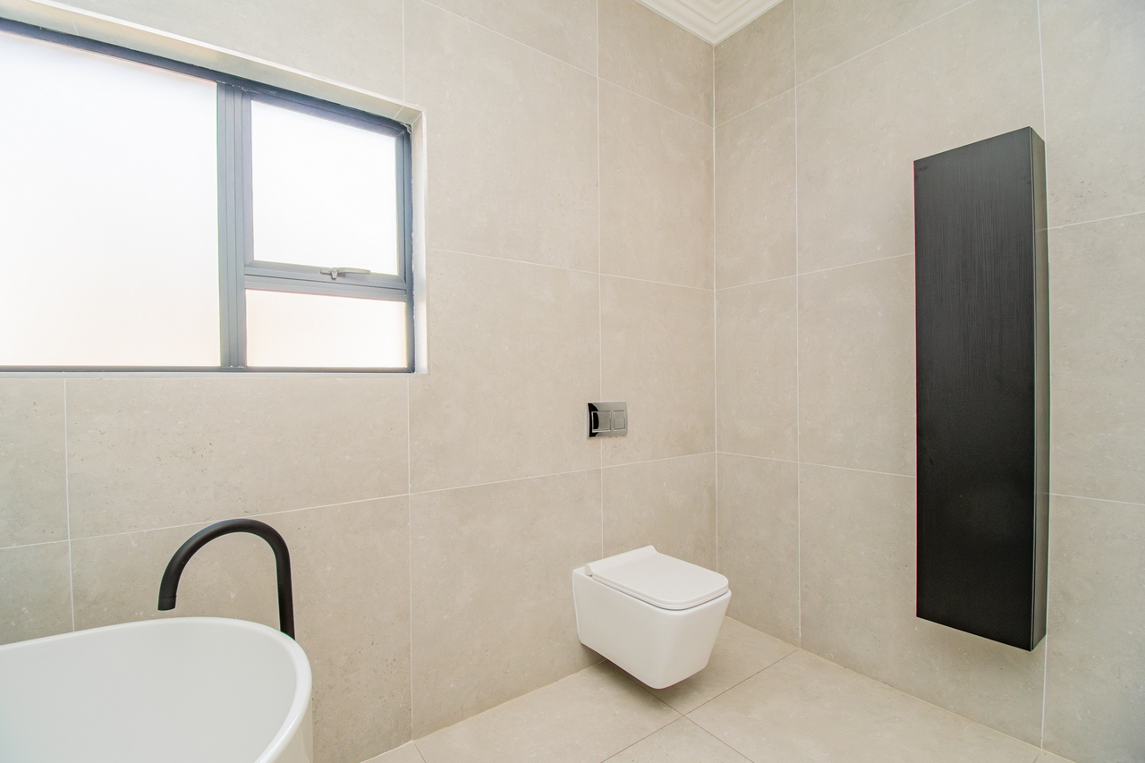 The open-concept kitchen is a chef’s dream, featuring a full suite of high-end Siemens appliances, including a built-in refrigerator, freezer, microwave with warming drawer, and a gas range with a top-of-the-line under-counter Siemens extractor. The kitchen flows effortlessly into the living areas, enhancing the sense of space and connectivity. A separate scullery adds convenience and practicality to this beautifully designed space.