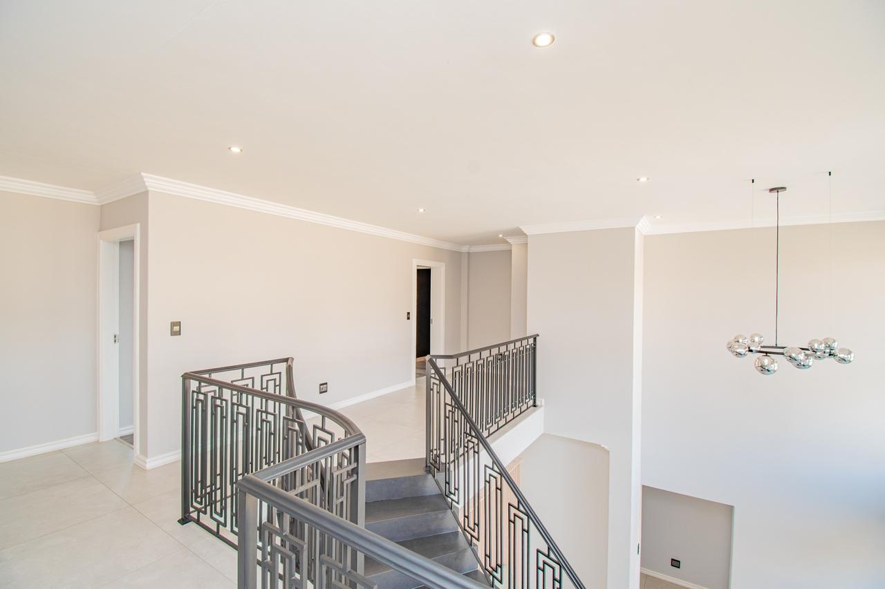 The home is equipped with 8 solar panels, 2 separate solar geysers with 4 panels each, a 5.5 kWh inverter with a 10 kWh battery, and a complete solar system. Additional features include a fully automated irrigation system, and installed fiber wiring ready for Wi-Fi.