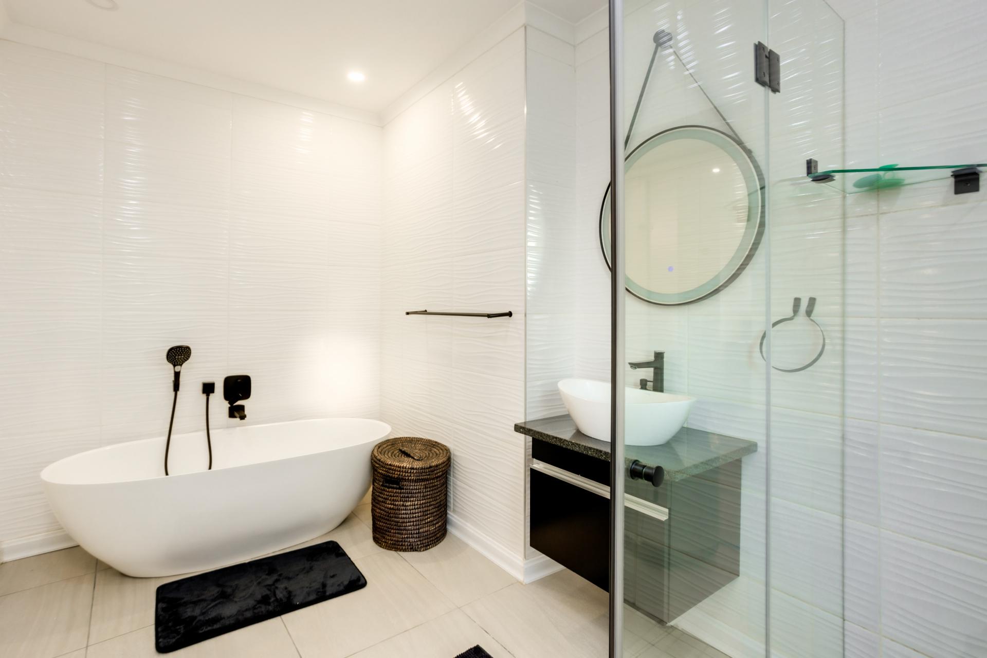 Upstairs, the home continues to impress with three beautifully appointed en-suite bedrooms. The luxurious main suite is a sanctuary, featuring a large open-plan full bathroom, a spacious walk-in dressing room, and its own private patio. The two additional upstairs bedrooms are equally generous, each with full en-suite bathrooms and their own private patios—offering tranquil spaces to enjoy the morning sun. A standout feature on this level is the glass-enclosed gymnasium—flooded with natural light and perfect for yoga, pilates, or serious training.