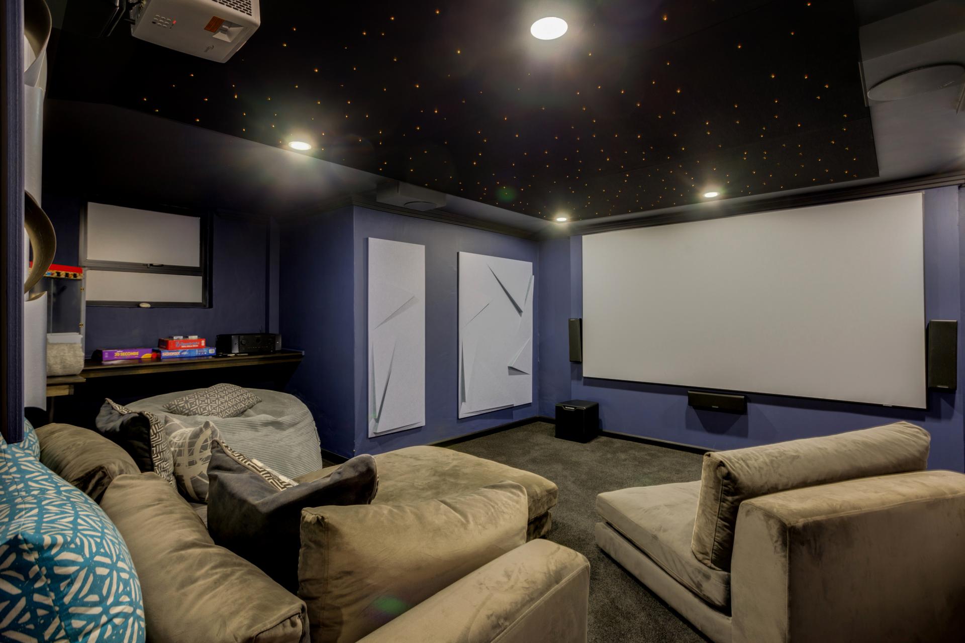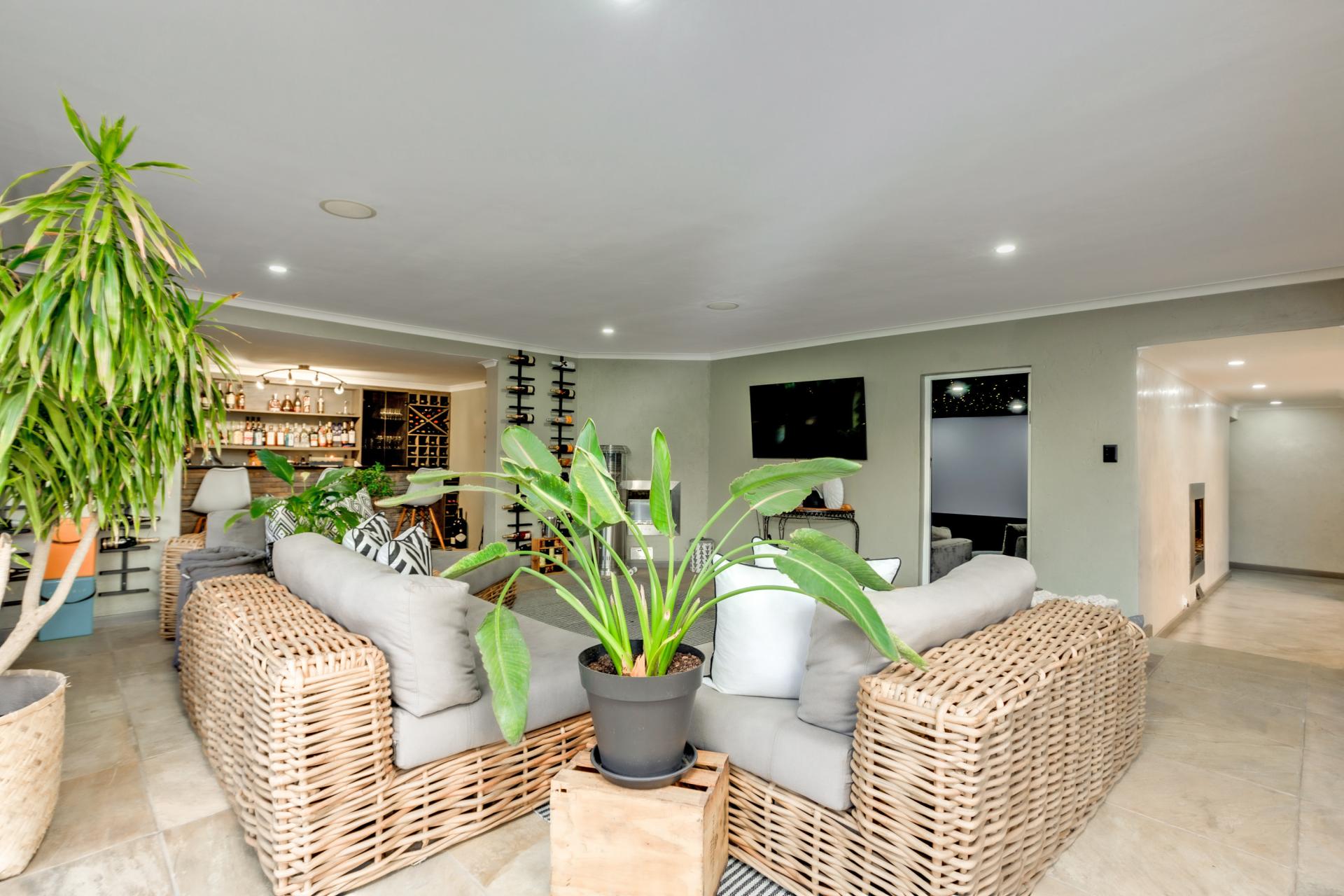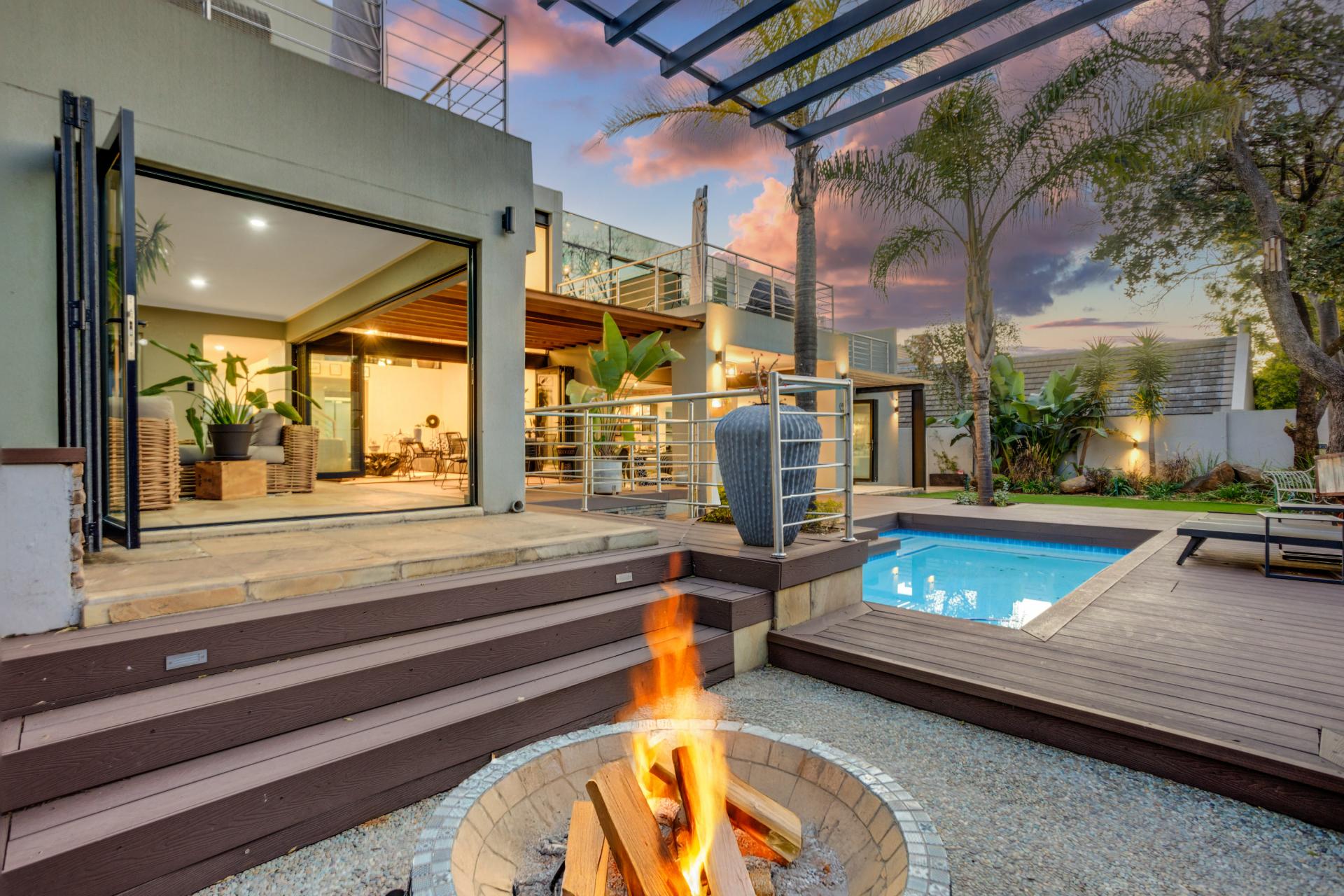 Large stacking doors lead out to a beautifully proportioned alfresco patio—ideal for year-round indoor-outdoor entertaining. The dedicated entertainment wing includes a built-in bar, with its own gas fireplace, a private cinema room for immersive movie nights, and direct flow to the outdoor firepit with pizza oven and braai area, — looking onto the swimming pool with wrap around deck and garden.