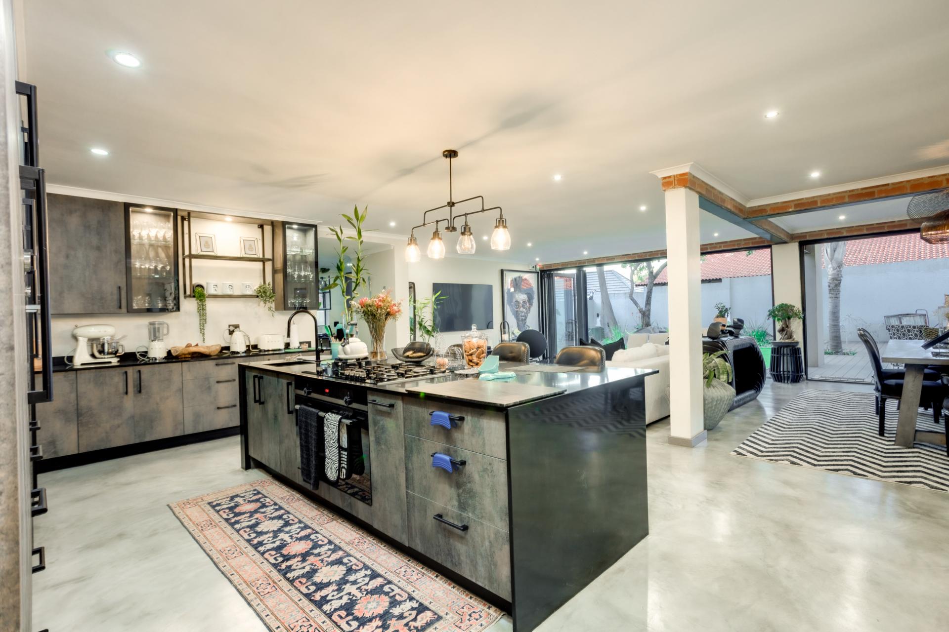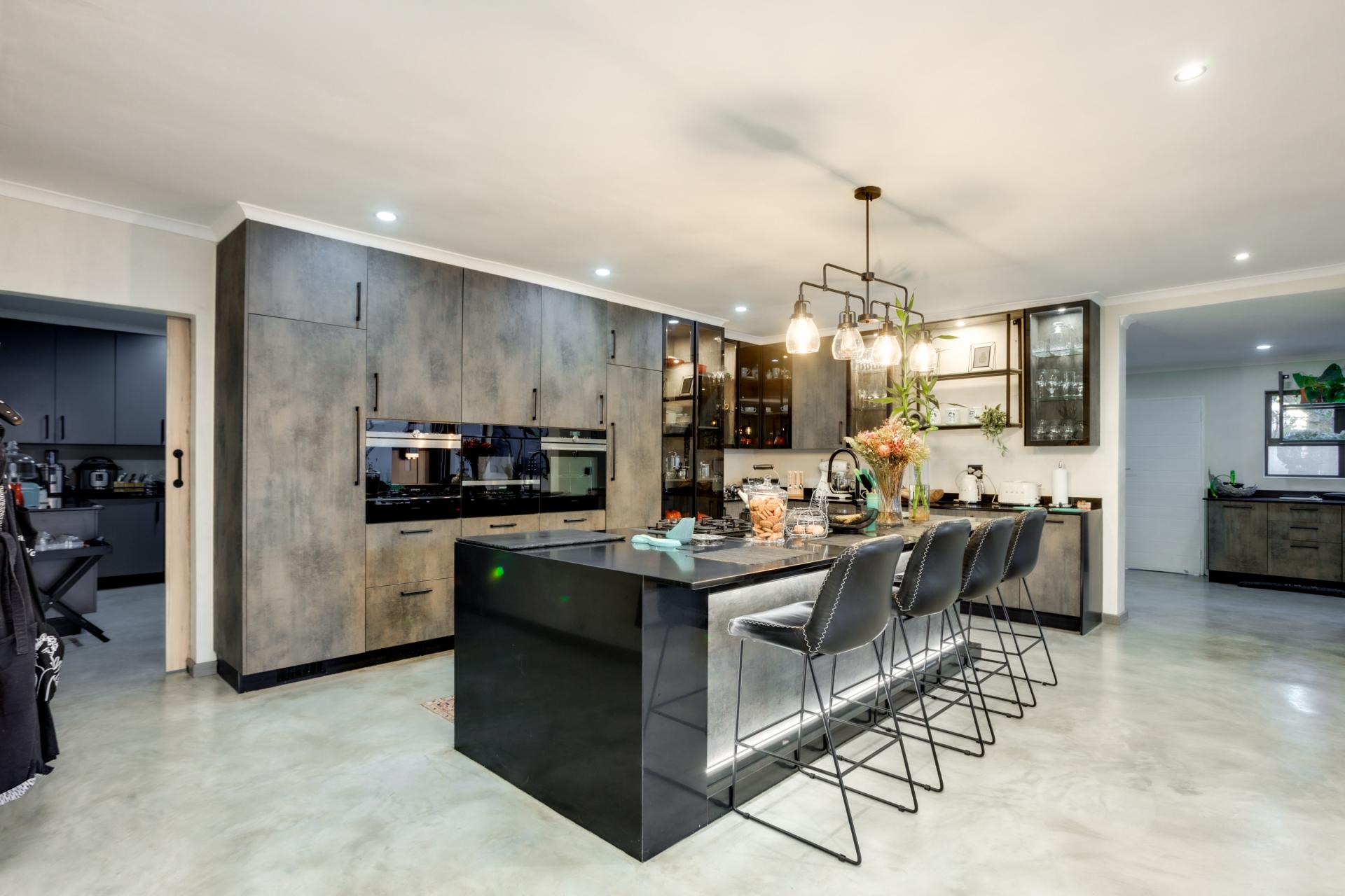 At the heart of the home lies a sophisticated designer kitchen, both functional and beautiful, featuring a sleek black marble centre-island with breakfast-bar seating for four. High-end integrated siemens appliances include an oven, microwave, and built-in coffee machine, while a cavernous walk-in pantry and food preparation area provides excellent storage and utility. The adjoining scullery is unusually spacious and fully fitted for three under-counter appliances, making this a true chef’s kitchen with seamless entertaining in mind.