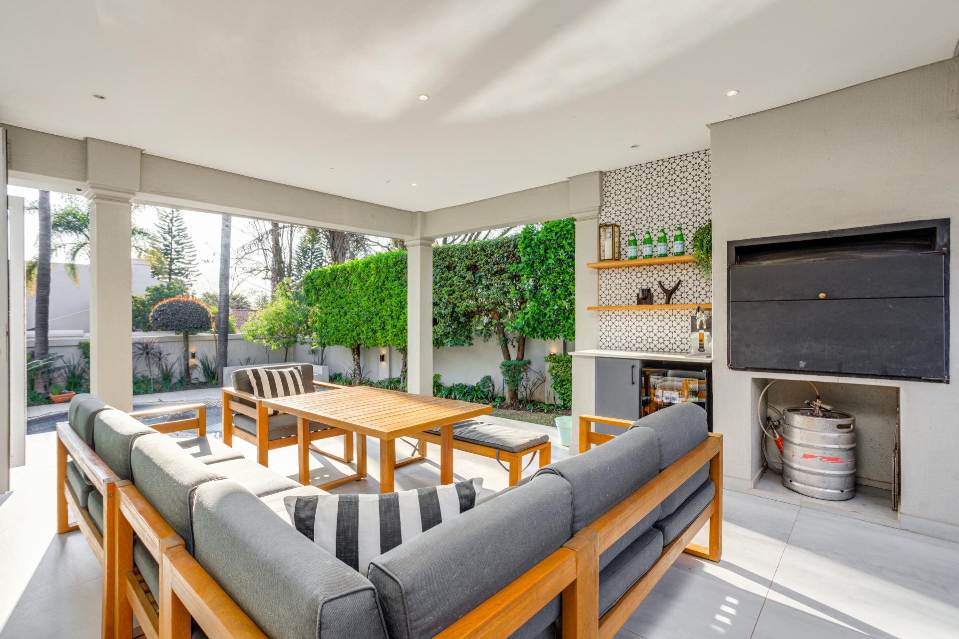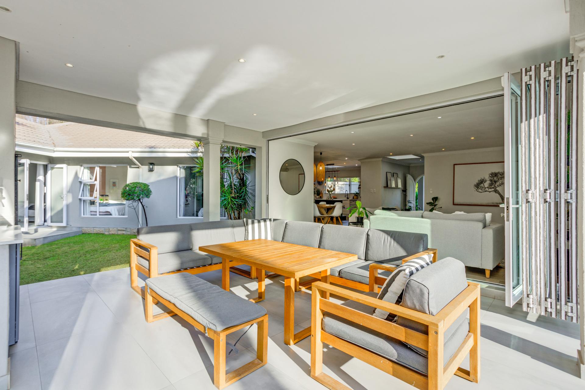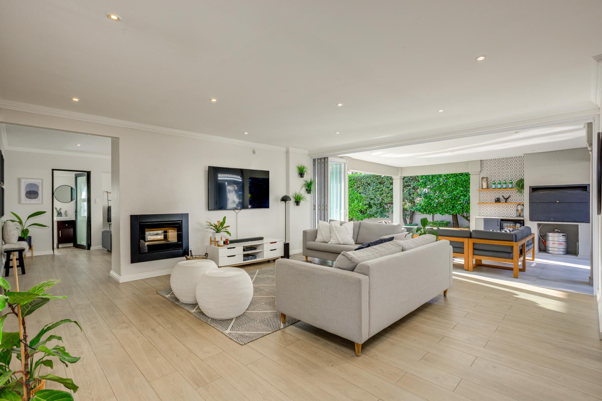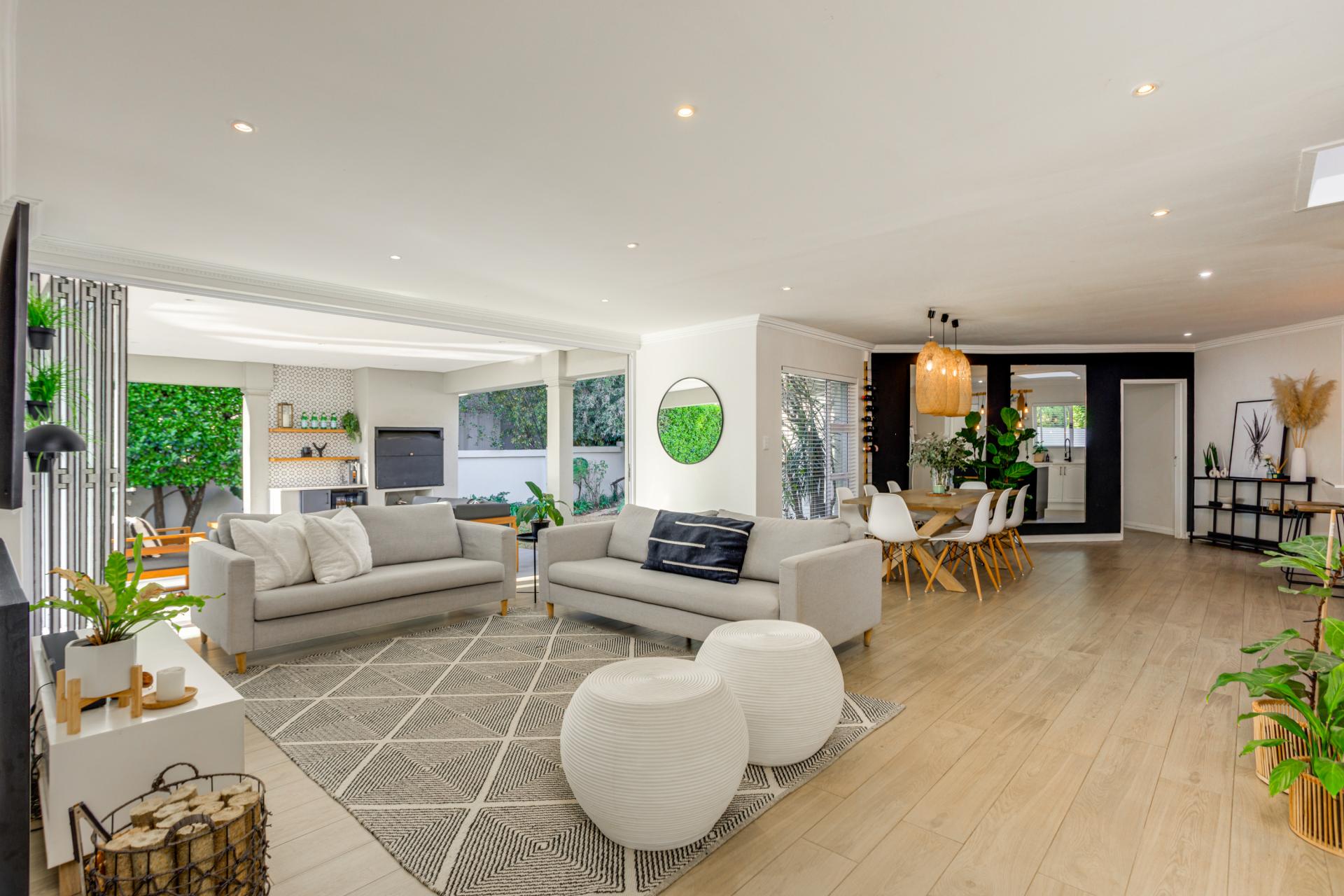 All the reception areas open effortlessly onto the patio through elegant aluminium stacking doors that can be opened during the warmer months to create a seamless indoor-outdoor living and entertaining experience. The patio itself is designed with gatherings in mind, featuring a marble countertop and an under-counter fridge — the ideal setup for summer sundowners and weekend get-togethers. From here, enjoy uninterrupted westerly views of the sunset, a sparkling swimming pool with a sunken conversation pit, and a generous landscaped garden.