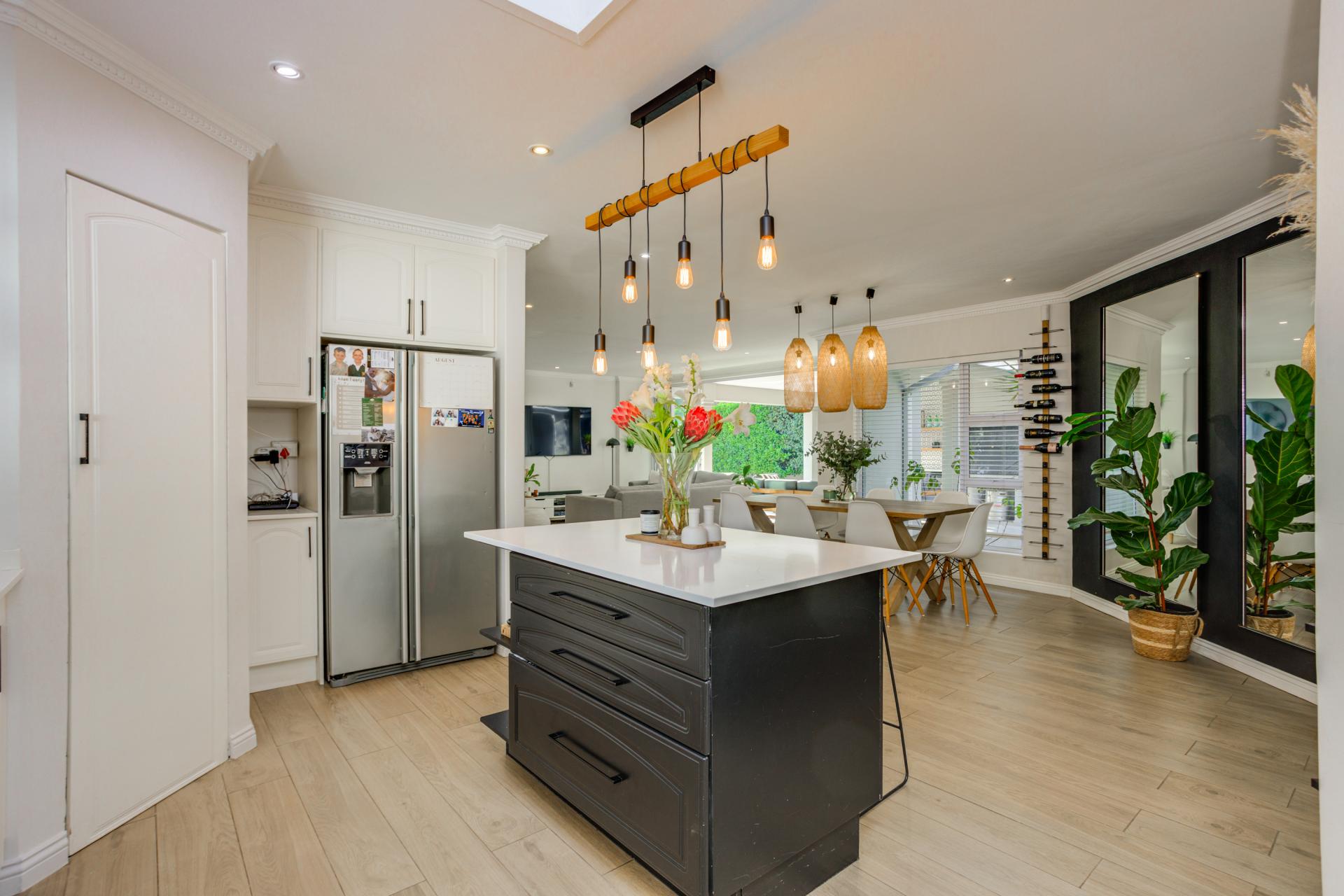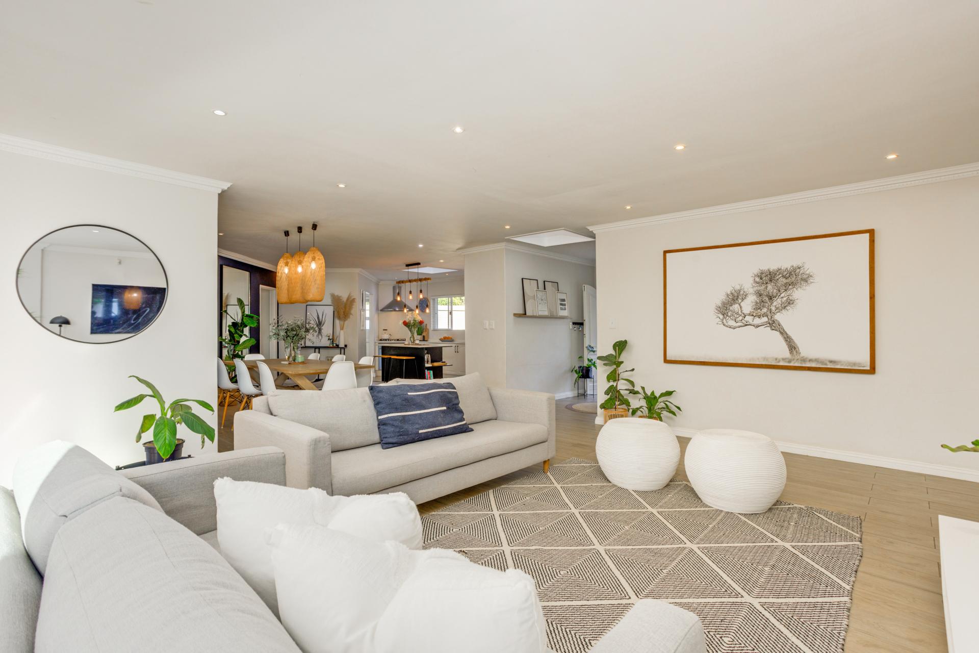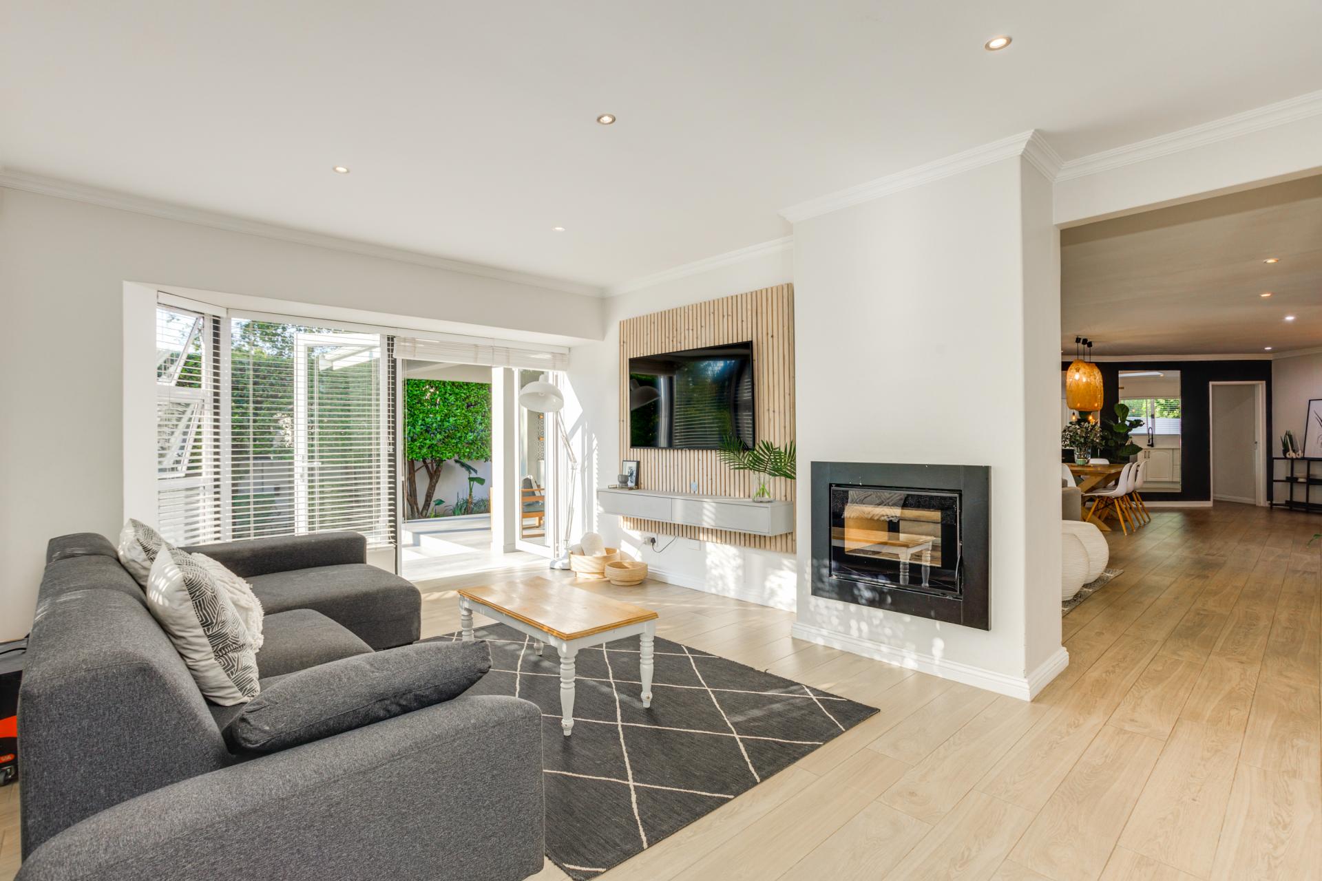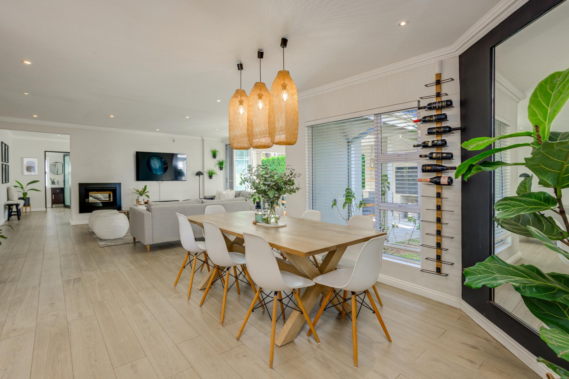All the reception areas open effortlessly onto the patio through elegant aluminium stacking doors that can be opened during the warmer months to create a seamless indoor-outdoor living and entertaining experience. The patio itself is designed with gatherings in mind, featuring a marble countertop and an under-counter fridge — the ideal setup for summer sundowners and weekend get-togethers. From here, enjoy uninterrupted westerly views of the sunset, a sparkling swimming pool with a sunken conversation pit, and a generous landscaped garden.
