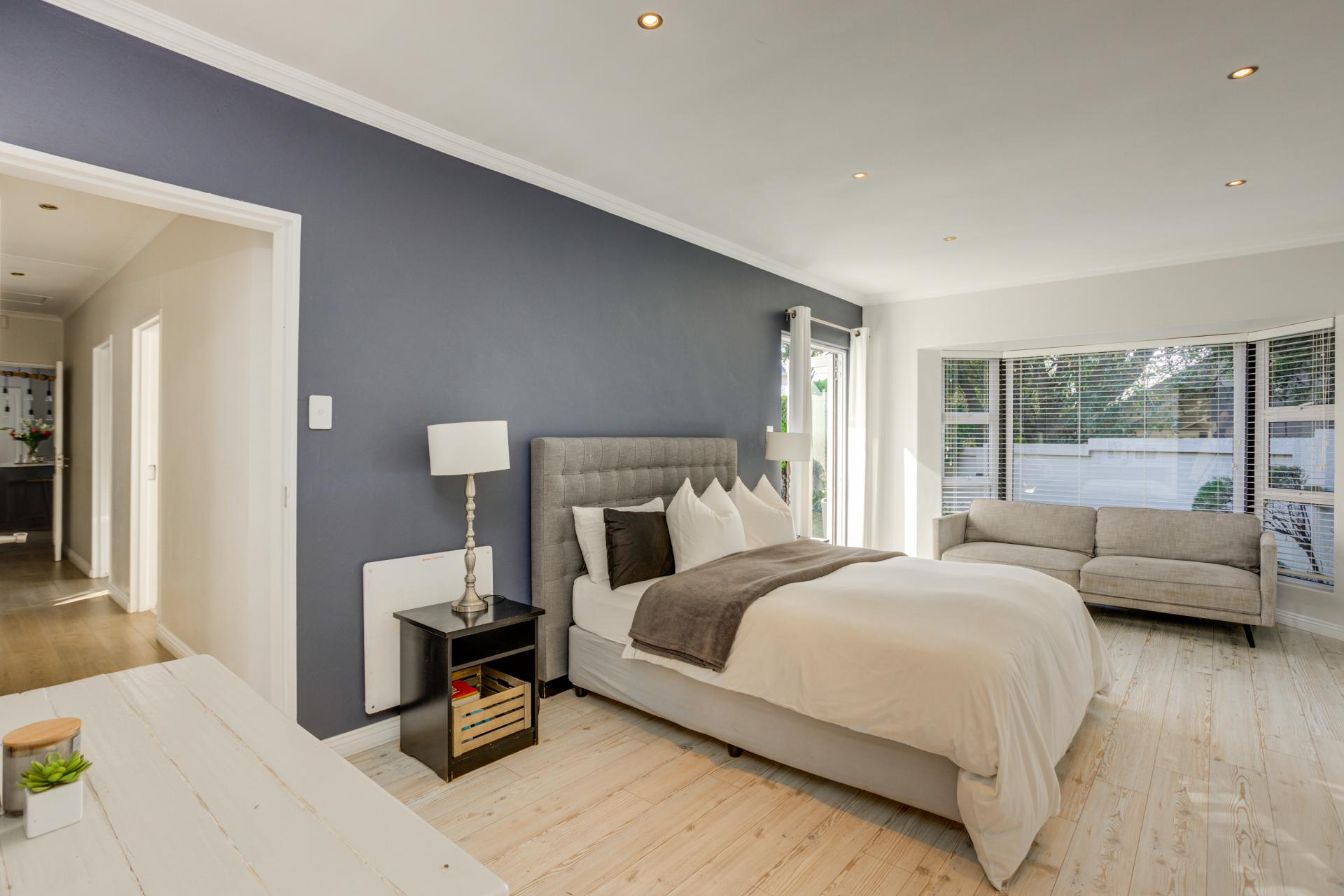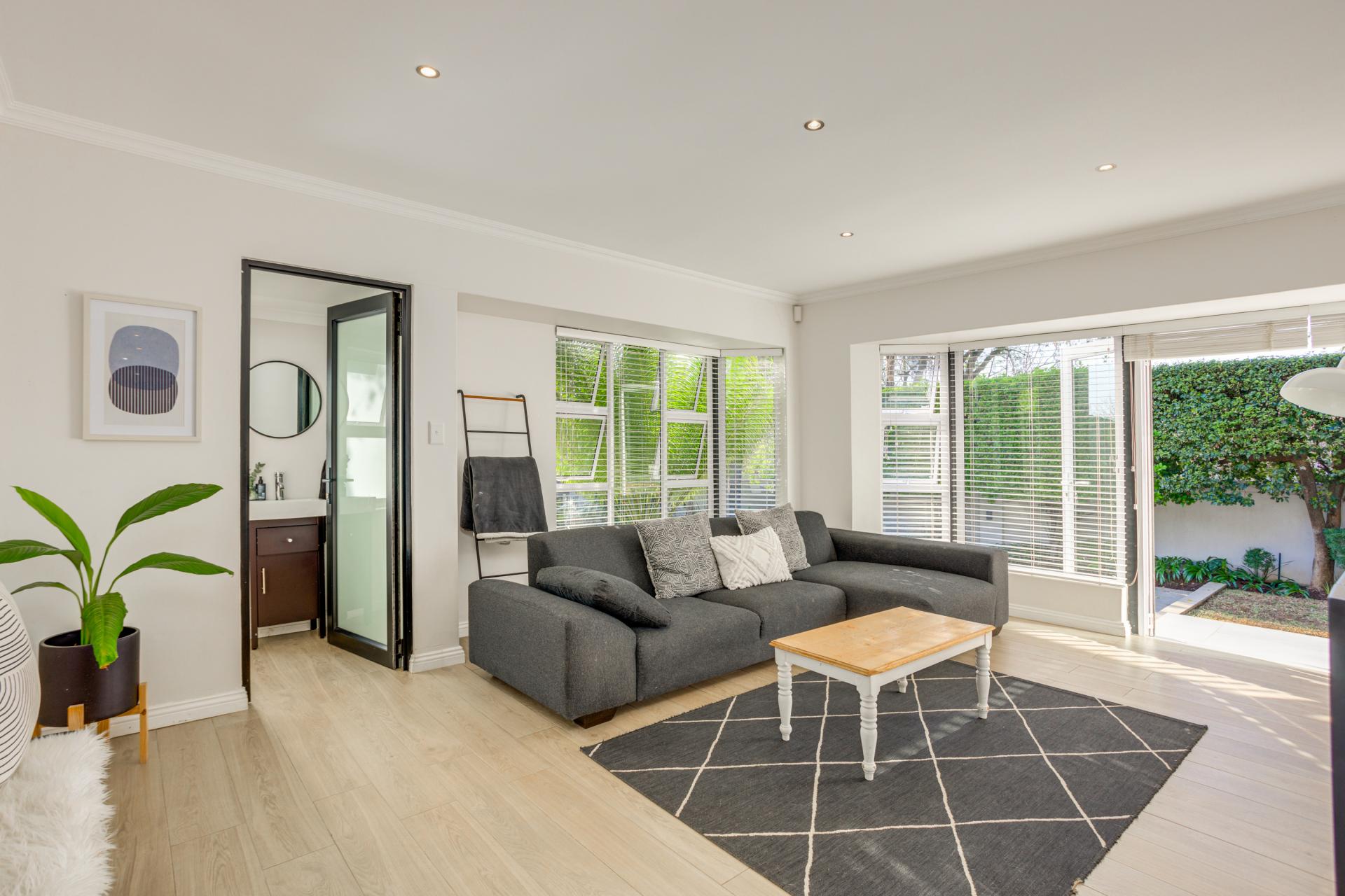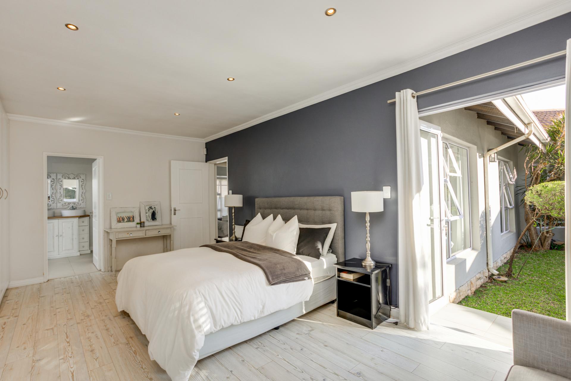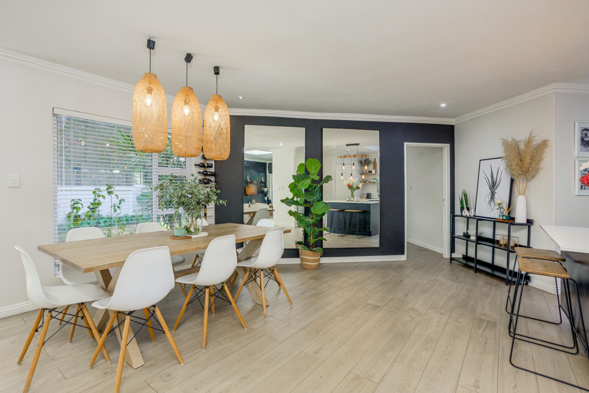 All the reception areas open effortlessly onto the patio through elegant aluminium stacking doors that can be opened during the warmer months to create a seamless indoor-outdoor living and entertaining experience. The patio itself is designed with gatherings in mind, featuring a marble countertop and an under-counter fridge — the ideal setup for summer sundowners and weekend get-togethers. From here, enjoy uninterrupted westerly views of the sunset, a sparkling swimming pool with a sunken conversation pit, and a generous landscaped garden.