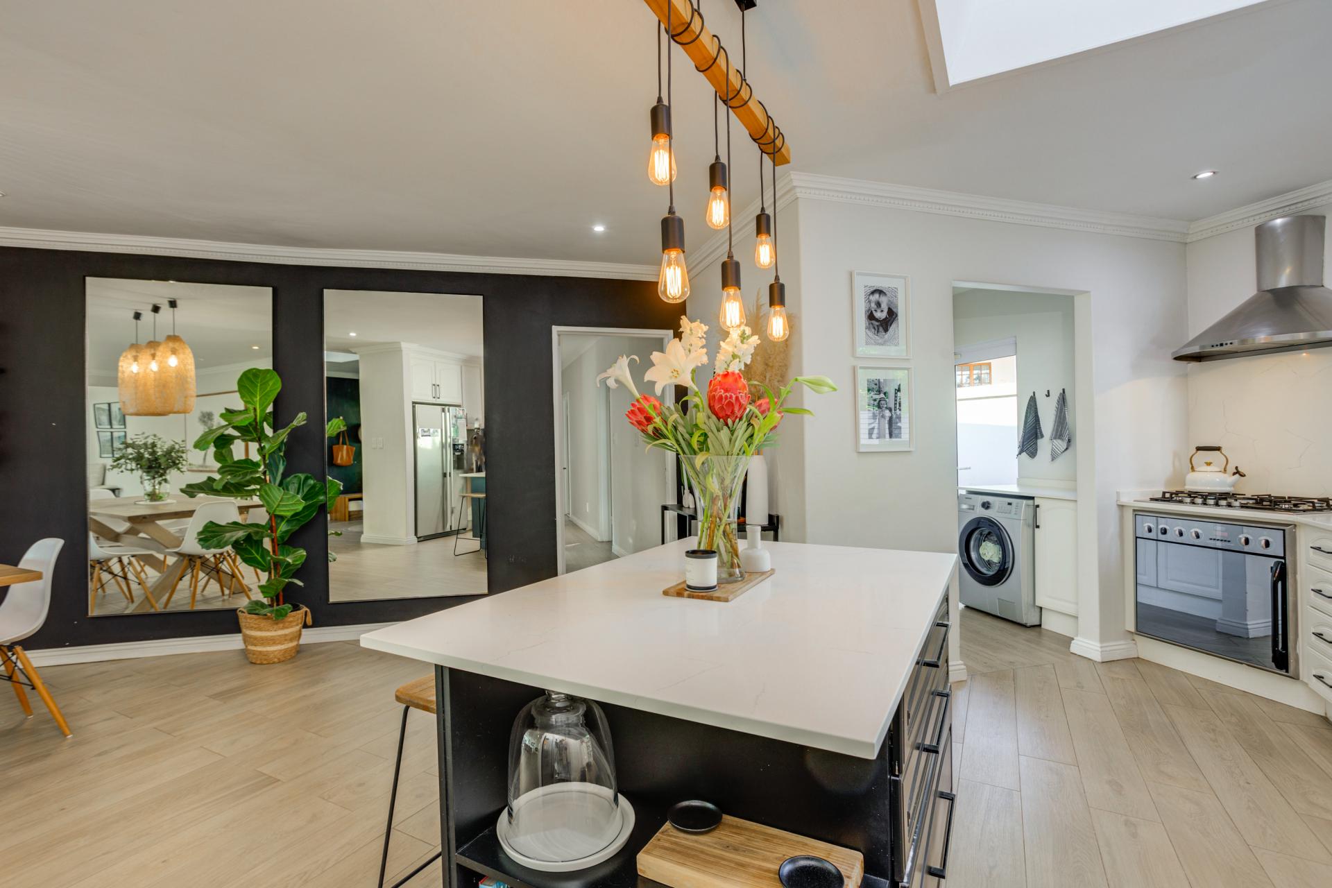 The main living room is inviting and airy, complemented by a separate kids’ TV lounge — both warmed by a central closed-combustion double-door fireplace that cleverly connects the two. The open-plan dining room leads into a beautifully appointed kitchen featuring marble countertops, a centre island, gas hob, electric oven, and a generous pantry cupboard. A separate scullery offers space for two appliances, keeping the main kitchen area sleek and clutter-free. The home also enjoys a guest cloakroom conveniently positions off the second tv lounge.
