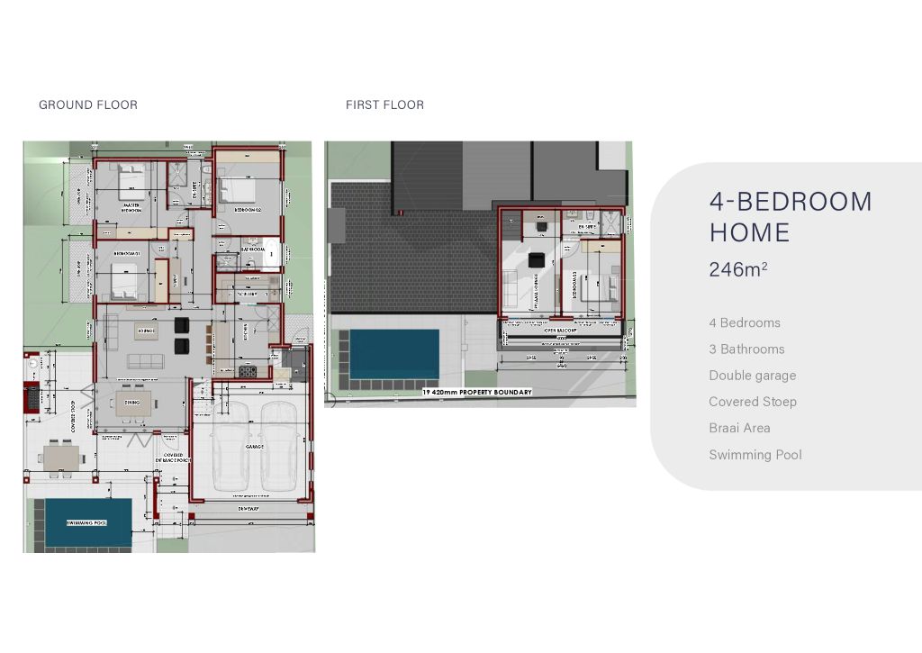 Introducing the largest and most luxurious homes at Verdeau Lifestyle Estate—the epitome of sophistication and grandeur. These Luxury Collection stunning properties are designed for those who seek both exclusivity and comfort, featuring spacious interiors, high-end finishes, and premium design elements. Each home offers 4 expansive bedrooms, 3 elegant bathrooms, and a double garage, along with a covered patio, braai area, and a private swimming pool, perfect for relaxation and outdoor entertainment. Priced from R 4 750 000 to R 4 850 000.