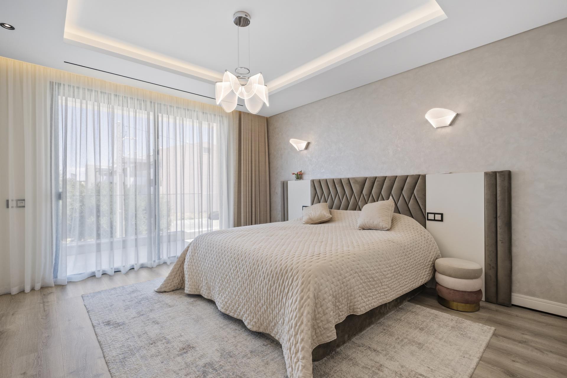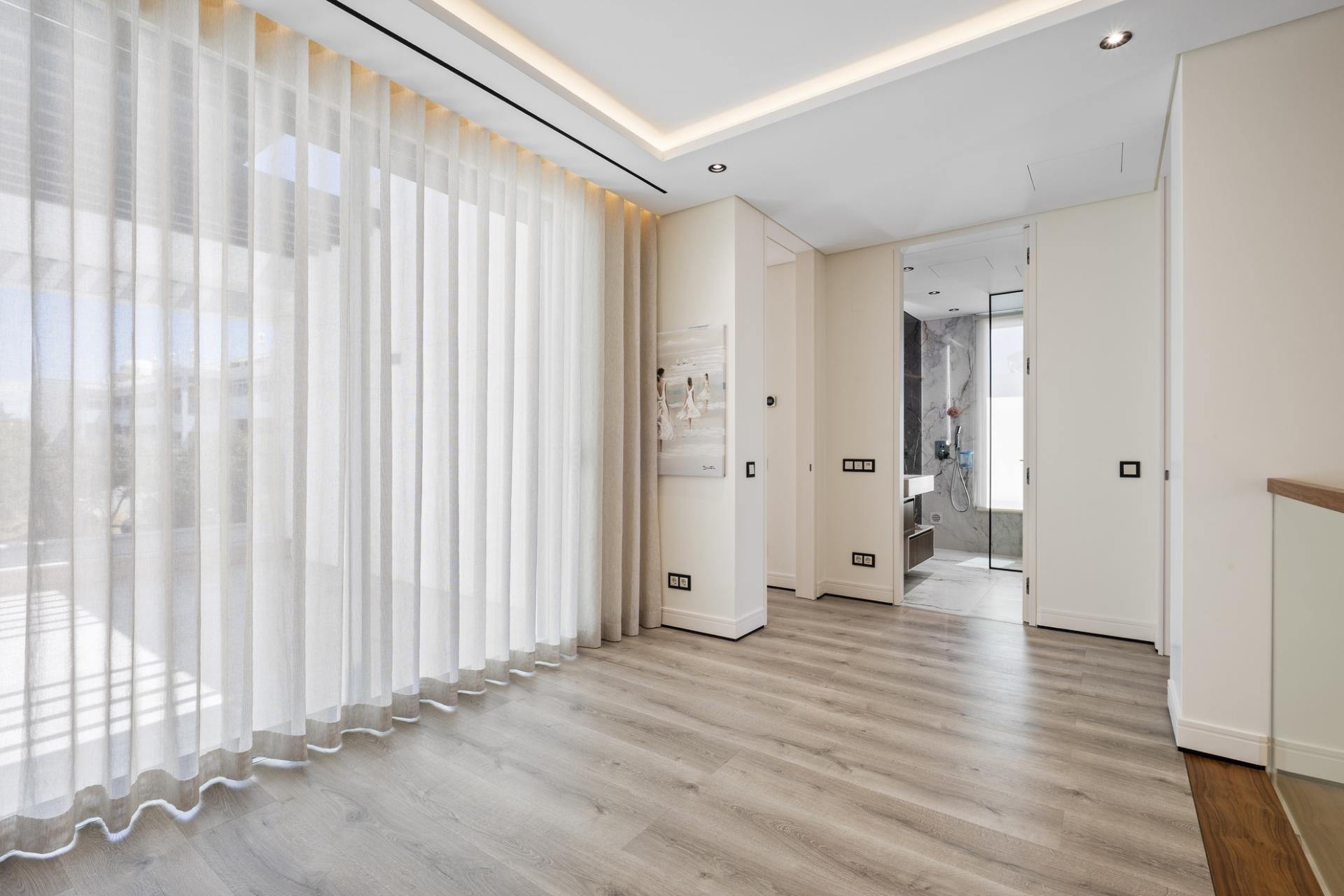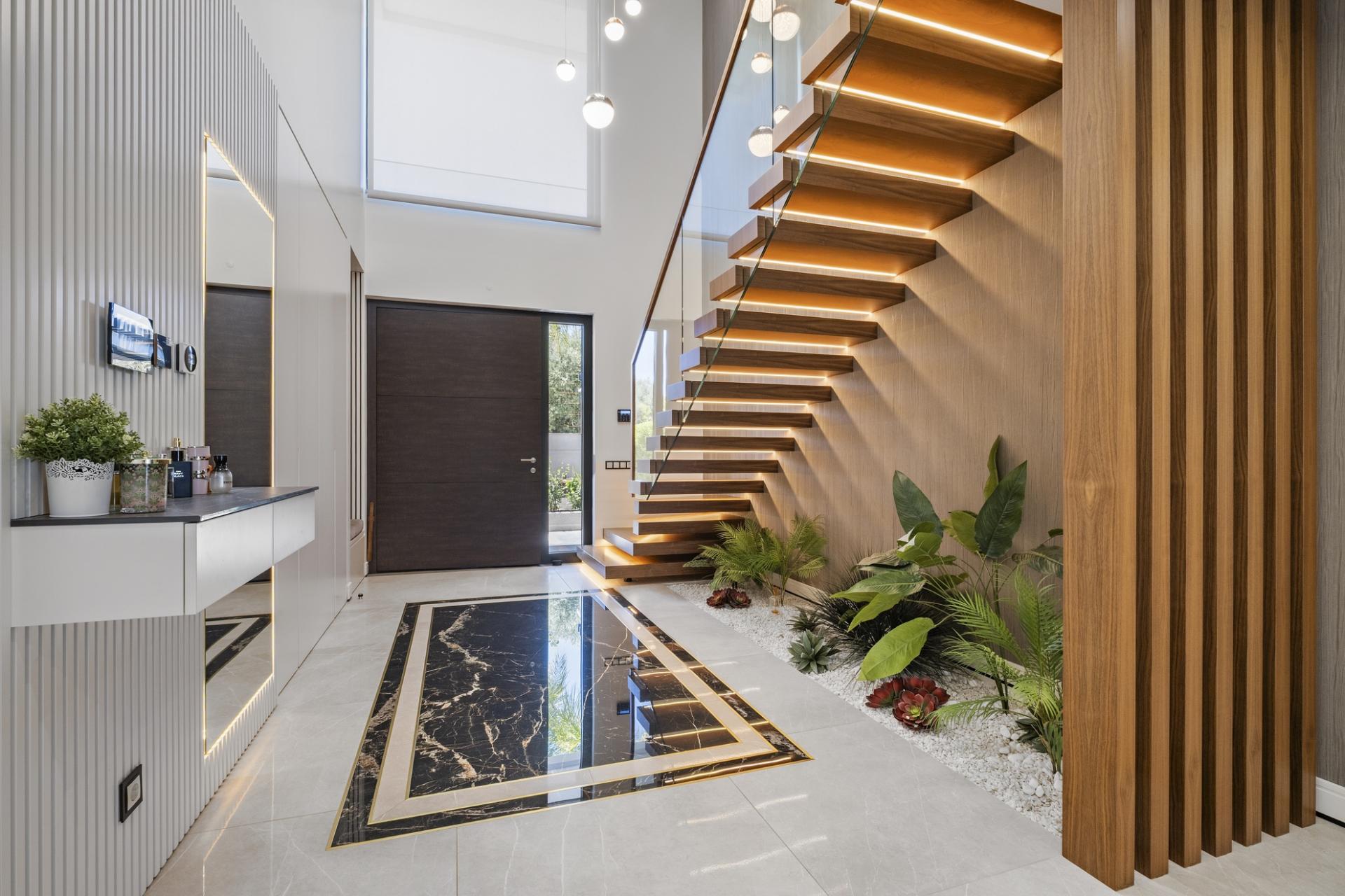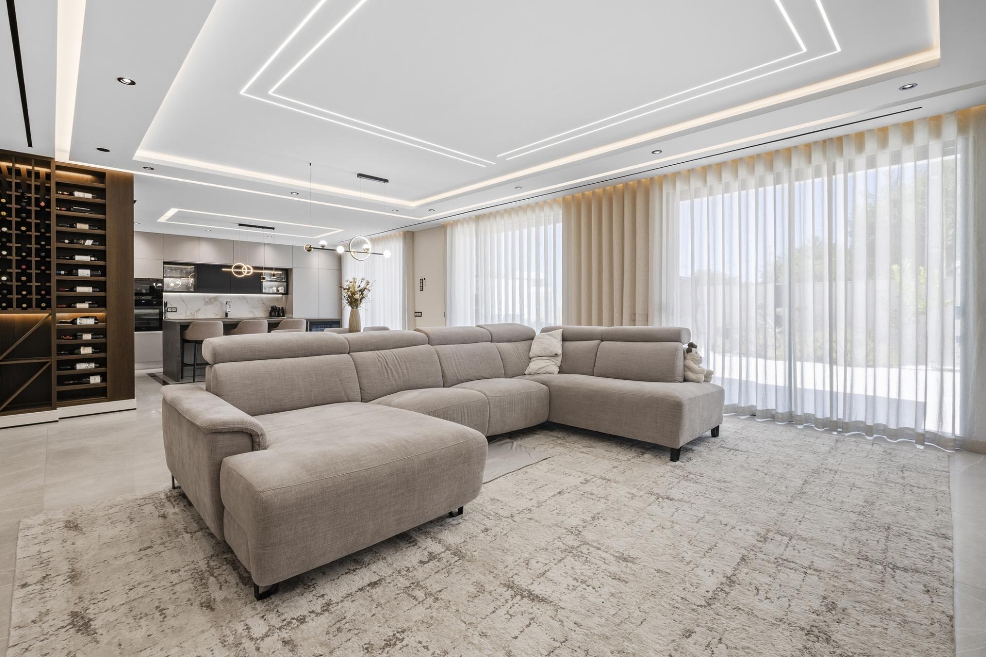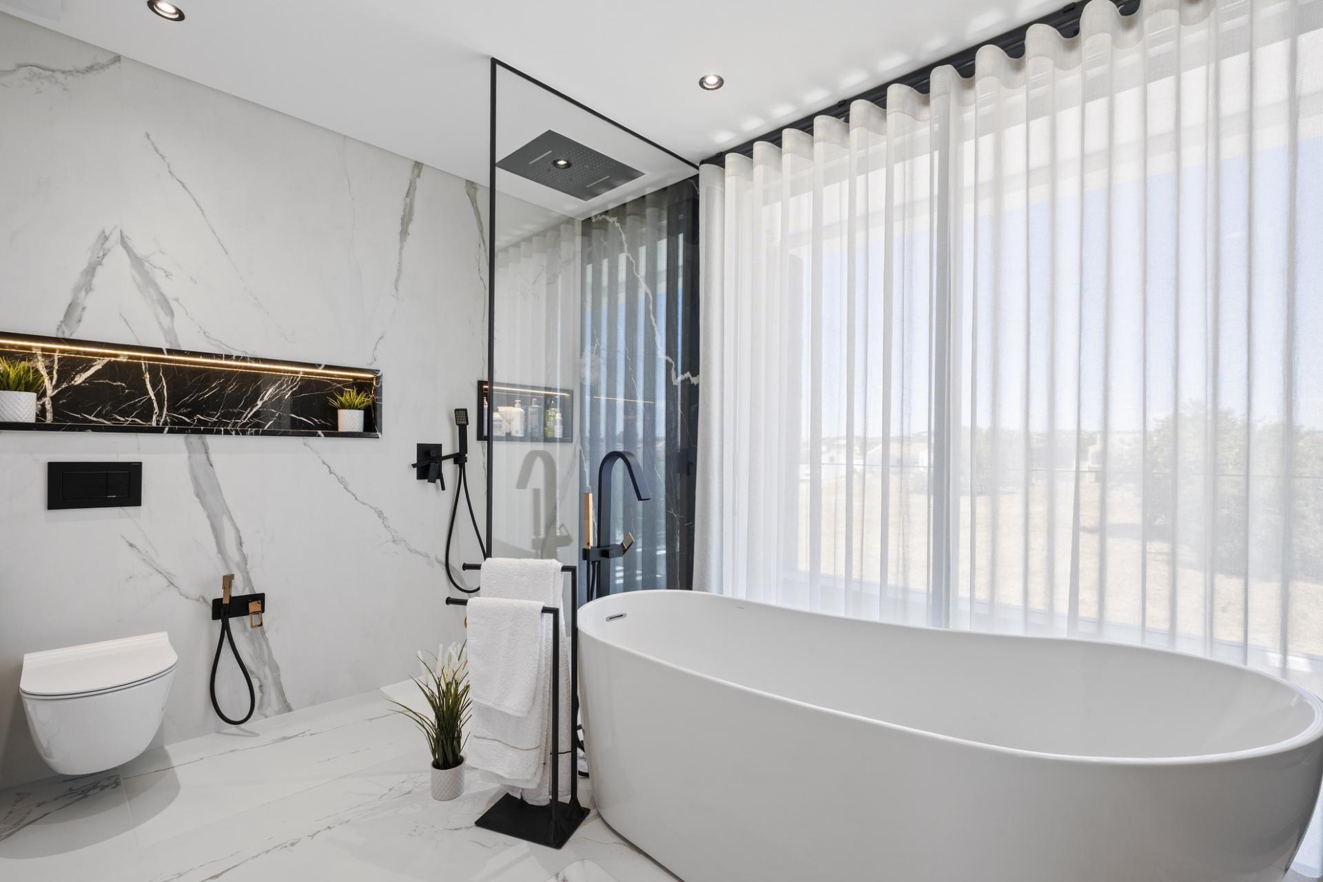 Designed with convenience and security in mind, the villa includes underfloor hydraulic heating powered by a high-efficiency heat pump, air conditioning throughout, and high-spec insulation. Electric shutters and fire-resistant curtains can be individually adjusted, and dimmable lighting helps set the ideal mood in each space. Acoustic glazing, thermal breaks, video intercom, and a reinforced entrance door provide peace of mind.