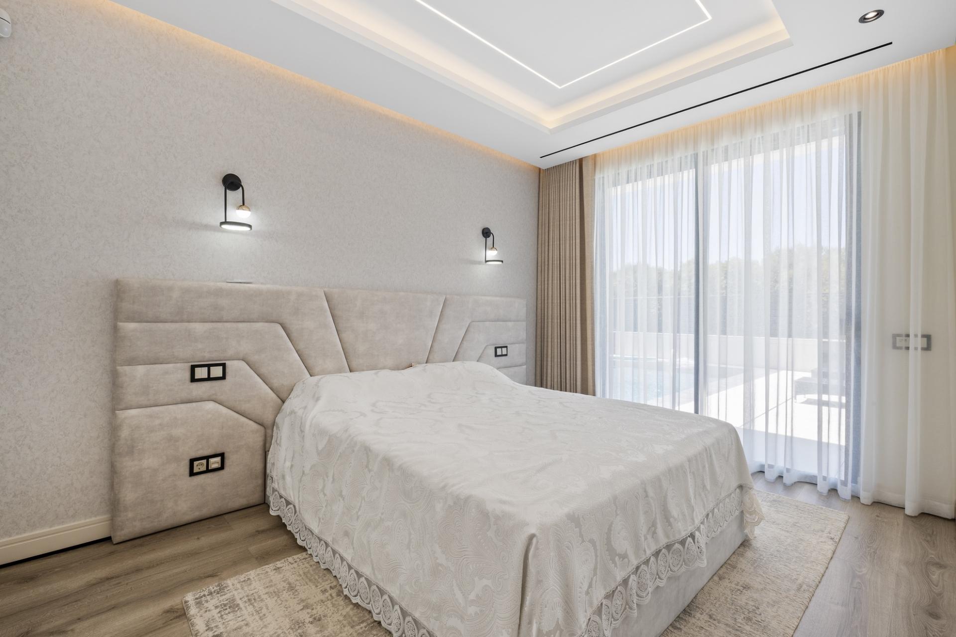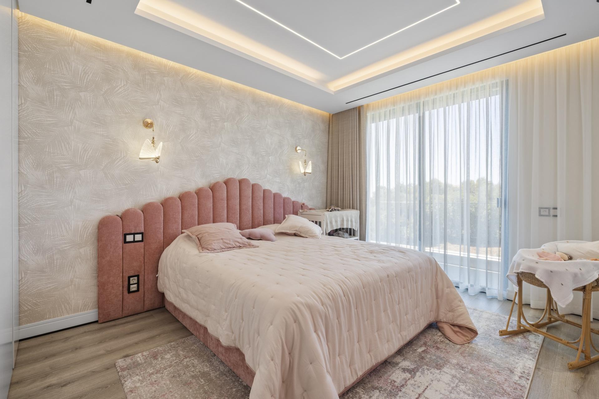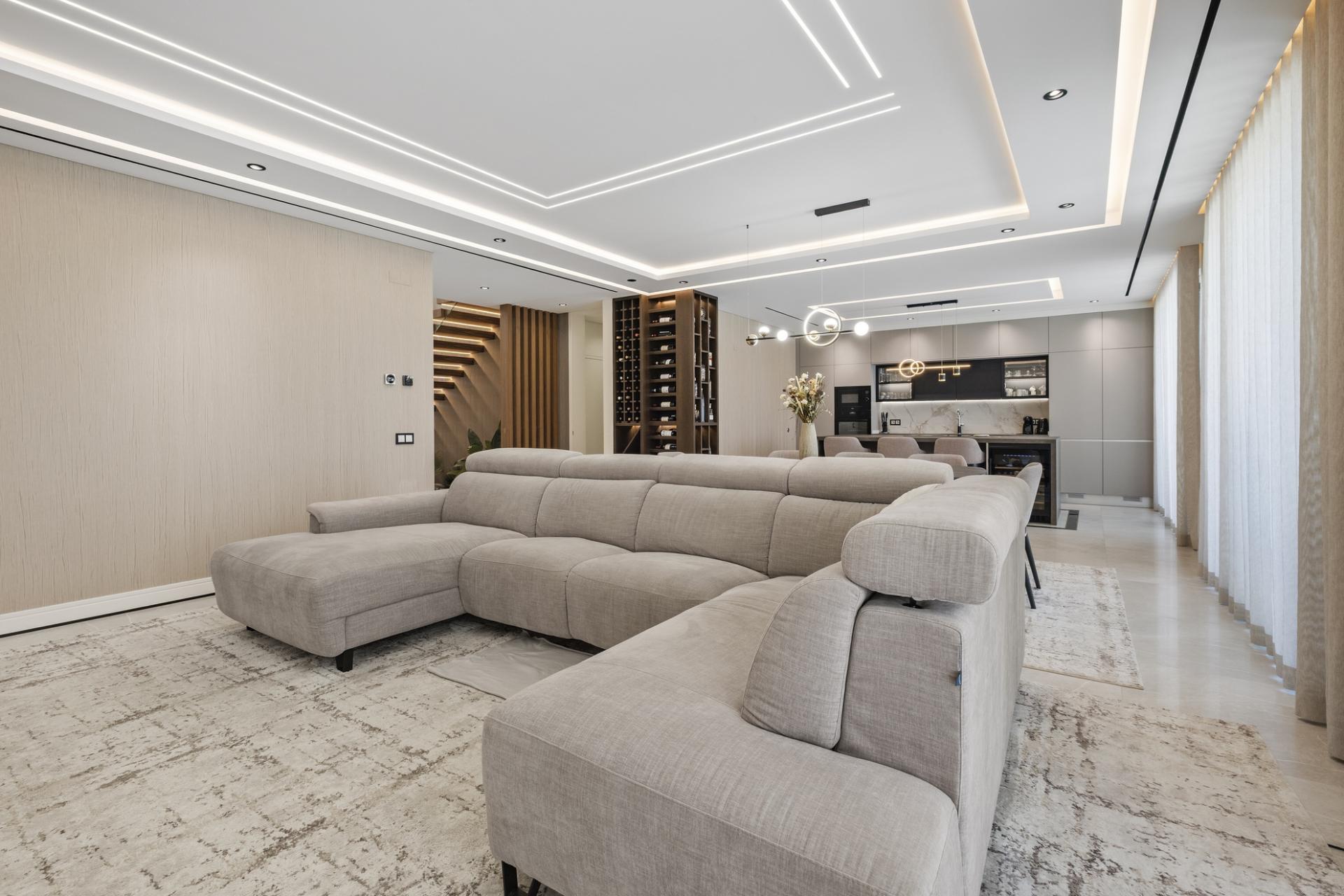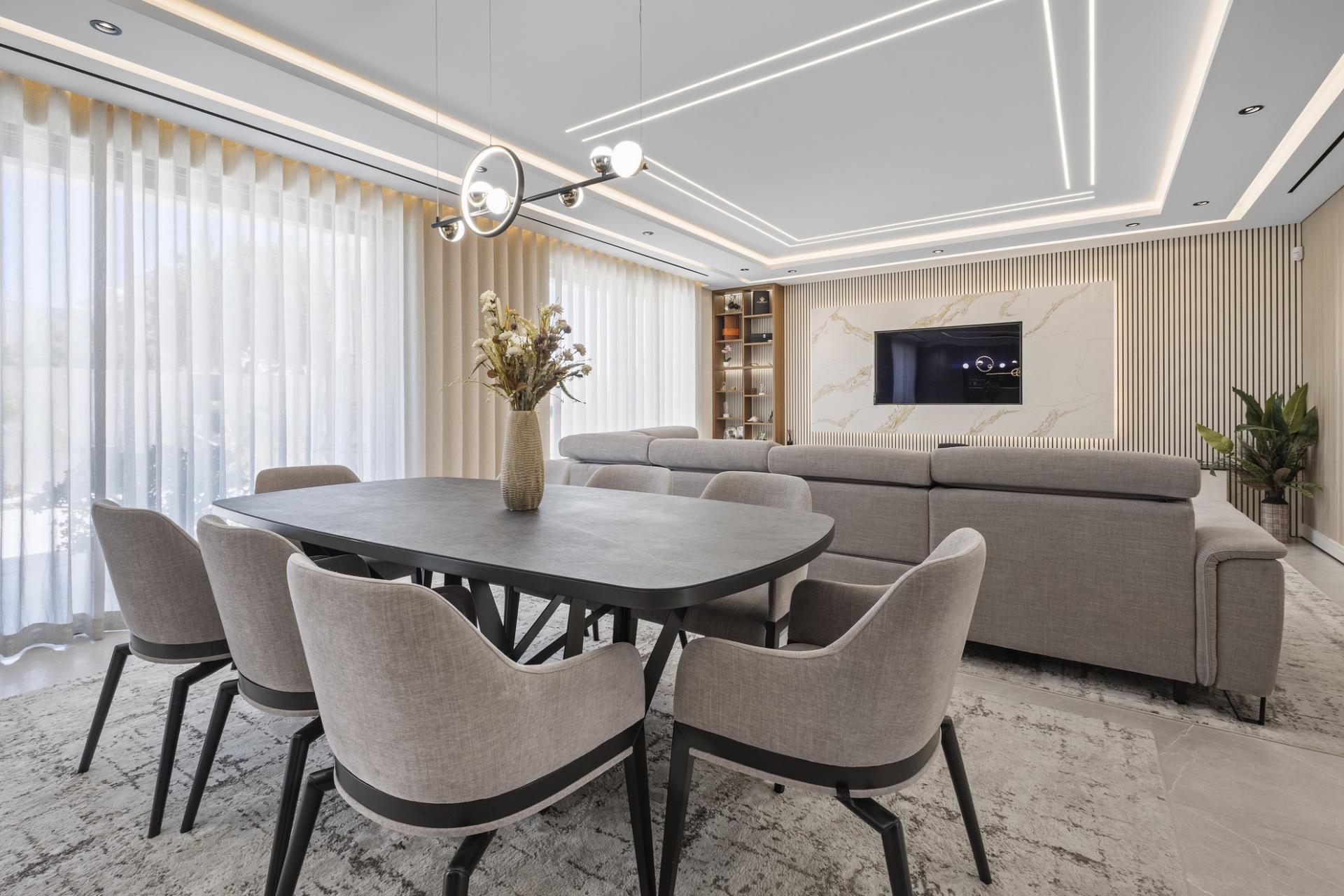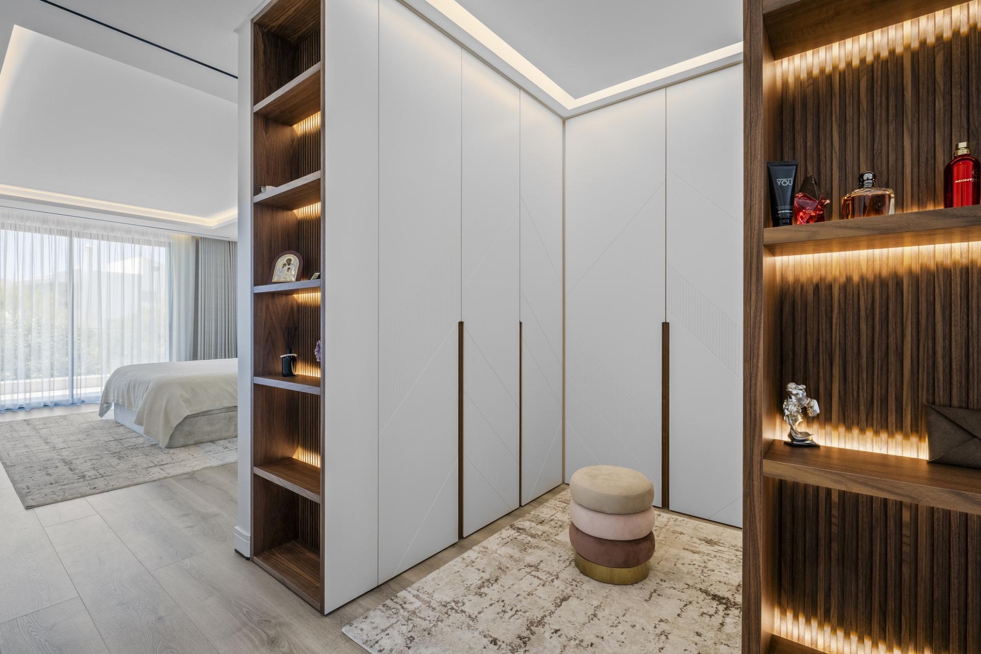 Designed with convenience and security in mind, the villa includes underfloor hydraulic heating powered by a high-efficiency heat pump, air conditioning throughout, and high-spec insulation. Electric shutters and fire-resistant curtains can be individually adjusted, and dimmable lighting helps set the ideal mood in each space. Acoustic glazing, thermal breaks, video intercom, and a reinforced entrance door provide peace of mind.