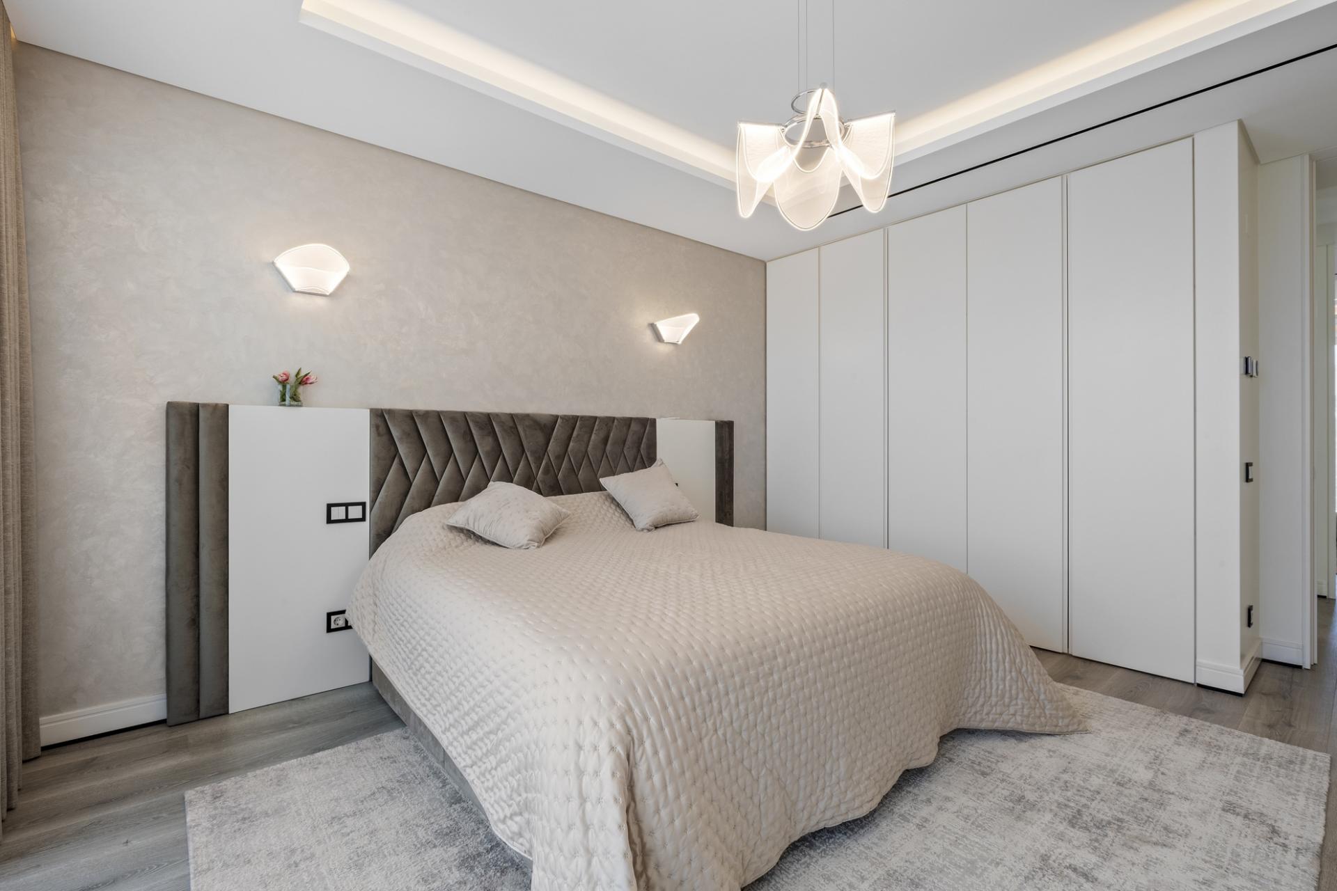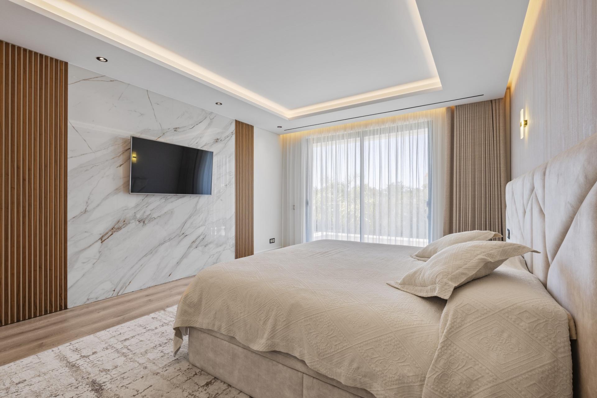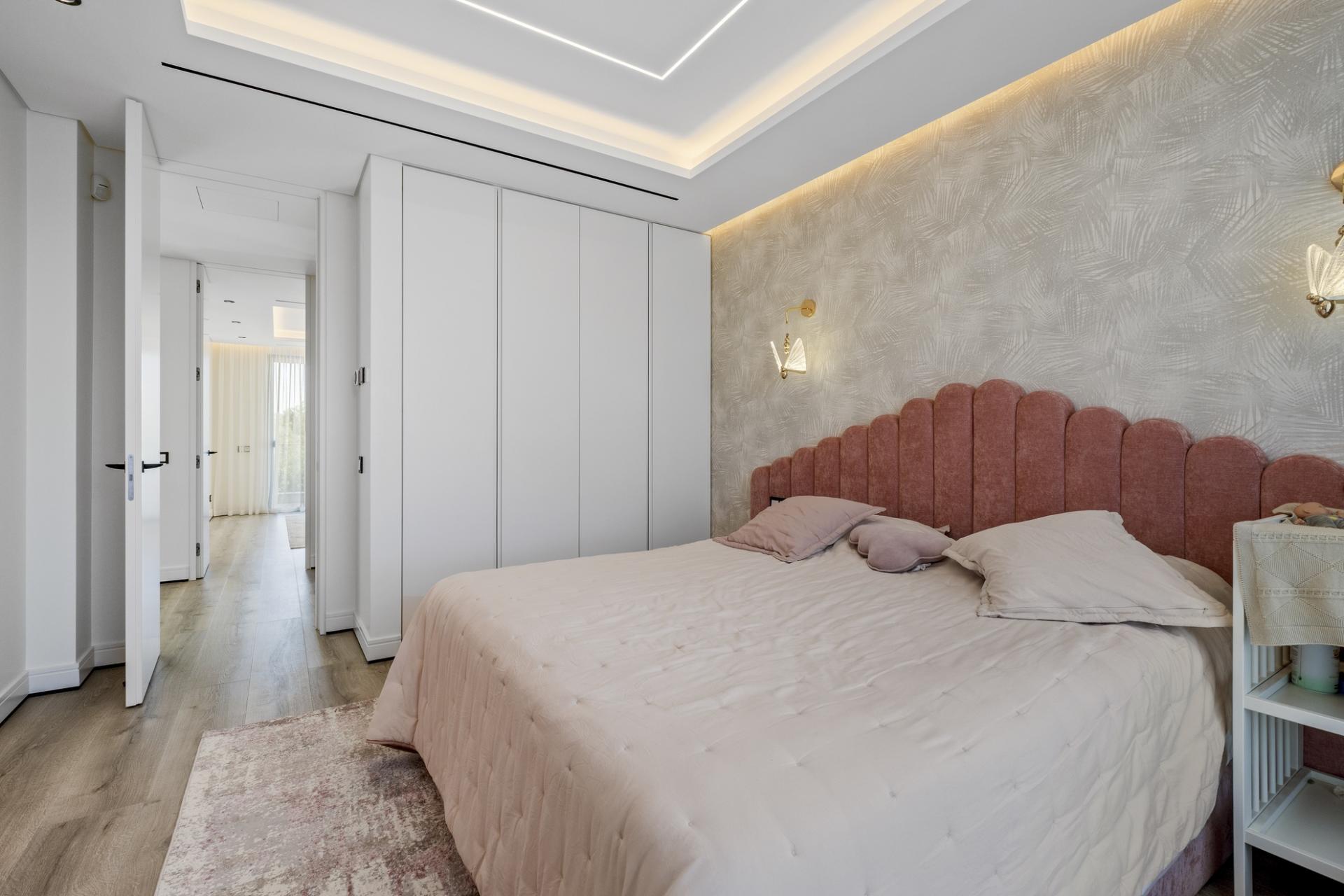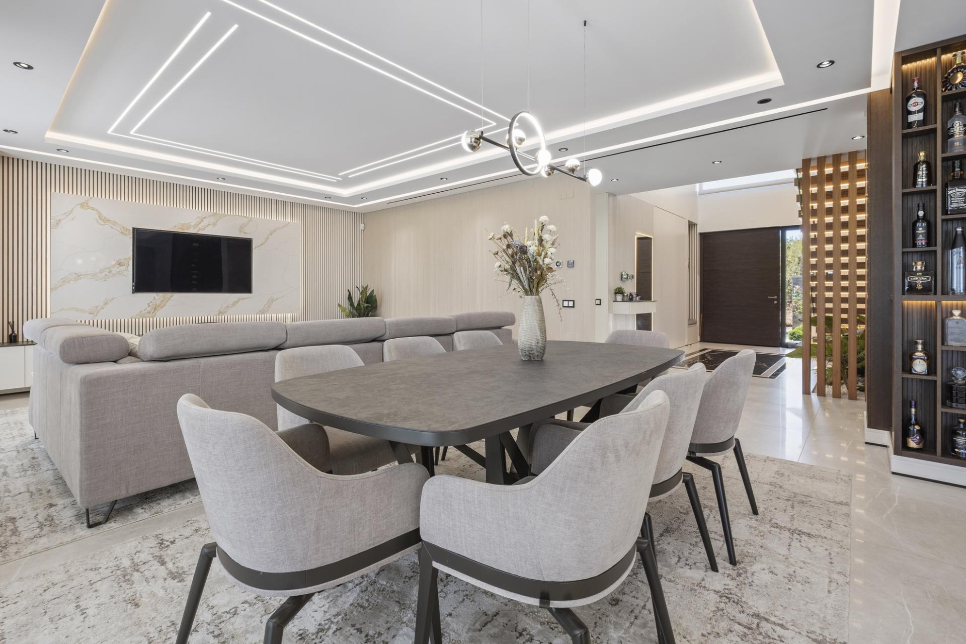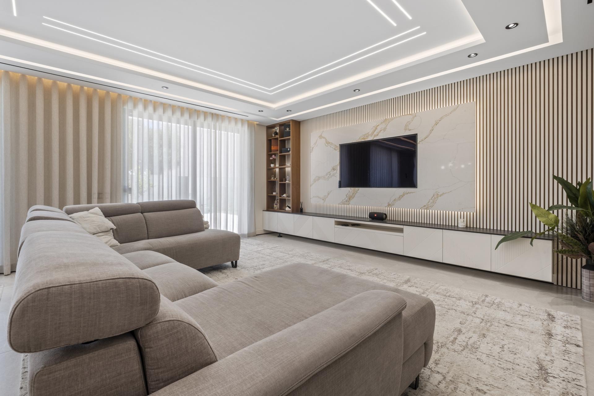 Designed with convenience and security in mind, the villa includes underfloor hydraulic heating powered by a high-efficiency heat pump, air conditioning throughout, and high-spec insulation. Electric shutters and fire-resistant curtains can be individually adjusted, and dimmable lighting helps set the ideal mood in each space. Acoustic glazing, thermal breaks, video intercom, and a reinforced entrance door provide peace of mind.