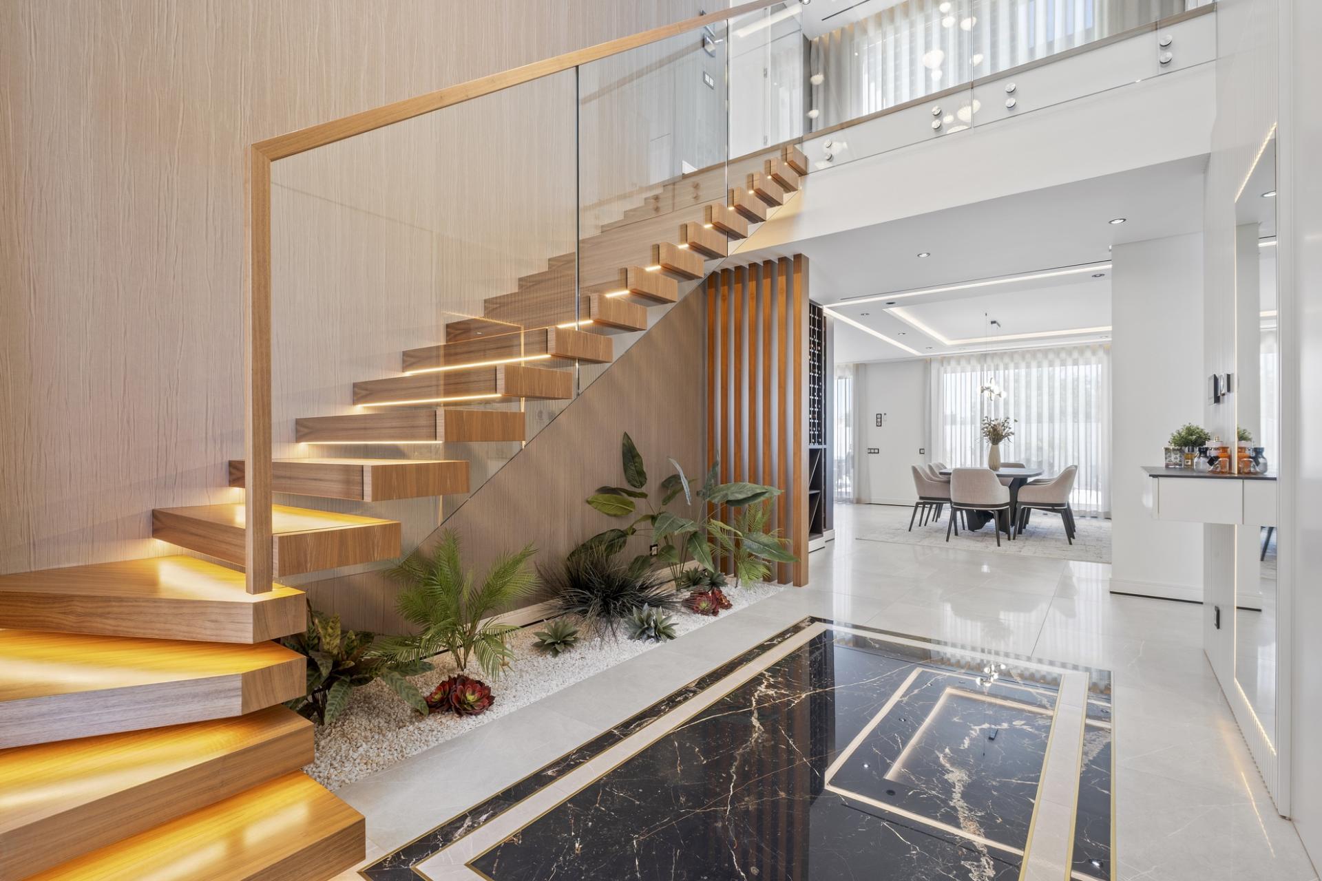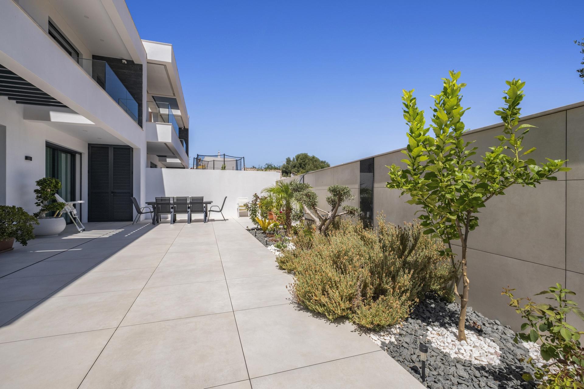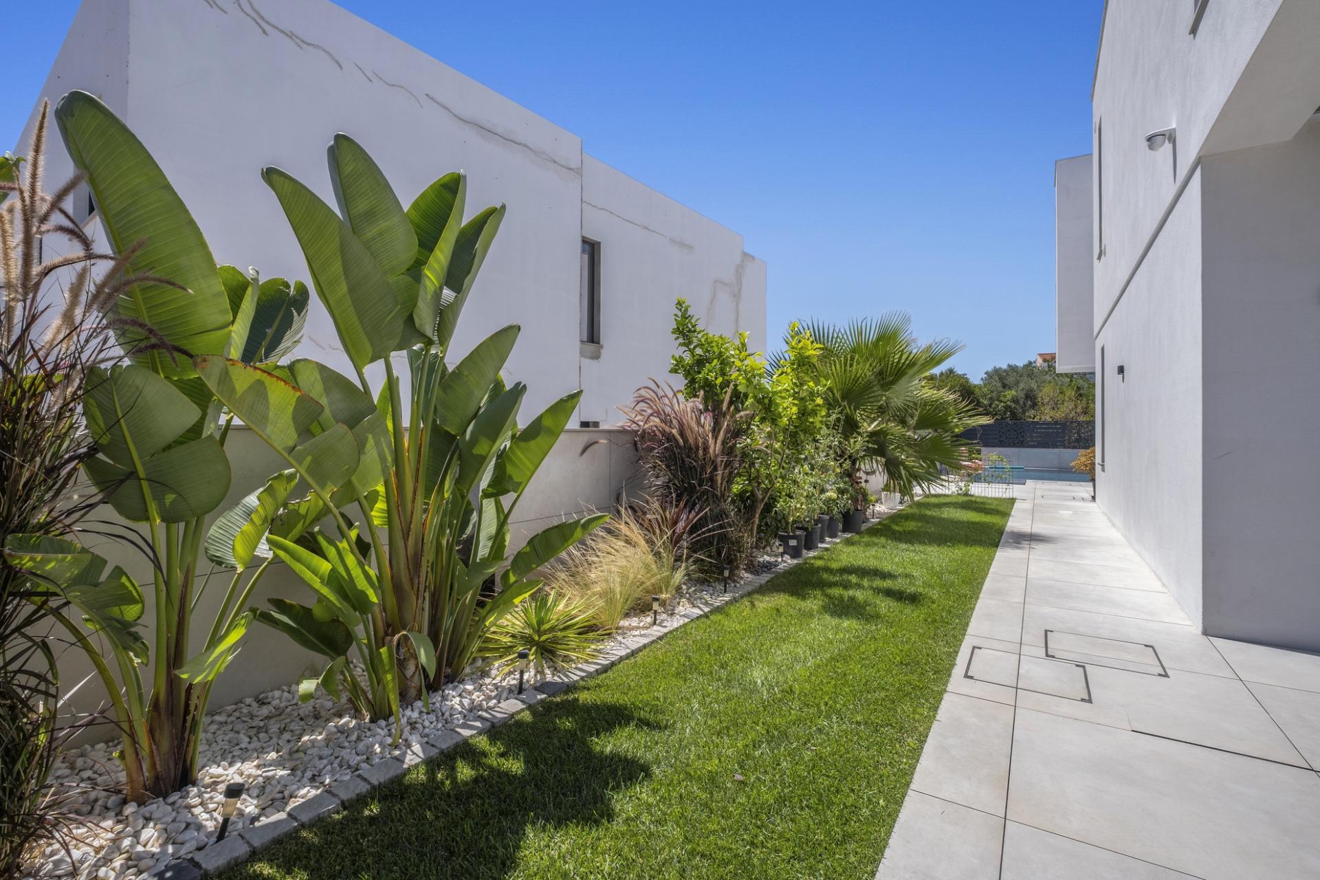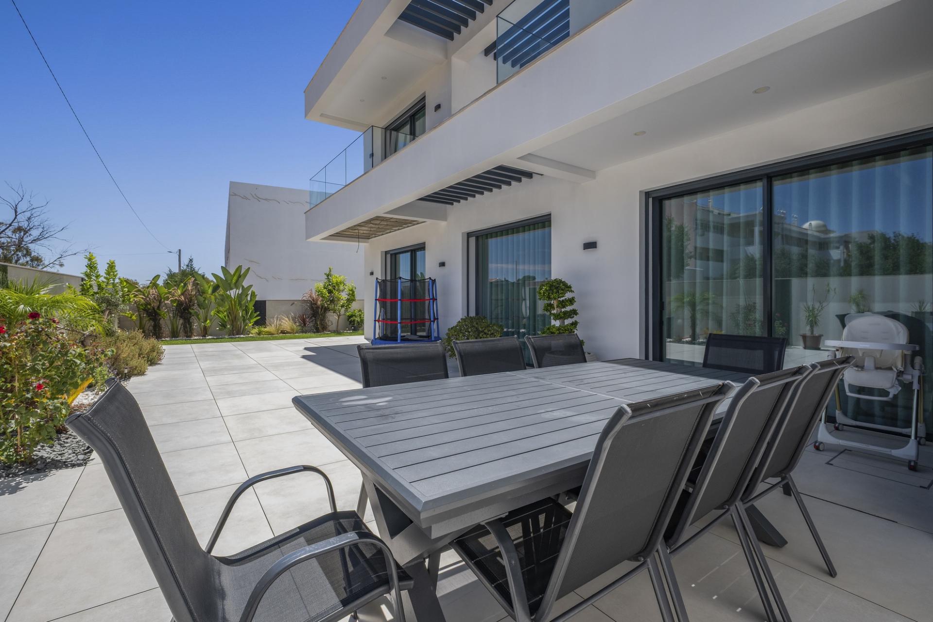 A casa distribui-se por dois pisos e dispõe de uma ampla sala de estar e jantar em open space, com portas deslizantes que dão acesso a um terraço e jardim espaçosos. A cozinha está totalmente equipada com eletrodomésticos premium e armários integrados, e inclui uma lavandaria separada. Os quatro quartos têm roupeiros embutidos e varandas privadas. A suíte principal inclui closet e casa de banho privativa com acabamentos modernos. No rés-do-chão, um quarto adicional com casa de banho de apoio garante versatilidade para hóspedes, escritório ou família.